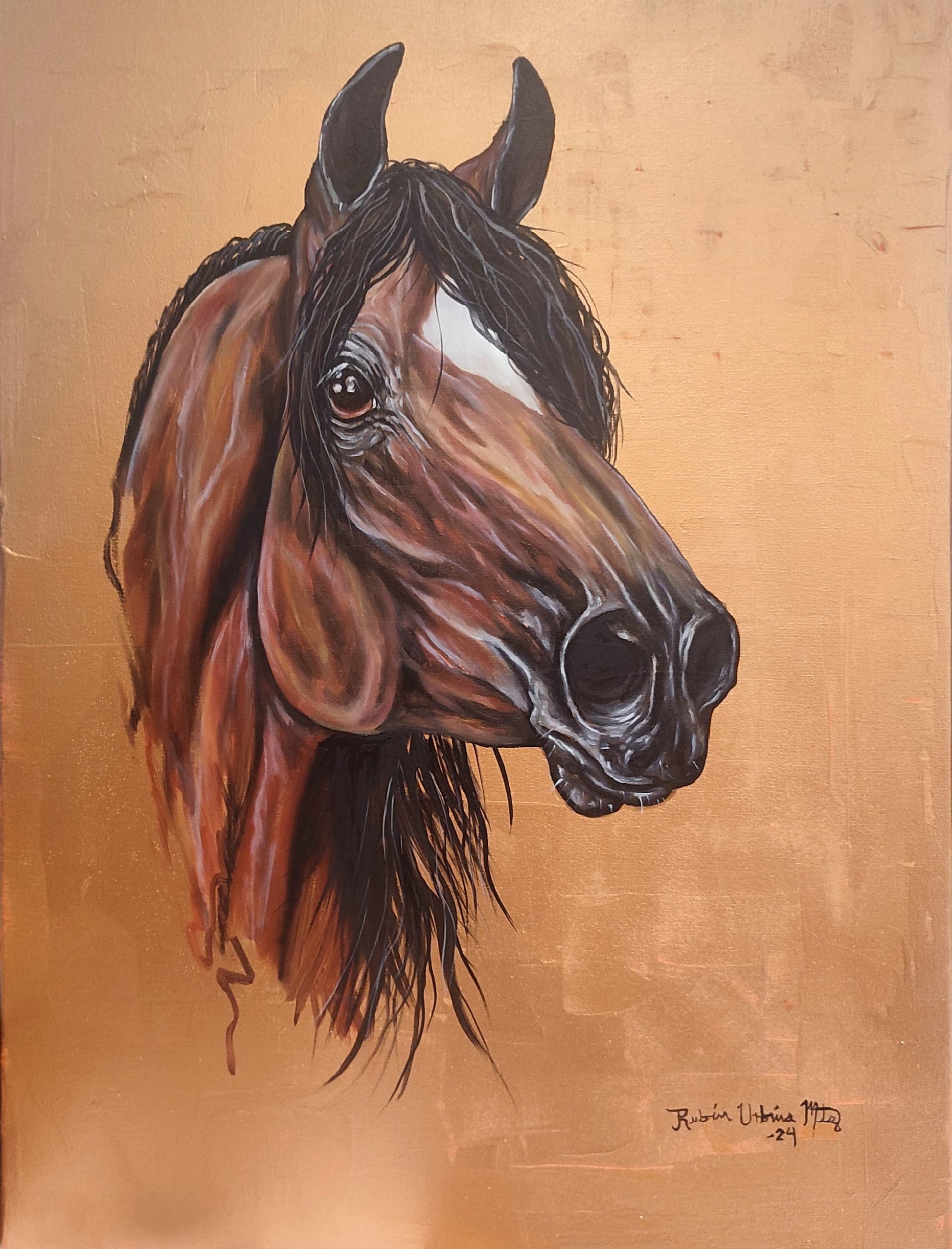 sobre un fondo cobre, nuestro caballo colorado de la raza española nos dirige la mirada con esa expresión de asombro y fuerza propias de estos animales que se enfrentan en los ruedos a toros de lidia con valentía y gallardía.