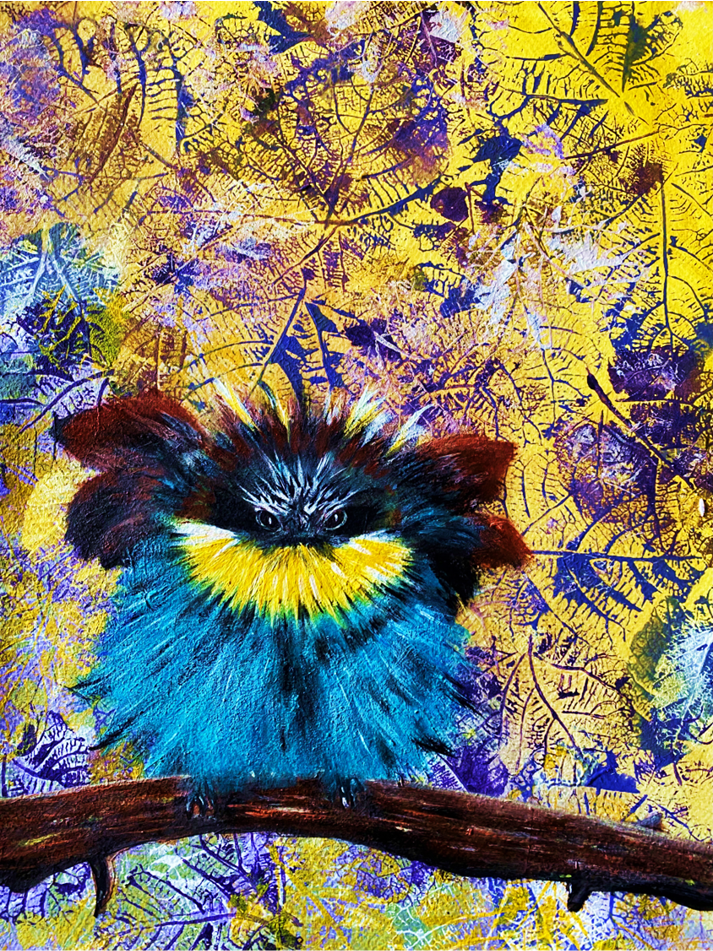 Lo que motiva esta serie es la amalgama entre la impresión colorida de hojas frescas y la transferencia de imágenes de aves; con lo que pretendo reproducir la magia de la naturaleza en el papel o el lienzo y trasladarla a la mirada de quien decida tener a su alcance cotidiano un pedacito de realidad.