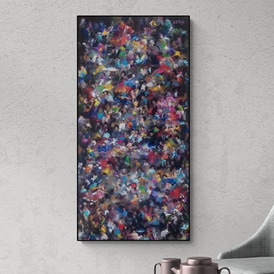 Espectadores de la vida es una obra en la que se aprecian muchas personas, algunas definidas, otras que se desvanecen entre la multitud. Representa una escena de la vida, en la que cada uno de nosotros es espectador de otras vidas.