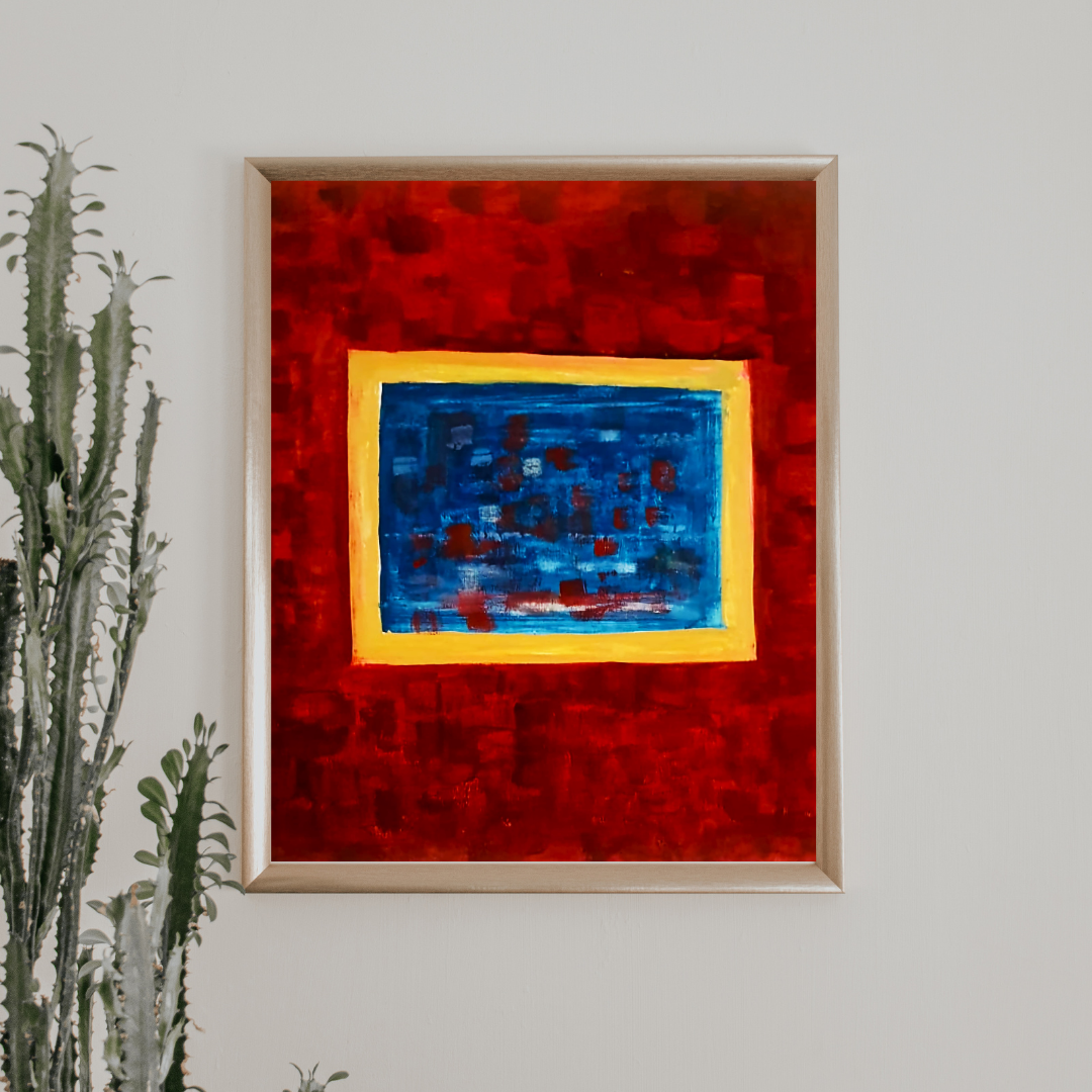 Colores llamativos y contrastes geométrico se unen en esta pieza abstracta, evocando la idea de reflexión y profundidad, invitando al espectador a explorar la sensación de un mundo interior de formas y emociones ocultas bajo la superficie.
