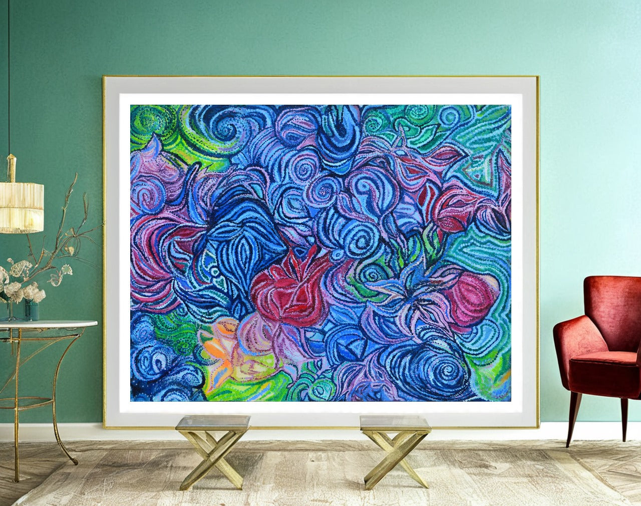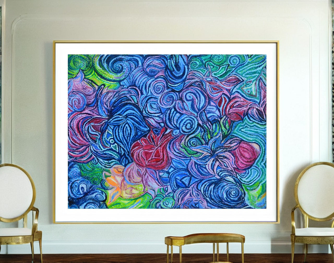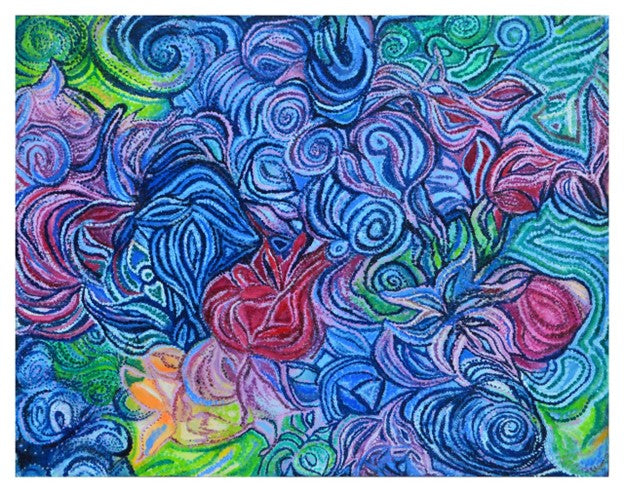 En la pintura, las flores podrían parecer suspendidas en el aire, como si estuvieran atrapadas en un instante de un soplo de viento. Las líneas suaves y curvas que representan el vaivén del viento recorren la obra, guiando la vista a través de un paisaje onírico en el que las flores parecen bailar al compás de una melodía invisible. El uso de colores vivos y contrastantes evoca la energía y vitalidad del viento, mientras que las pinceladas puntillistas aportan una sensación de movimiento y textura, haciendo que la obra parezca cobrar vida ante los ojos del espectador.