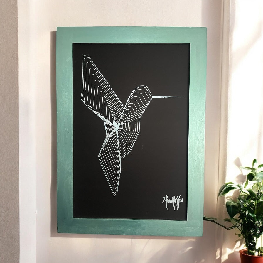 Pintura en acrílico metálico y marco en MDF en color menta brillante. 74 cm de base por 1.04 cm de altura. Este colibrí trae el mensaje del espíritu: somos energía que vibra a través de las experiencias para evolucionar hacia nuevas dimensiones.