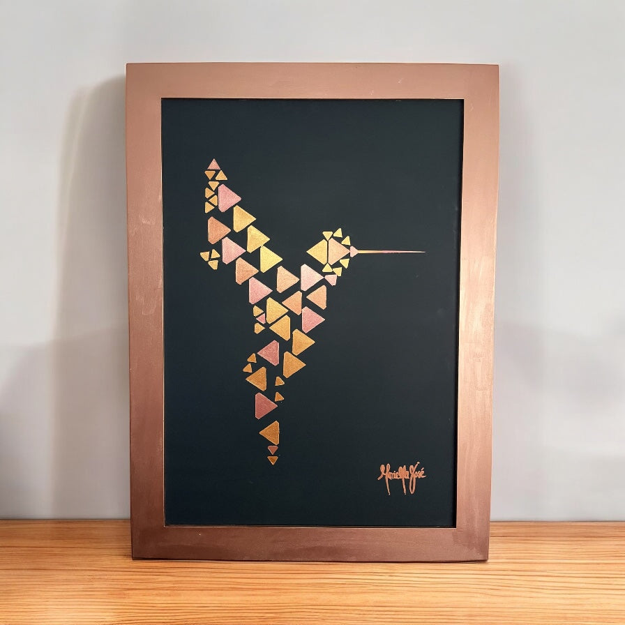 Pintura en acrílica metálico y marco de MDF en cobre. 74 cm de base por 1.04 cm de alto.