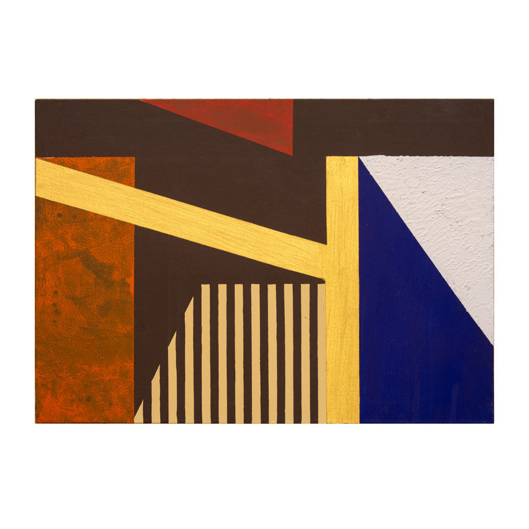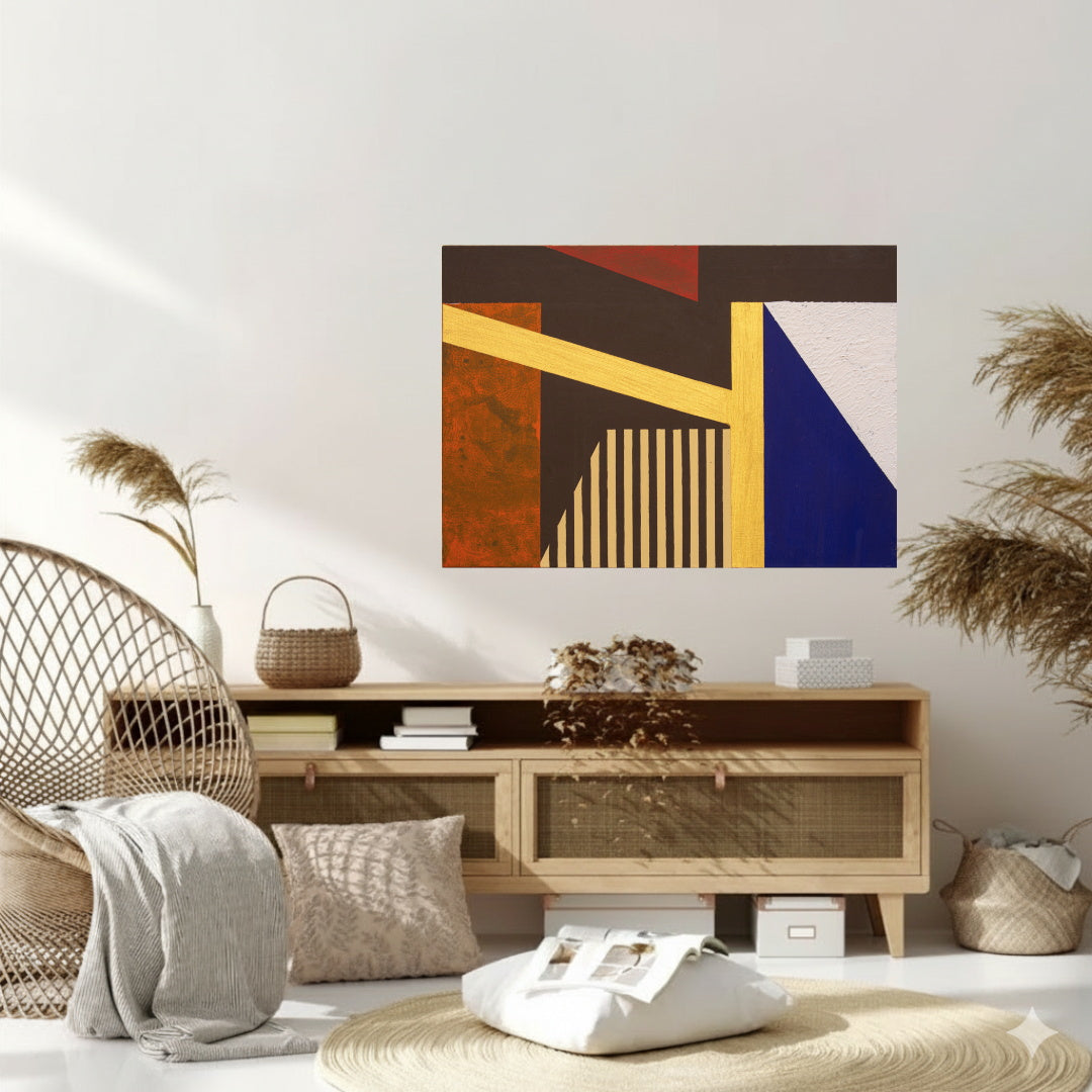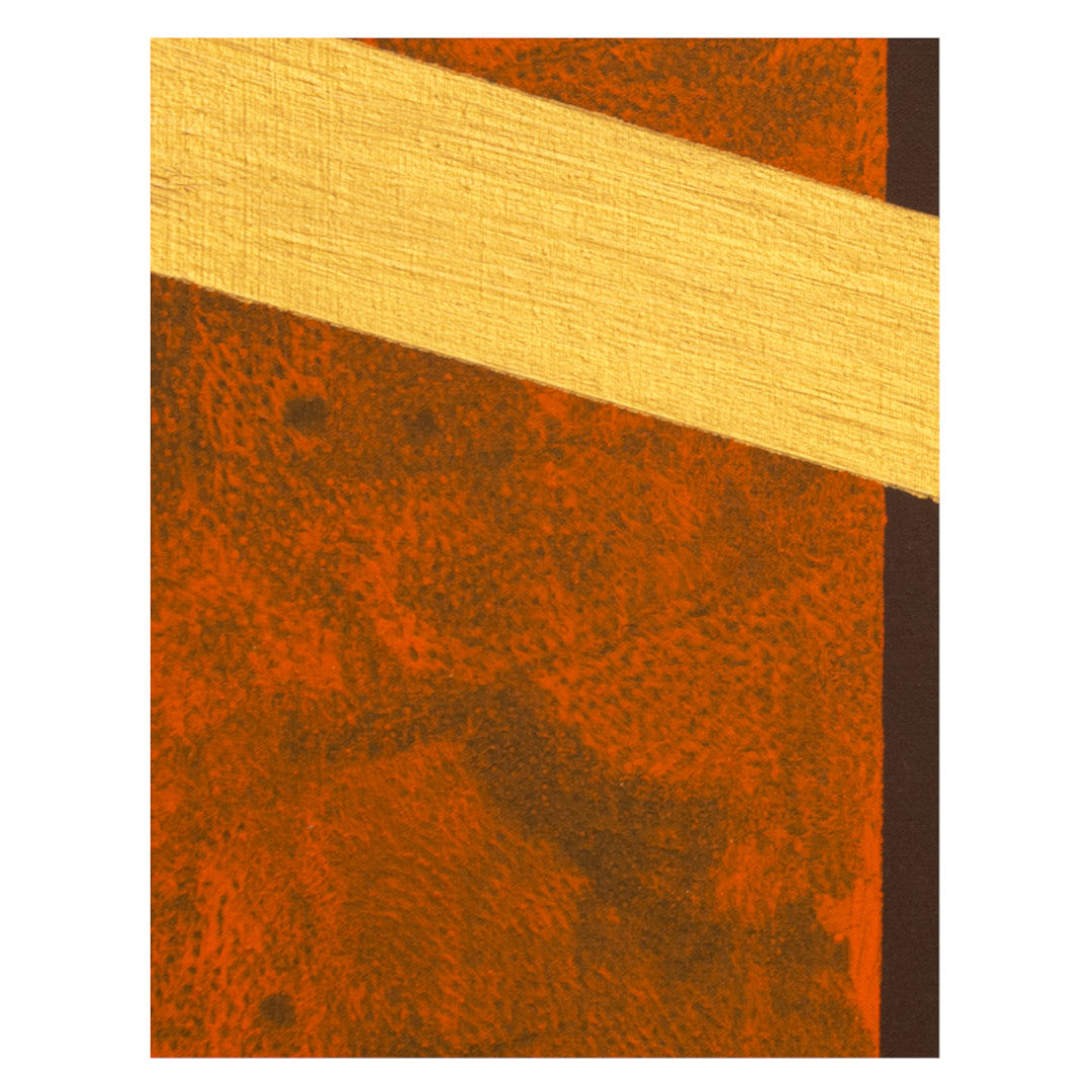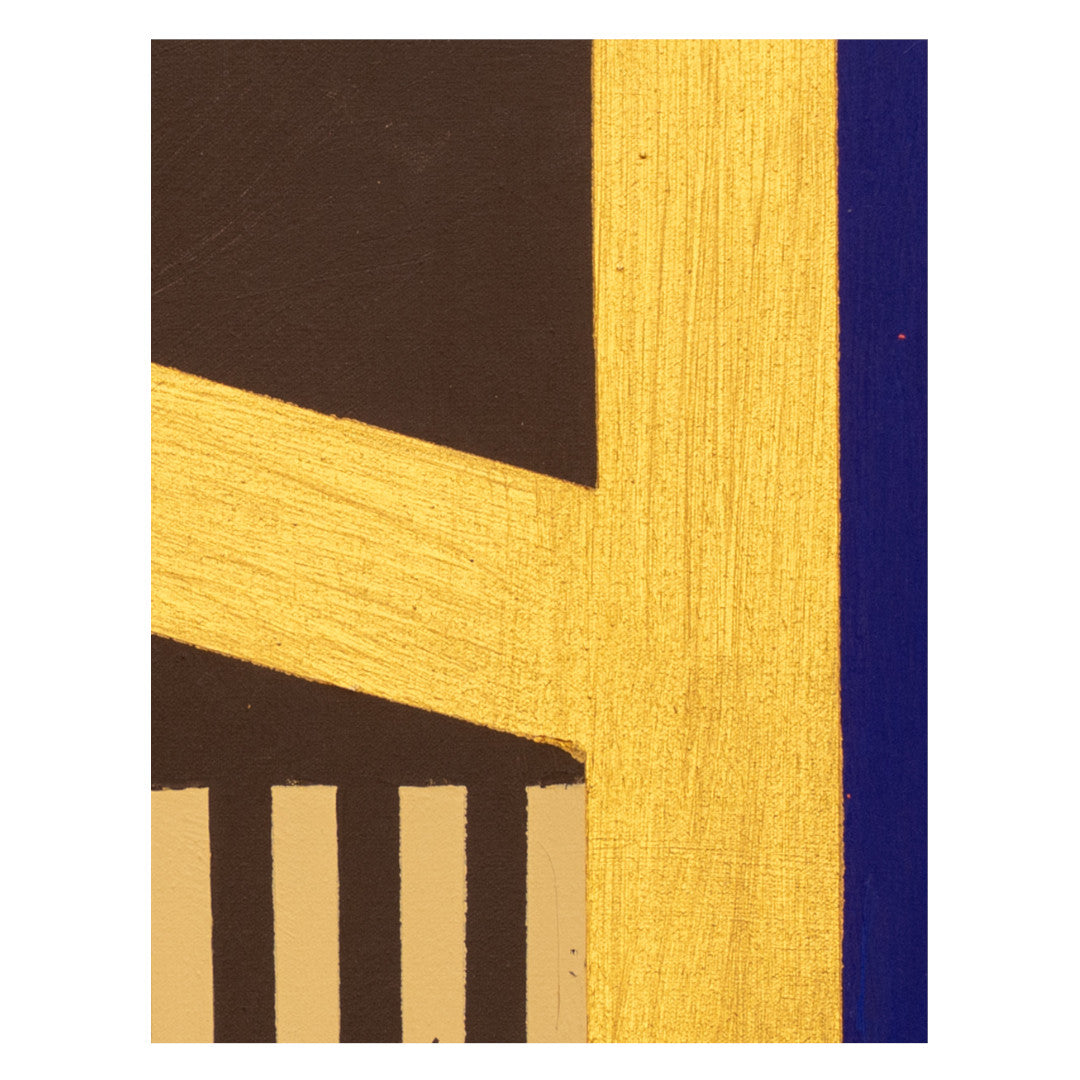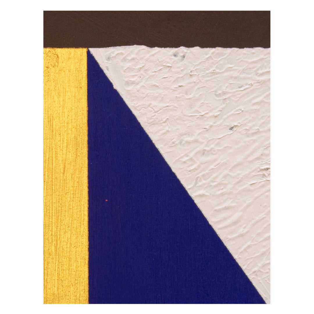 Ah, la vibración del color y la arquitectura del alma. Aquí, la oscuridad del fondo, ese marrón profundo, no es ausencia, sino la base primordial. Observo la tensión dinámica de la viga dorada que atraviesa el espacio, una flecha de luz que divide y conecta, un camino que no lleva a ningún lugar en particular, sino a la experiencia misma. El naranja óxido, con su textura rugosa, es tierra y tiempo condensados, un recuerdo de la existencia que contrasta con la pureza del triángulo rojo, que se retira, sutil pero presente, como una emoción distante. Luego, el azul royal, rotundo y firme, se alza como un pilar, una estructura sólida que ancla la composición. A su lado, el blanco empastado, casi una pared, introduce una aspereza necesaria, una topografía táctil que invita a la mano a sentir. Y esas rayas verticales, como un ritmo callado, una partitura visual que sugiere una ventana o un velo, aportando un orden subyacente a la aparente espontaneidad.