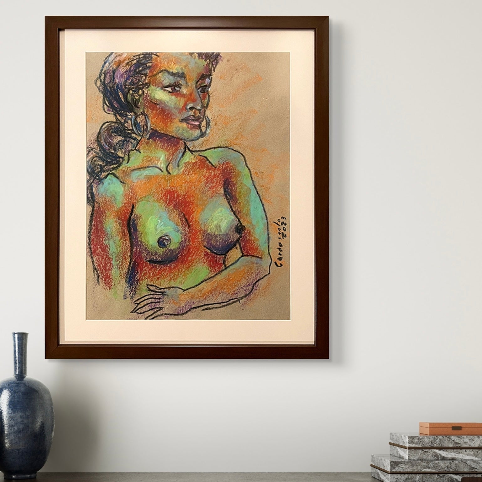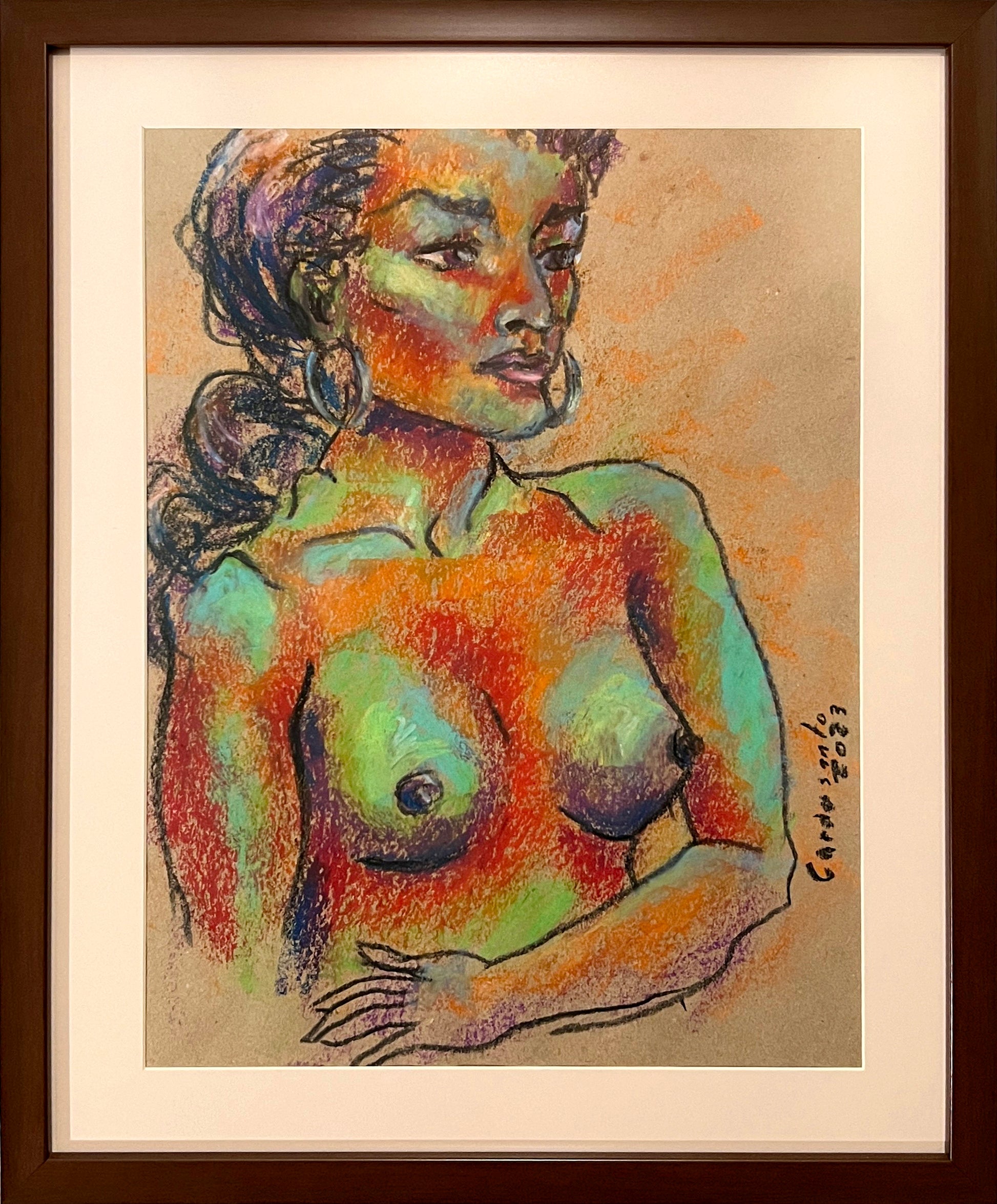 La obra muestra coloridos contrastes que construyen anatomía humana resaltando el volumen y la belleza del cuerpo humano por medio de sesiones con modelo desnudo.