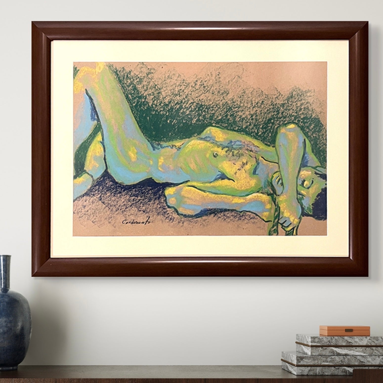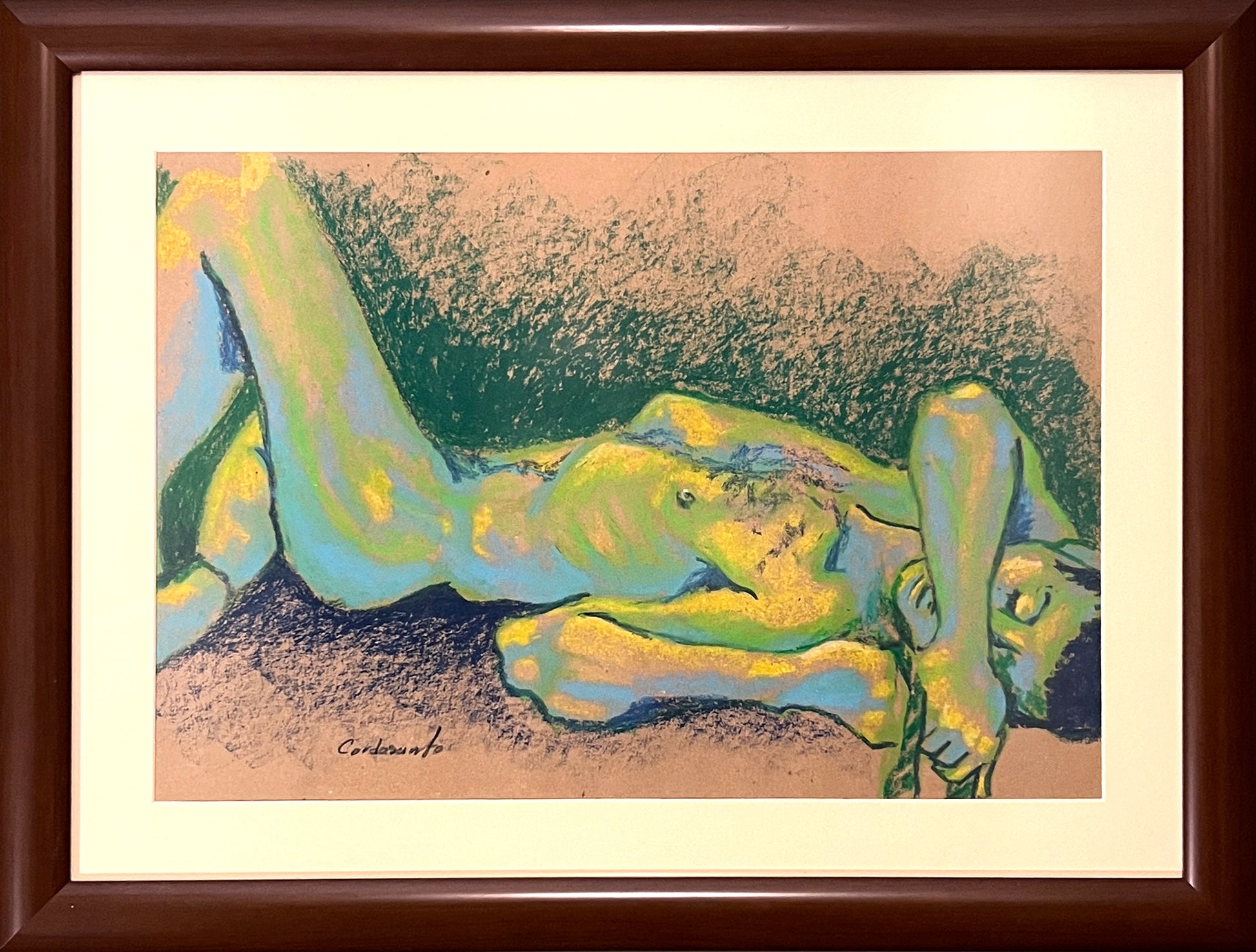 La obra muestra coloridos contrastes que construyen anatomía humana resaltando el volumen y la belleza del cuerpo humano por medio de sesiones con modelo desnudo.