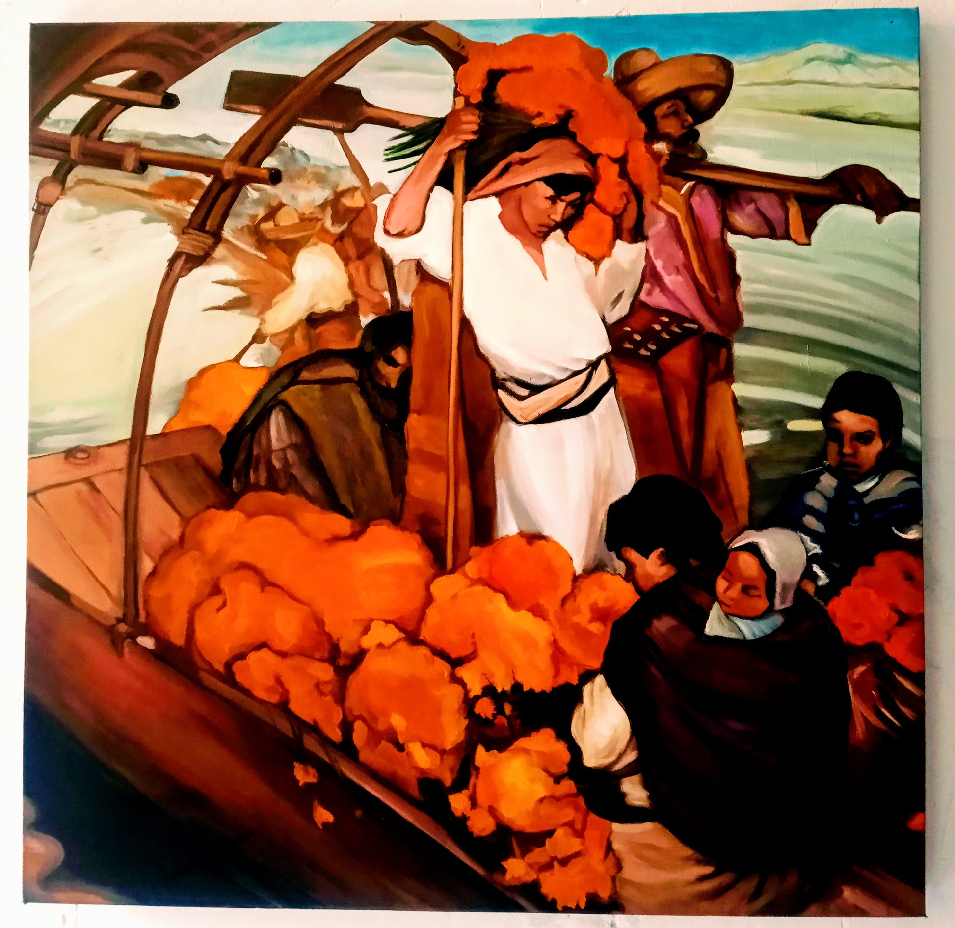 Es una réplica de la obra iconográfica de Saturnino Herrán en el cual retrata de manera sutil a una familia en una trajinera con flores de cempasúchil. Saturnino Herrán es uno de los artistas mexicanos mas importantes del S. XX.