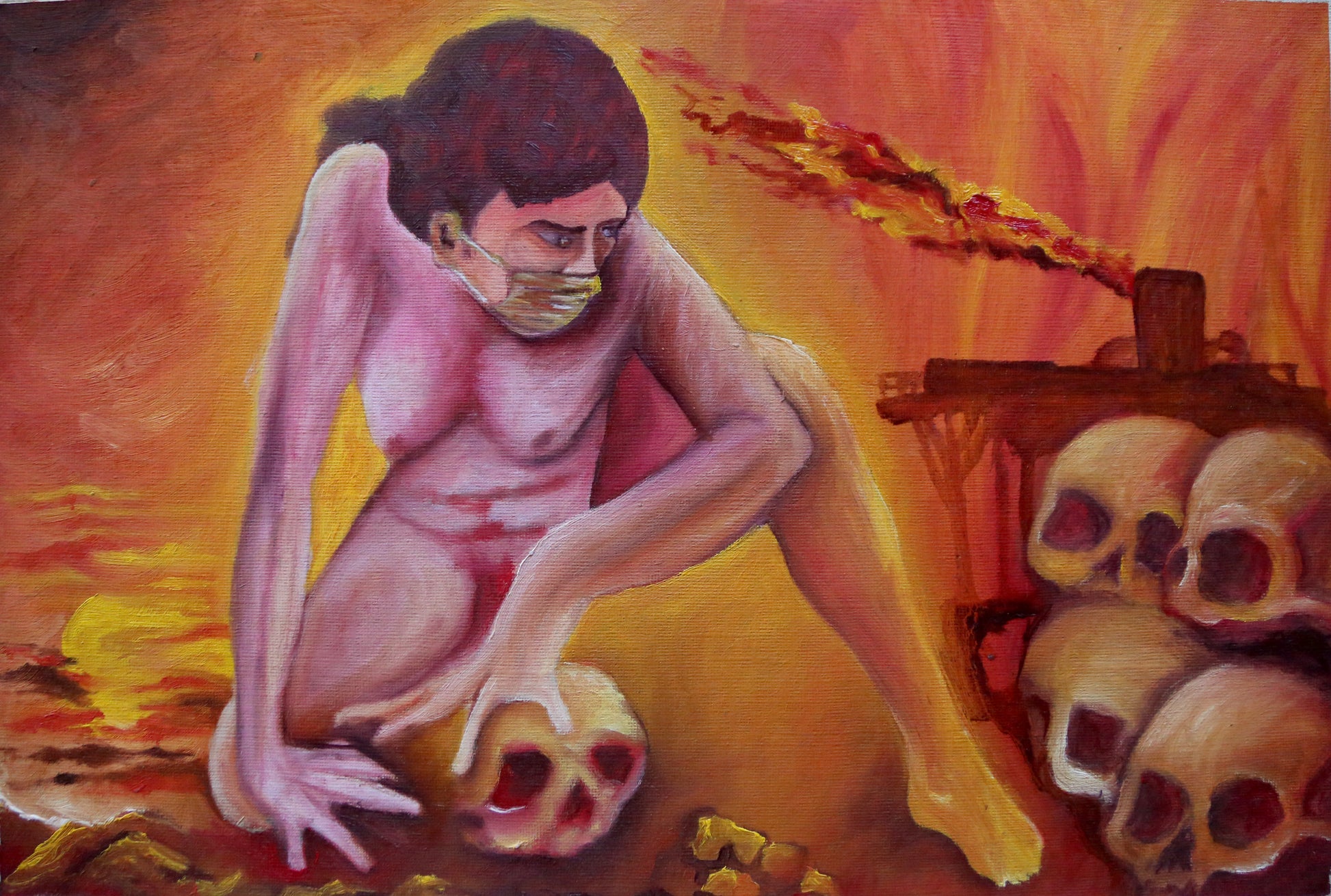 En "Estudio para La caída", Hernández Soto utiliza una paleta de colores ocres, rojizos y sordos para crear un ambiente lúgubre y sombrío, pero brillante. La composición presenta un desnudo femenino con cubrebocas, aludiendo a la pandemia de COVID-19, en un paisaje rojizo con una plataforma petrolera al fondo y cráneos en primer plano. Estos elementos simbolizan la pérdida de la inocencia y la confrontación con una realidad brutal.