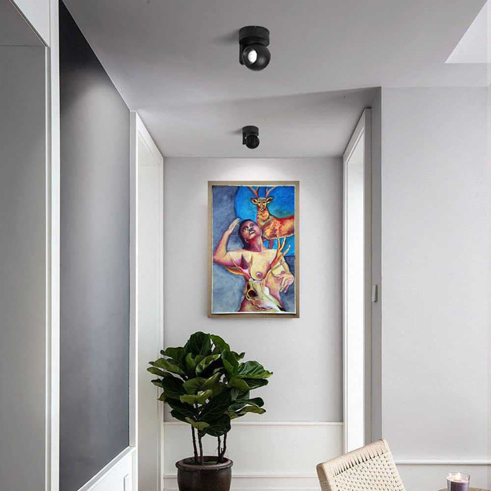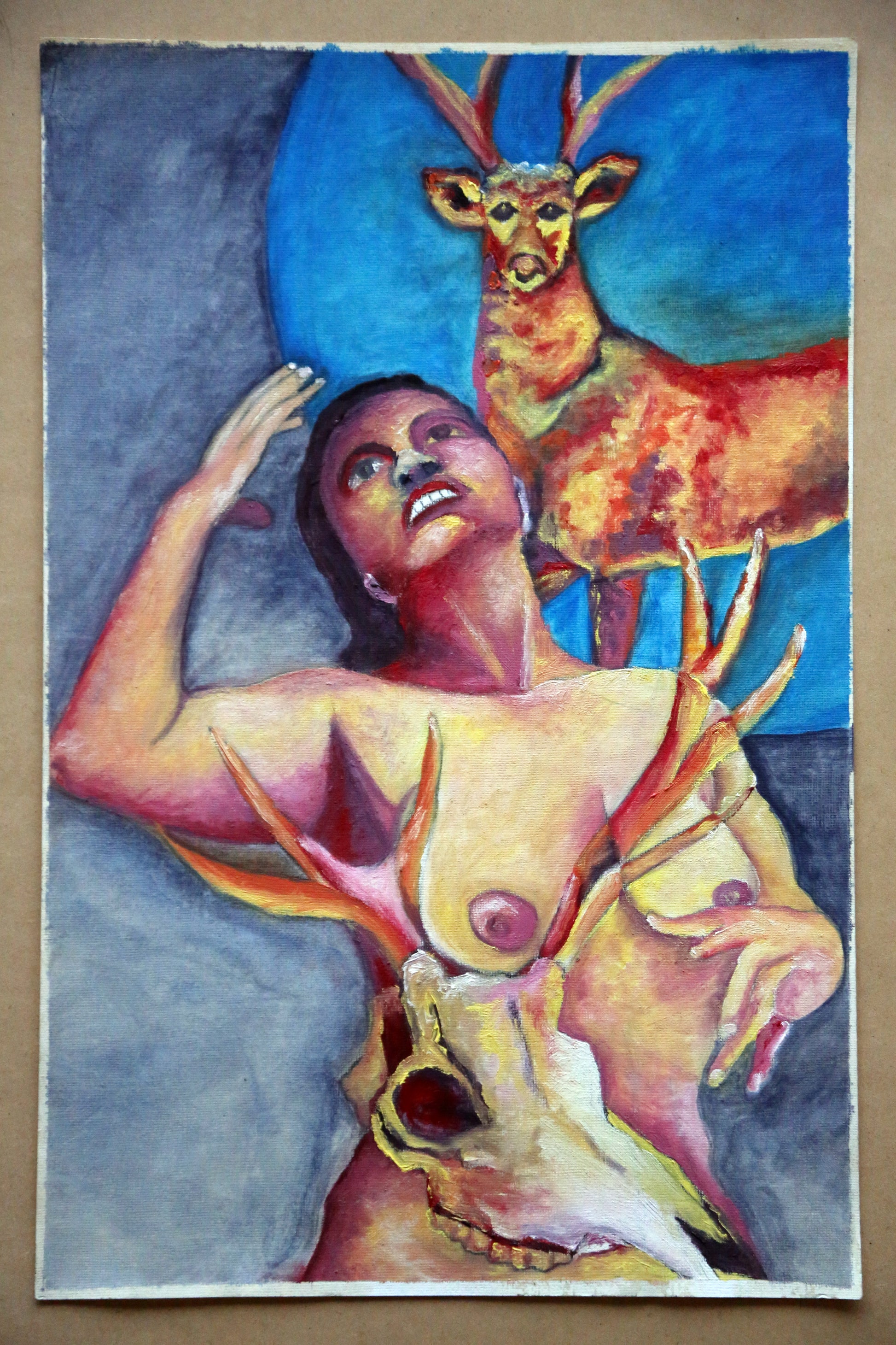 La obra presenta una figura femenina en proceso de transformación, fusionándose con características de un venado. Este proceso de cambio sugiere una conexión profunda y simbólica con la naturaleza, donde la mujer adquiere la esencia y los comportamientos del venado, un animal asociado con la gracia, la agilidad y la conexión espiritual en muchas culturas indígenas.