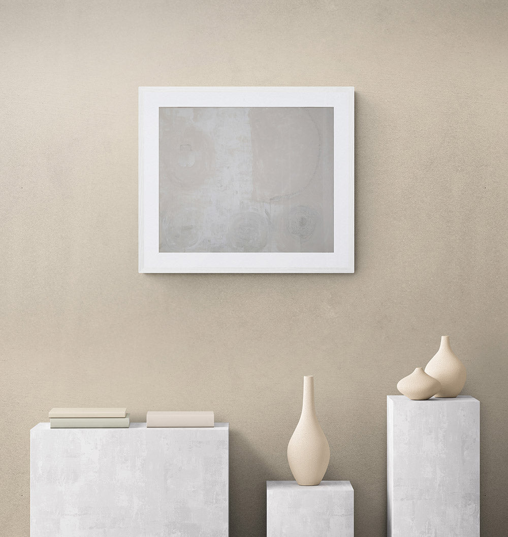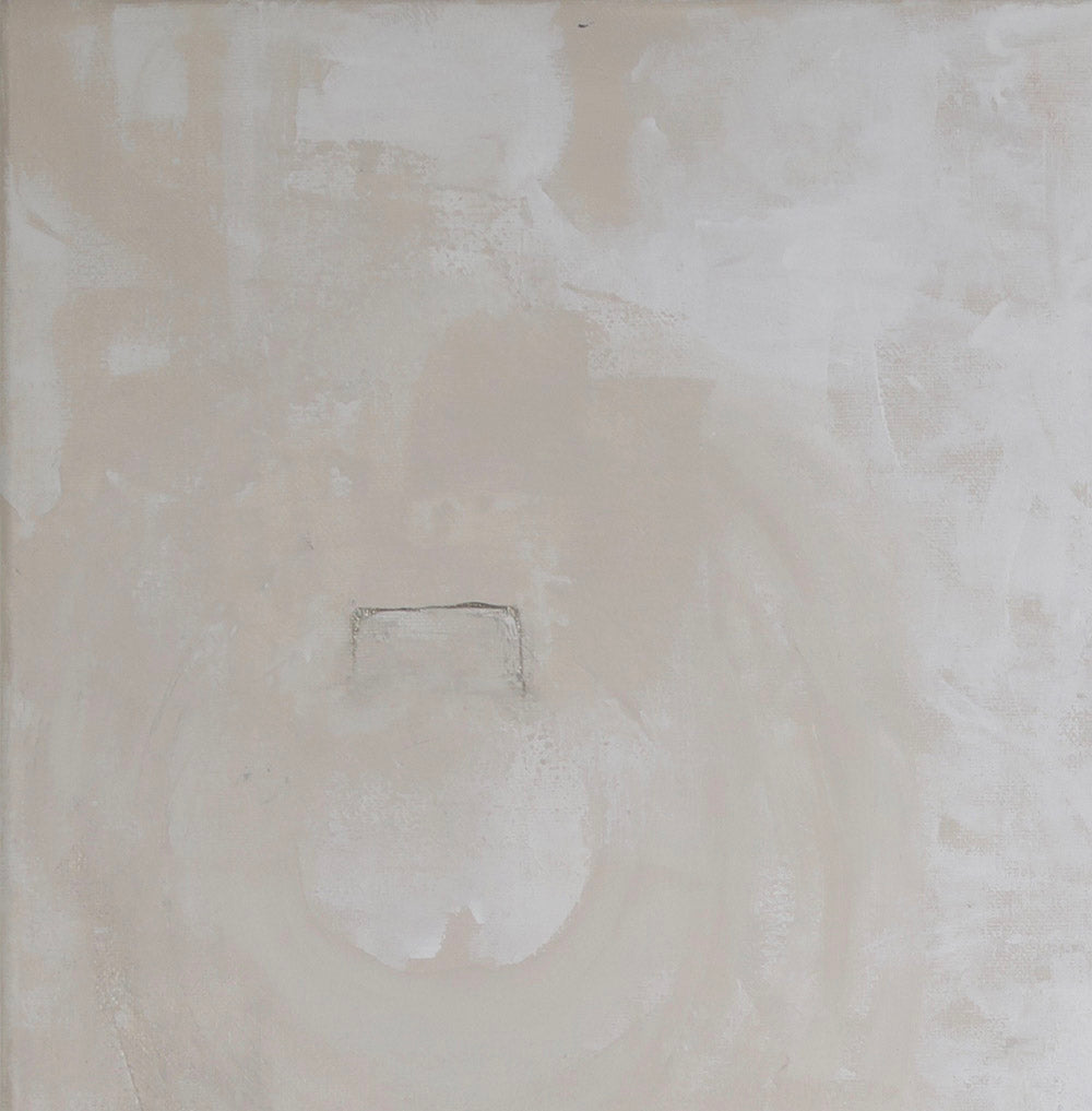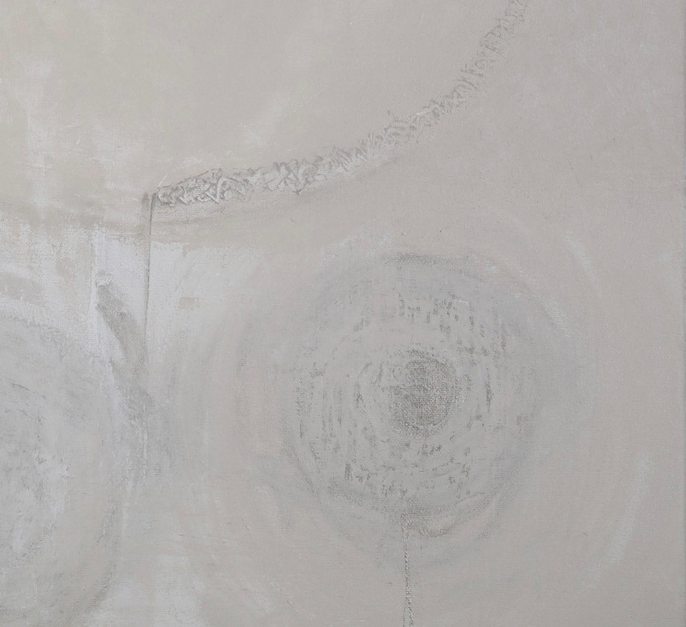 El lienzo habita una superficie etérea que sugiere la fragilidad de un paisaje suspendido en la quietud de la blancura.