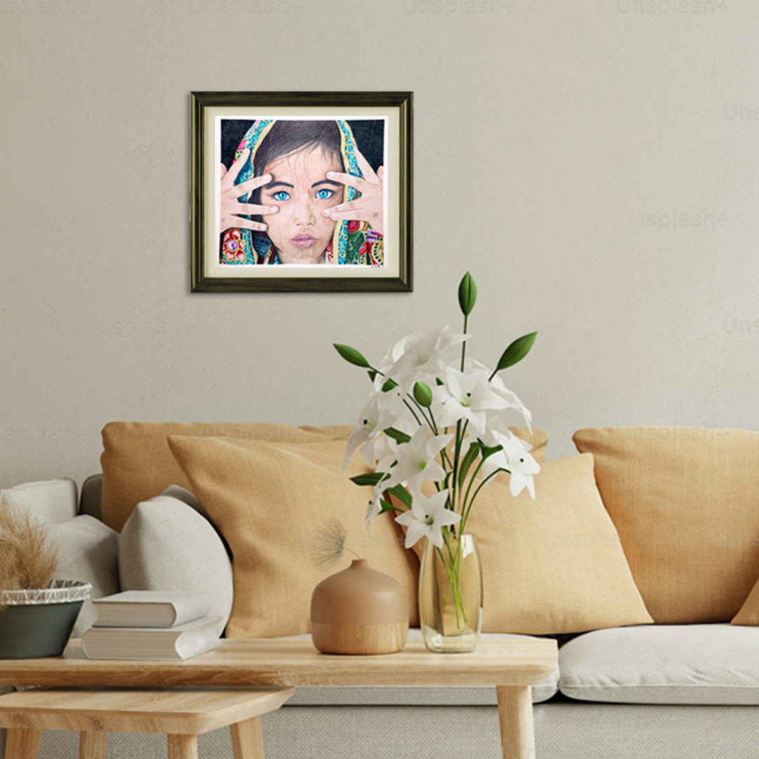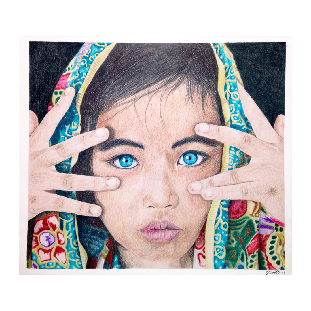 Ilustración realista en lápices de colores de niña de Medio Oriente. Las medidas no incluyen margen o María Luisa. Listo para enmarcar a tu gusto.