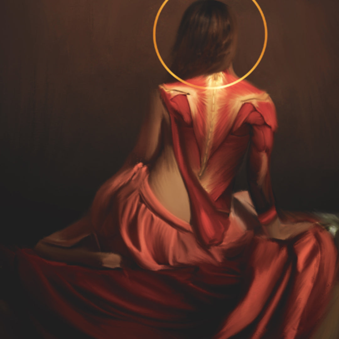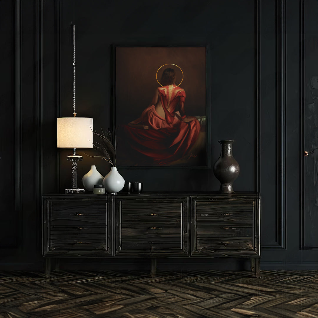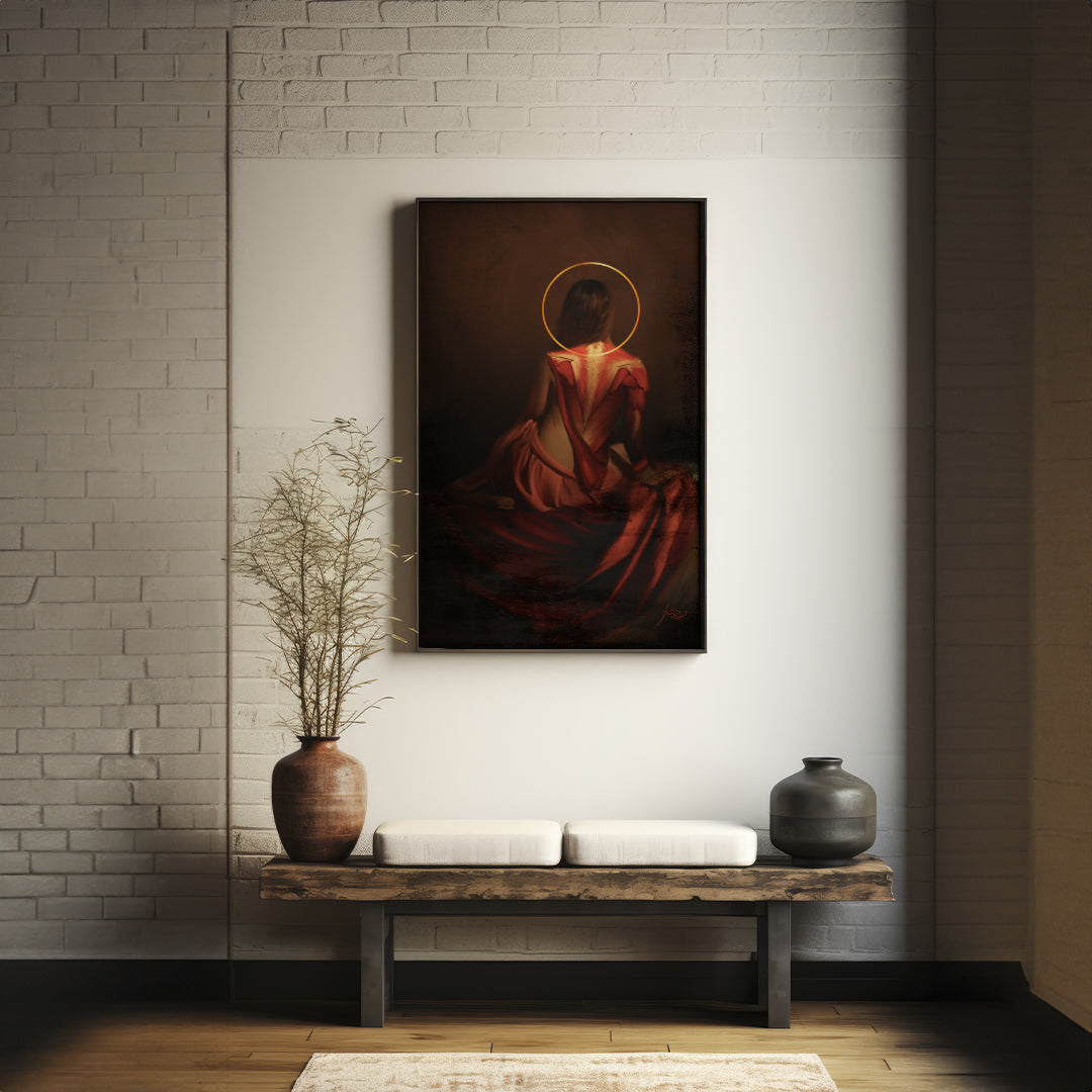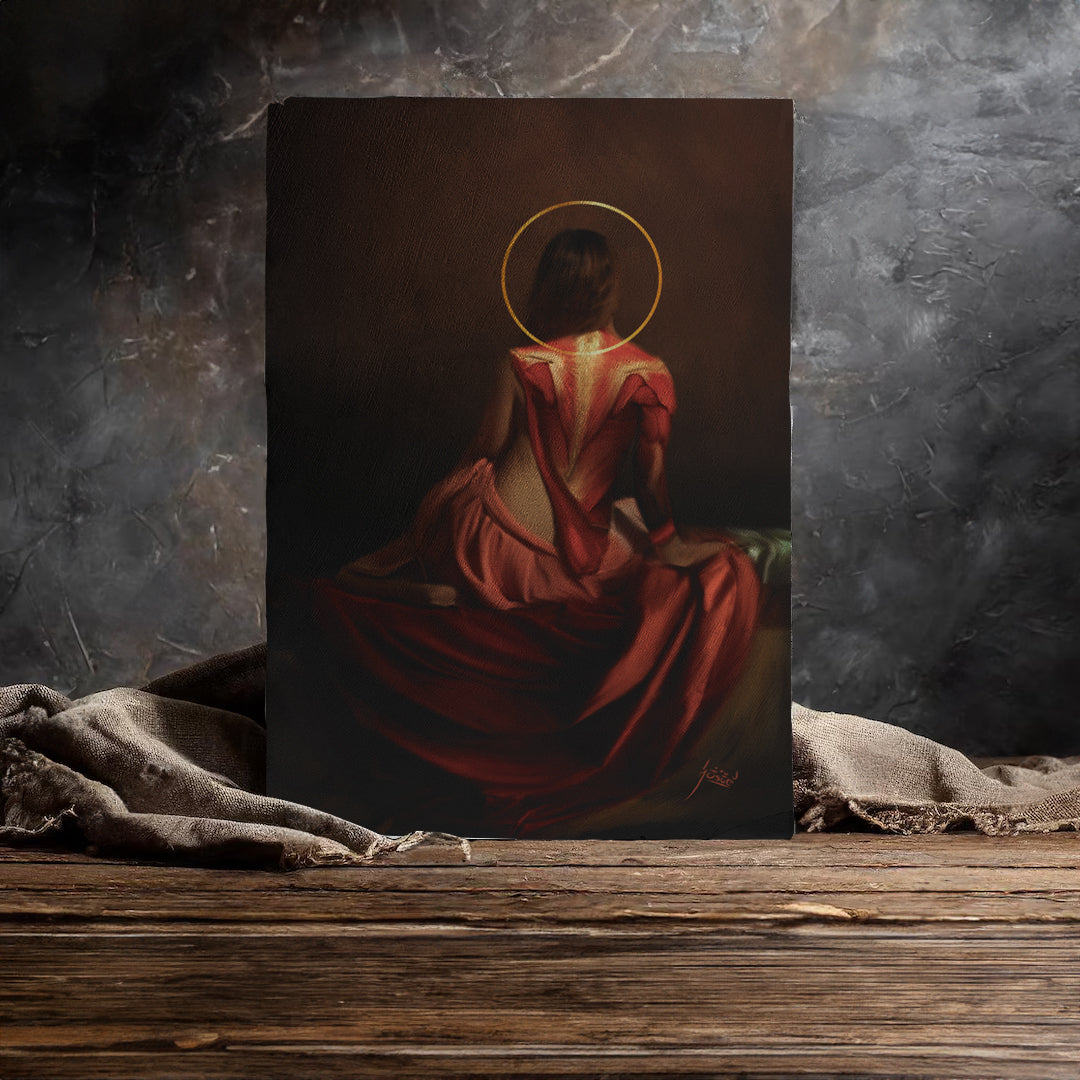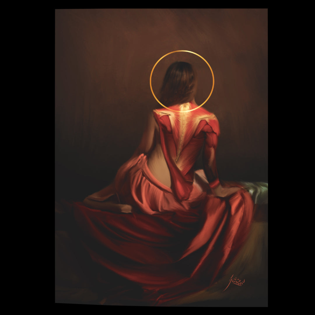 En esta obra, inspirada en el estilo Rembrandtiano, se presenta a la Reina blanca del ajedrez en un momento de calma antes de la batalla. La figura, parcialmente descarnada, muestra su espalda expuesta, con los músculos delicadamente delineados como si revelaran una fuerza interior latente. La Reina está sentada de perfil, envuelta en una atmósfera oscura y lúgubre, con un halo dorado sobre su cabeza que simboliza su posición privilegiada y su importancia en el juego.