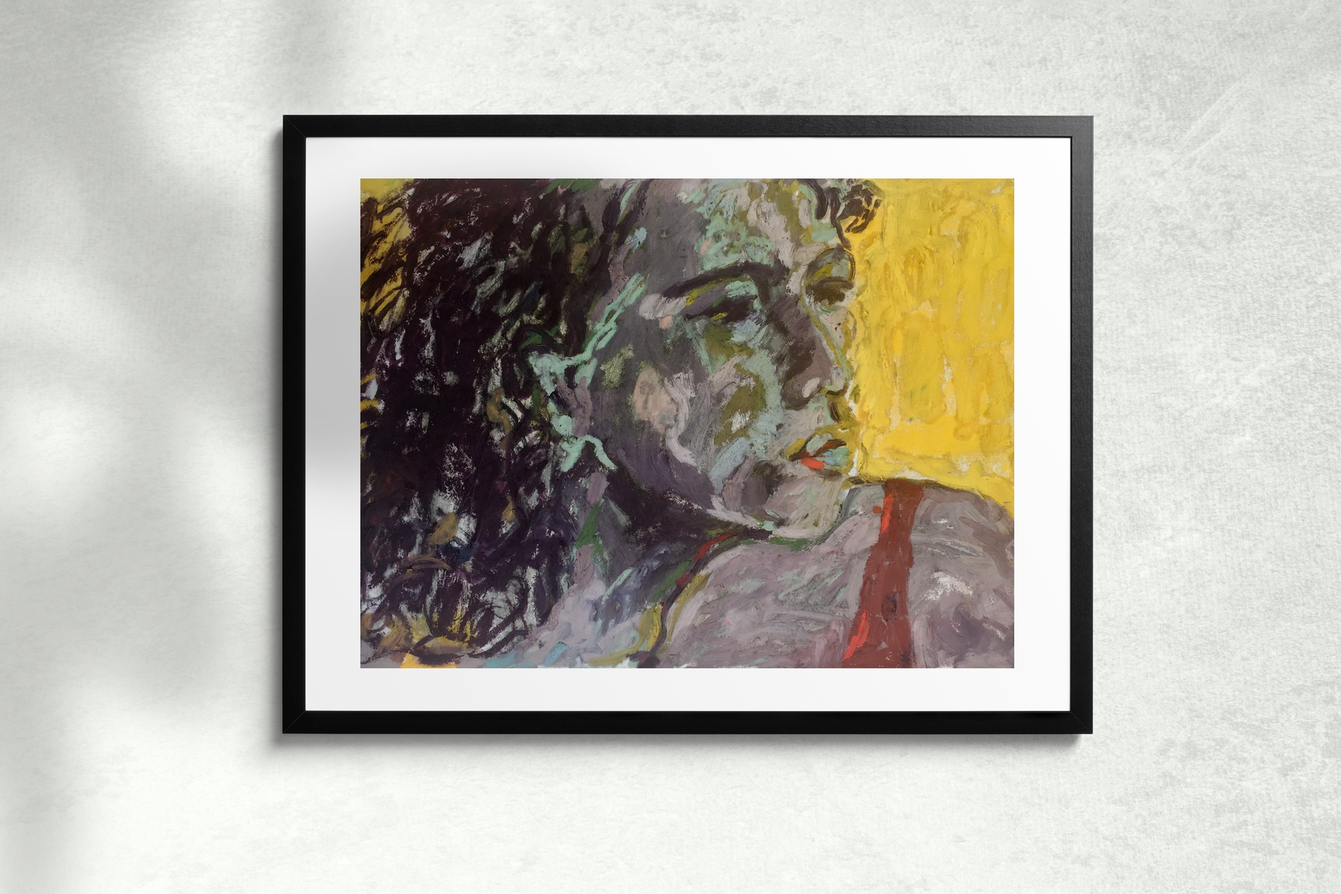 El perfil emerge con fuerza contra un fondo luminoso. Una tensión entre serenidad y vitalidad convierte la figura en presencia contenida.