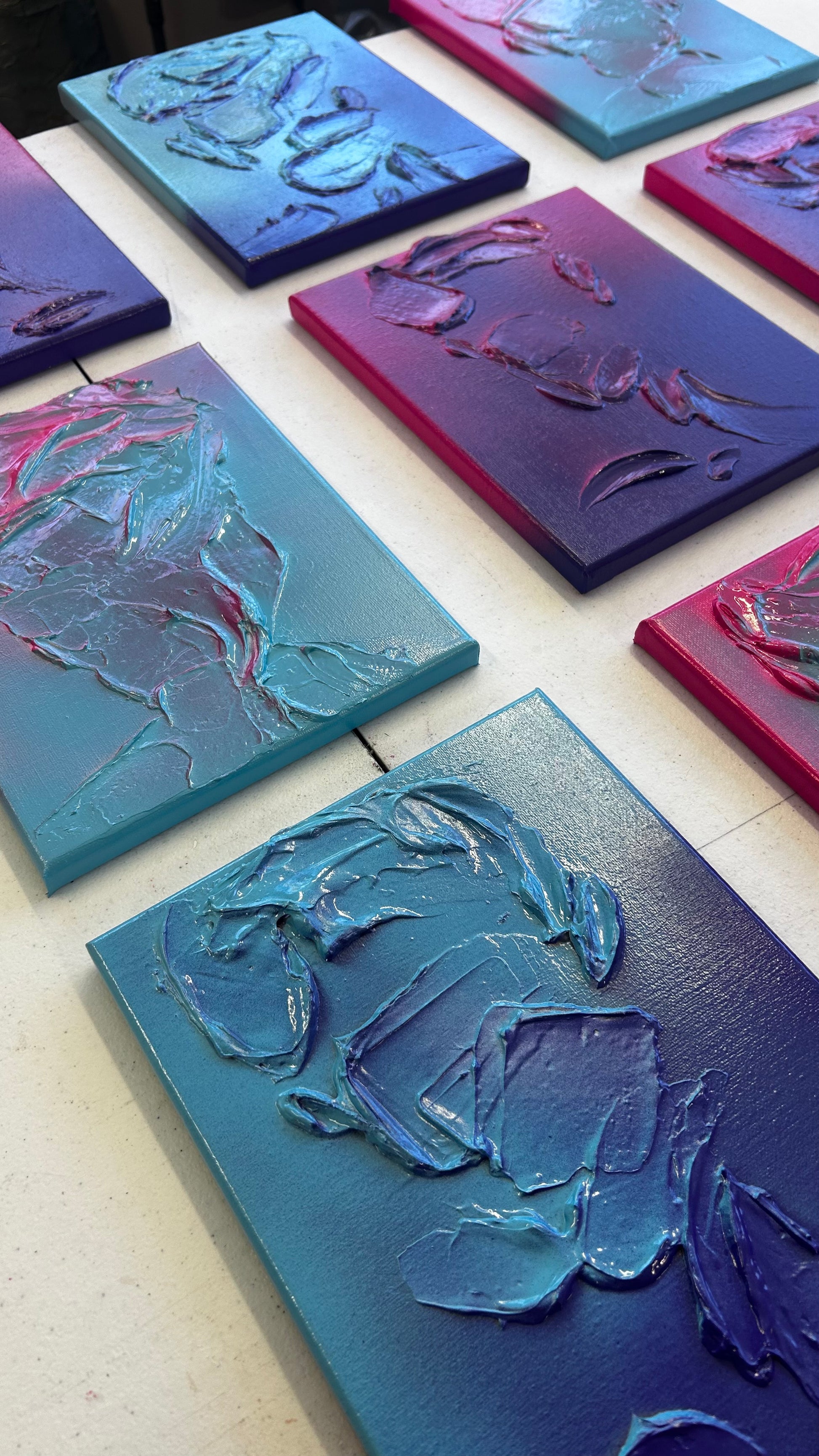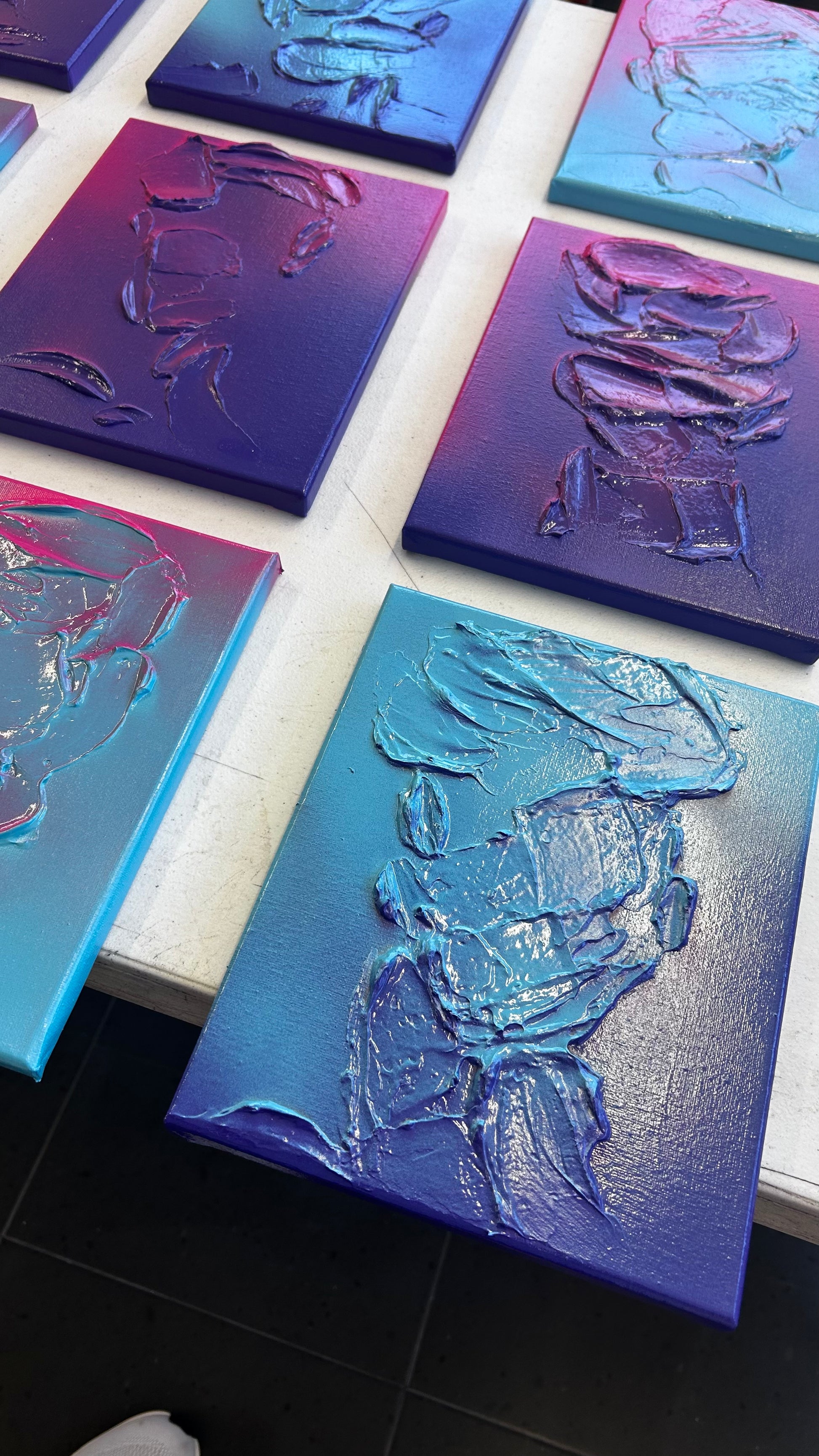 La obra completa consta de 9 rostros, pero se tiene la opción de formar un set de 3 piezas de distintas colores.