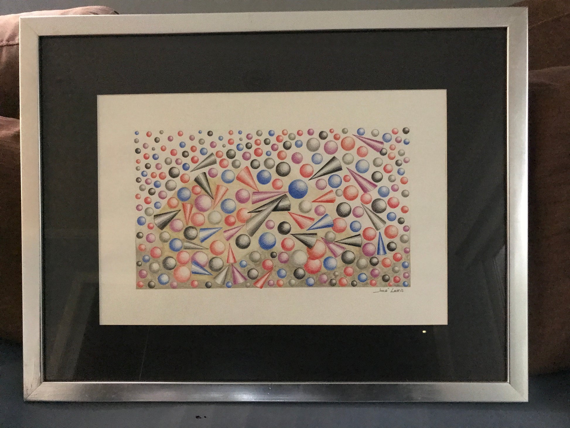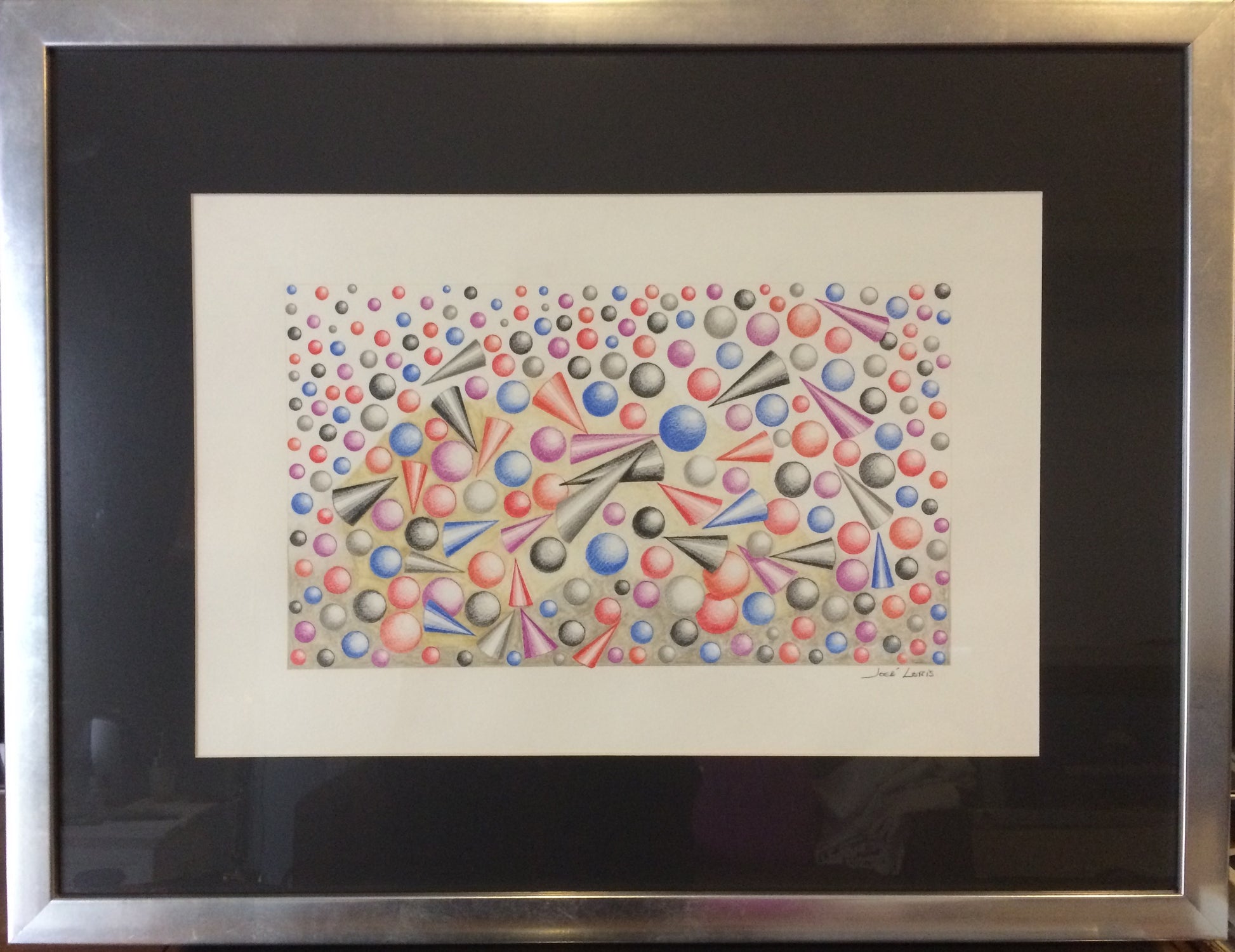 Esferas y conos sobre fondo dorado, con lápices de colores acuarelables Faber Castell.