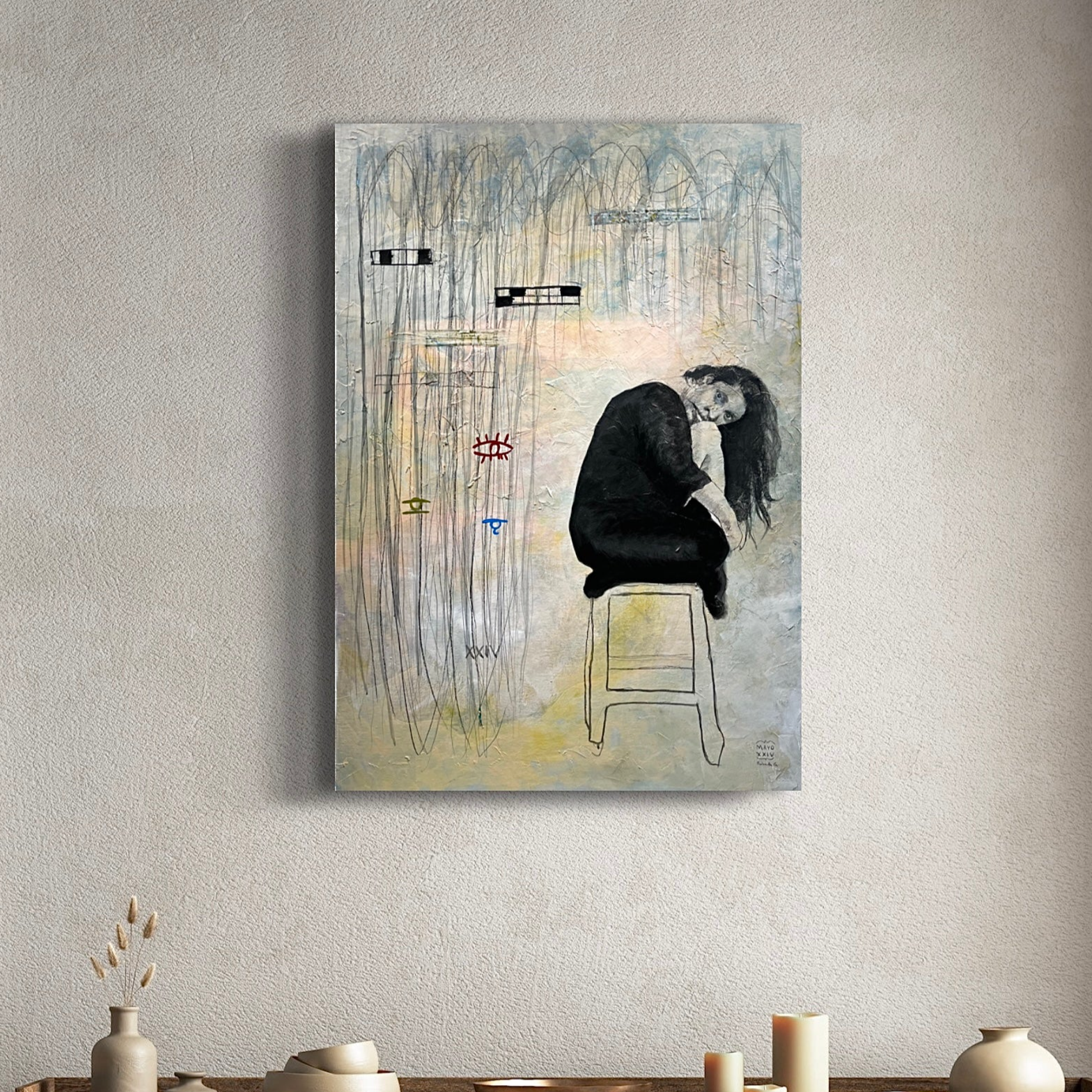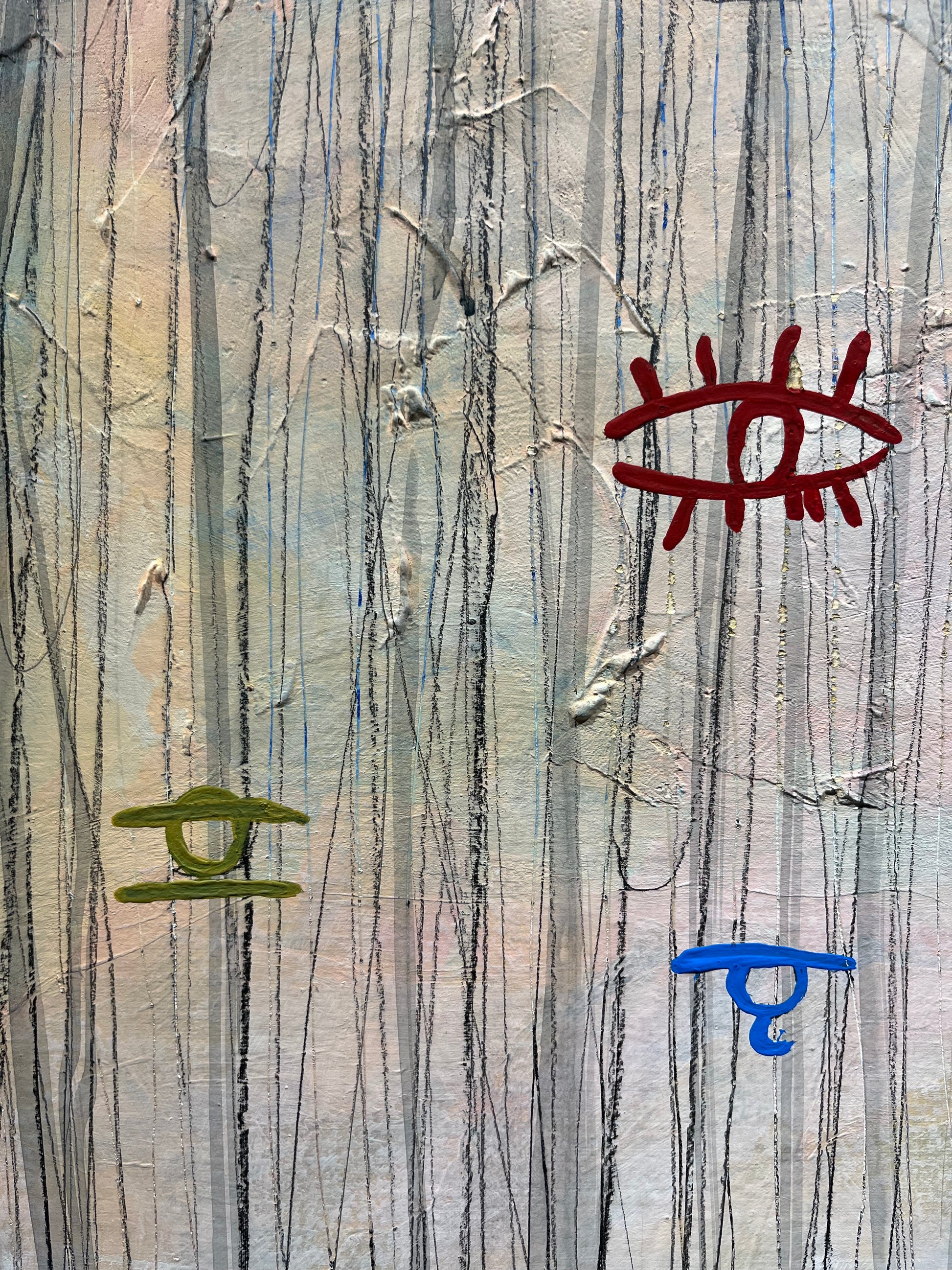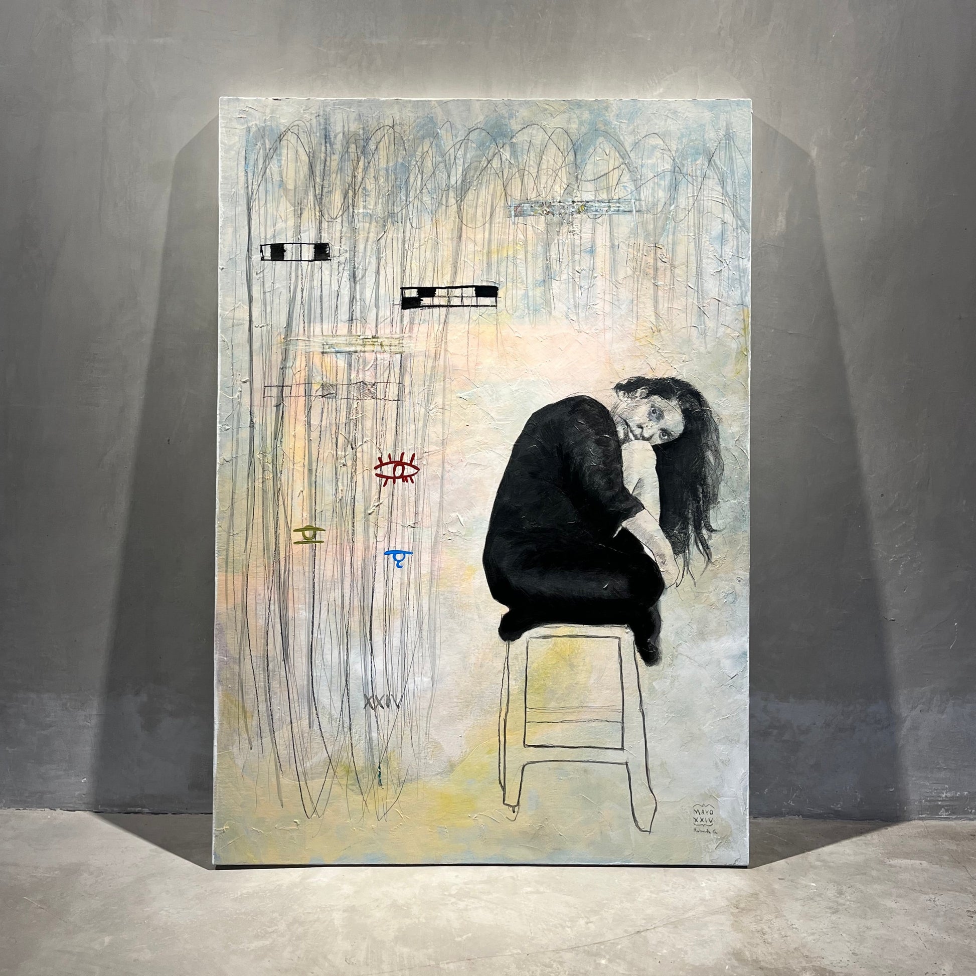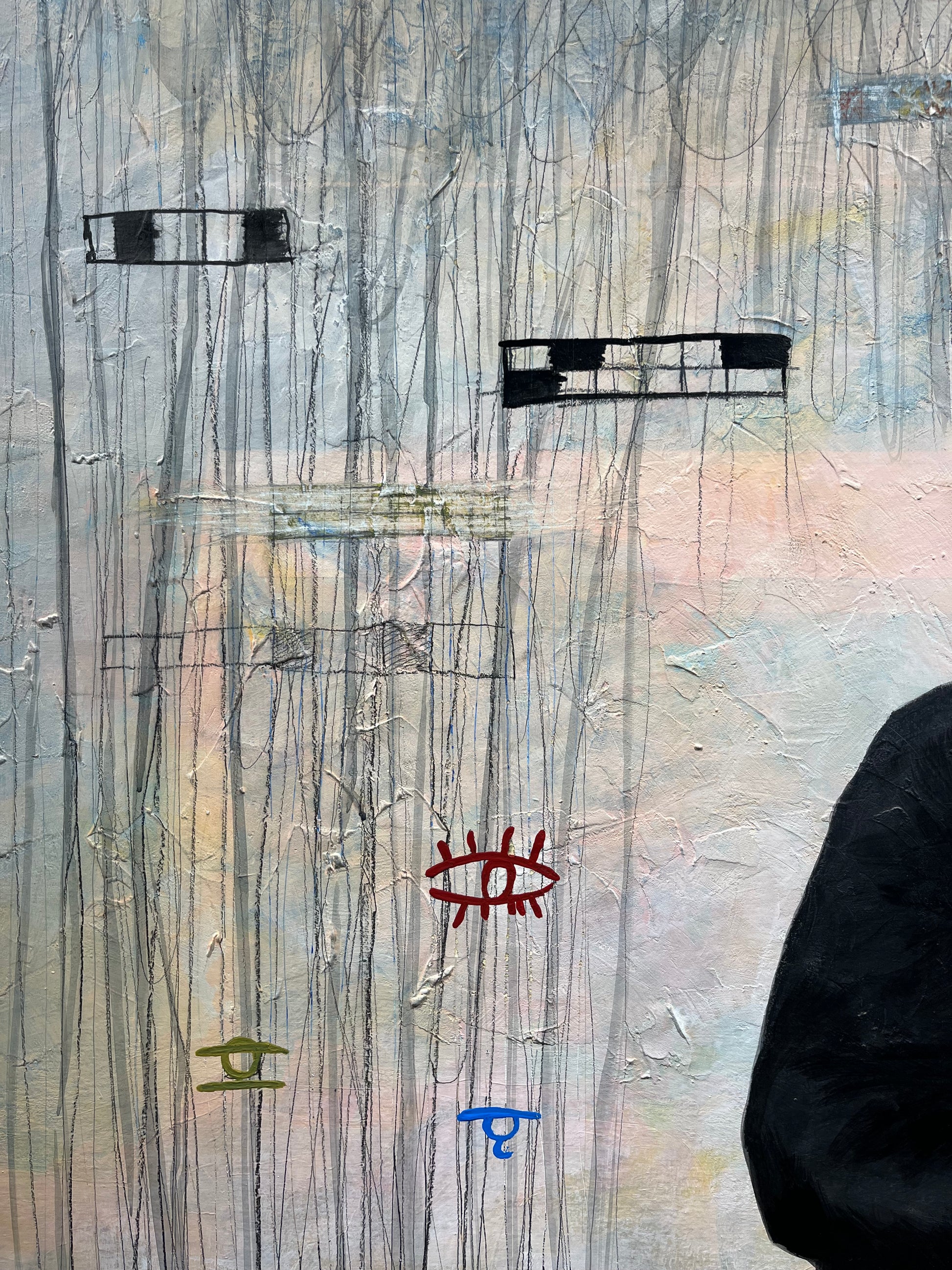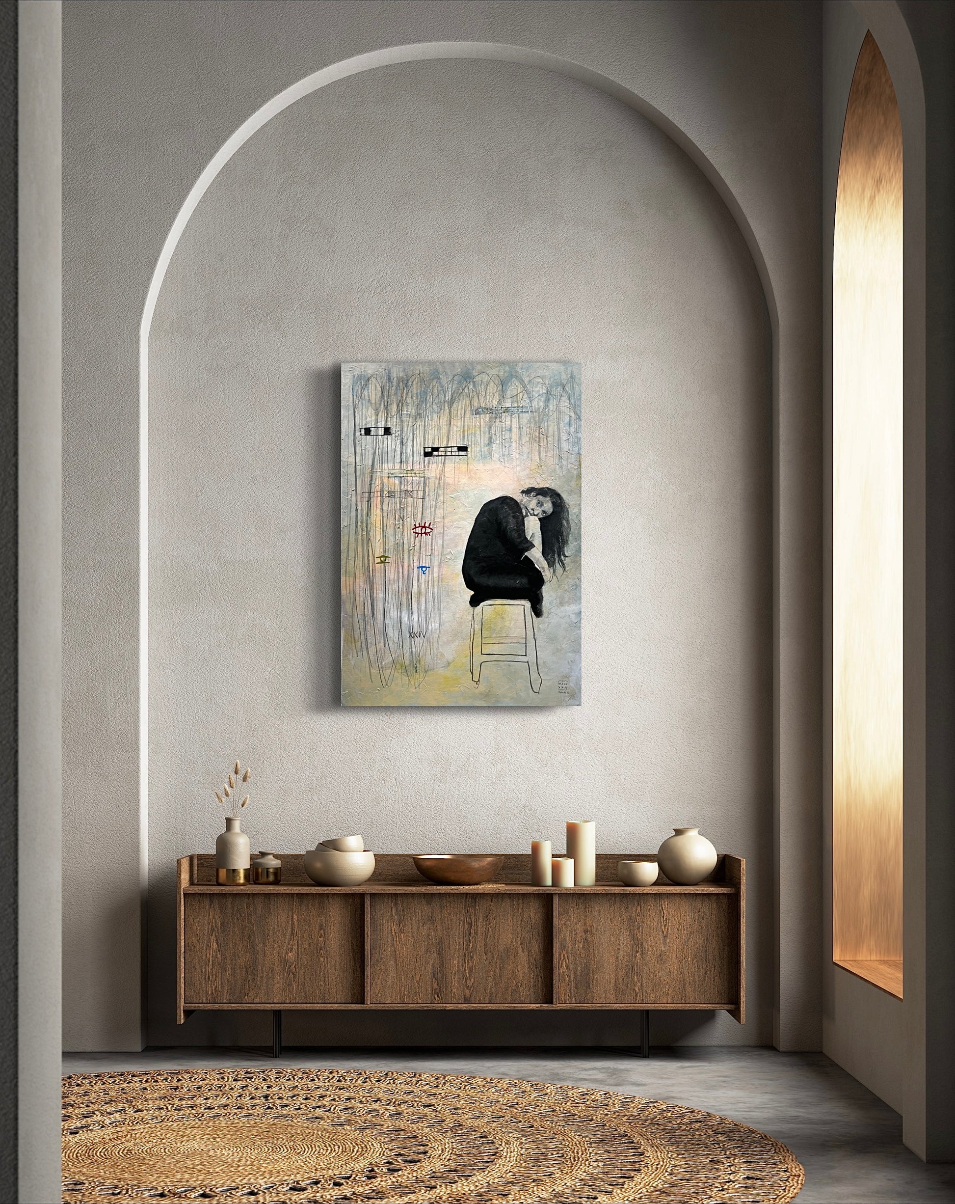Sobre dejar ir. Esta pintura busca representar las emociones que sentimos en un momento de aceptación. El momento en el que afrontamos una pérdida, que al vivirla en incertidumbre, ha causado dolor, y que cuando finalmente aceptamos esta realidad, más allá del vacío, deja una sensación de tranquilidad. De alivio.