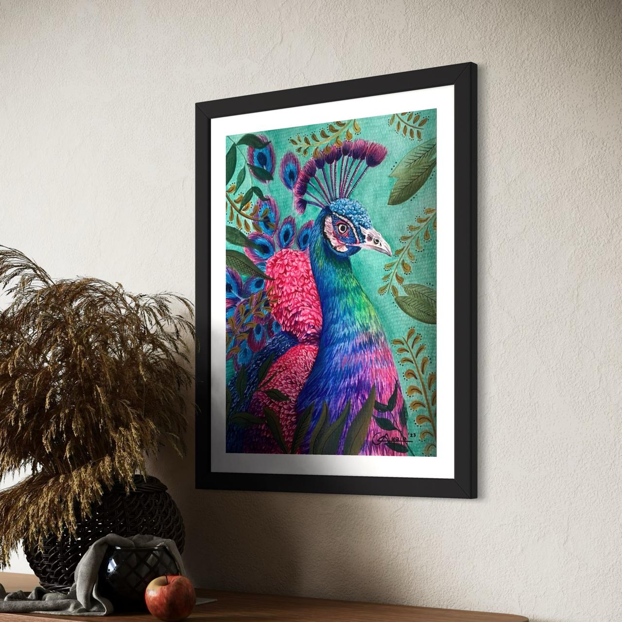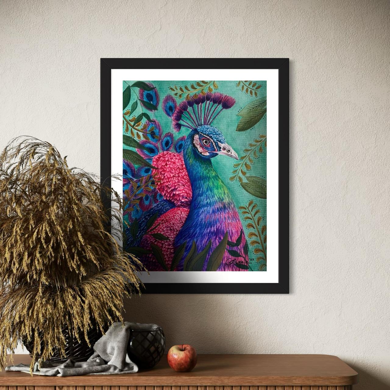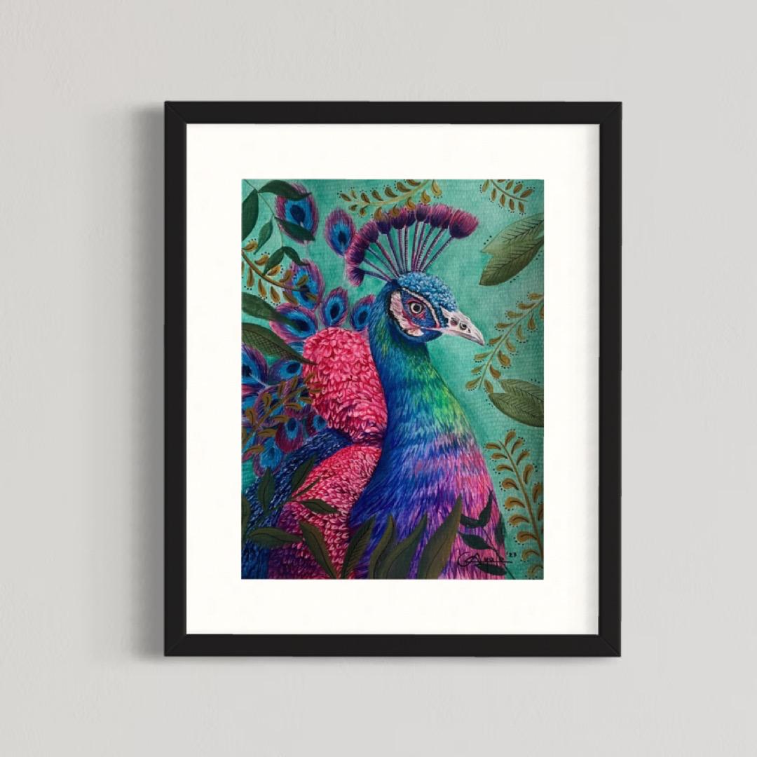 Esta acuarela presenta un majestuoso pavorreal que, envuelto en la exuberancia de la naturaleza, simboliza la búsqueda del propósito y la verdad interior. Sus plumas, vibrantes y llenas de vida, evocan un viaje hacia la iluminación y la autorrealización. La obra refleja un momento de claridad y belleza, recordándonos que, incluso en medio de la complejidad de la existencia, siempre hay un camino hacia la luz.