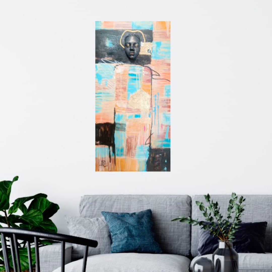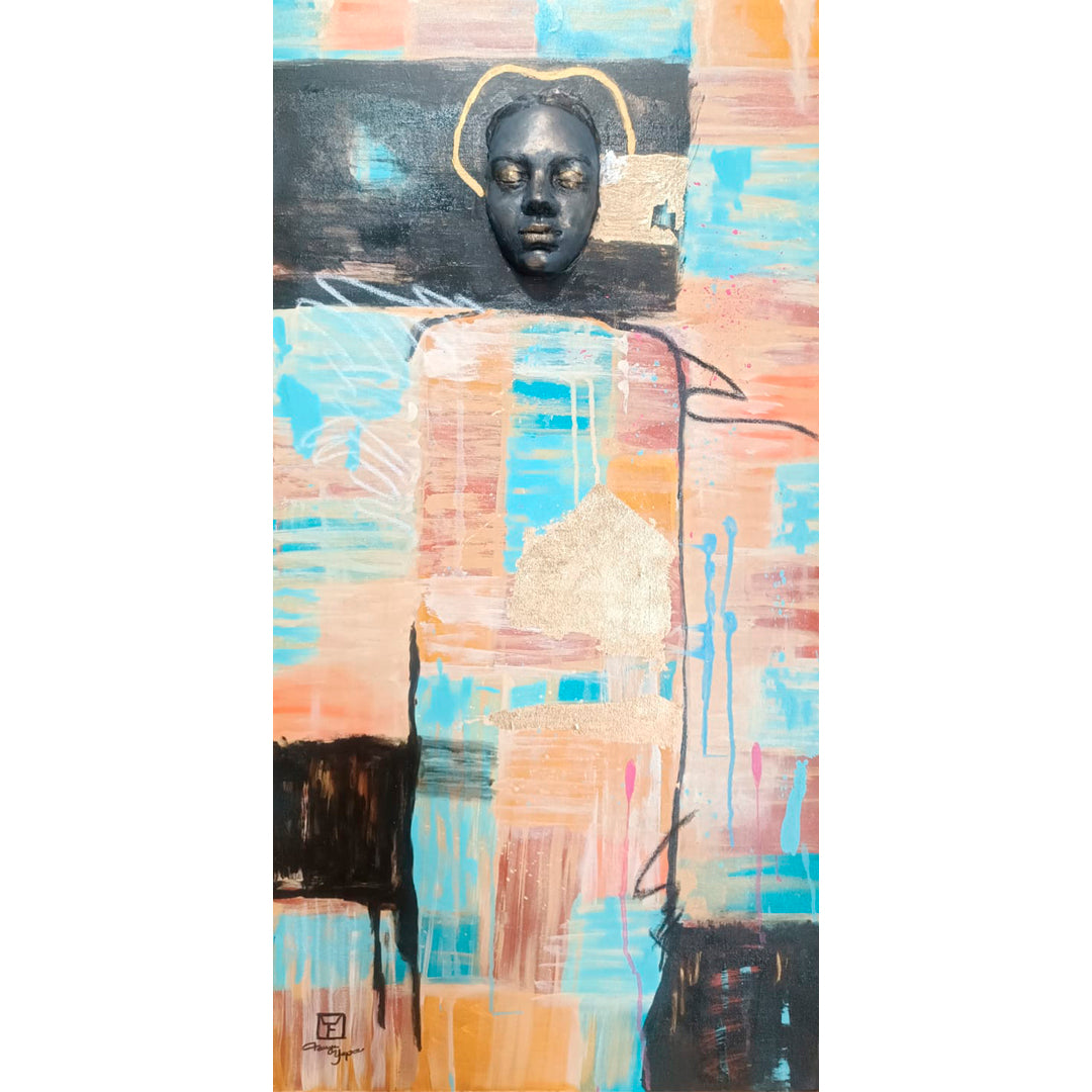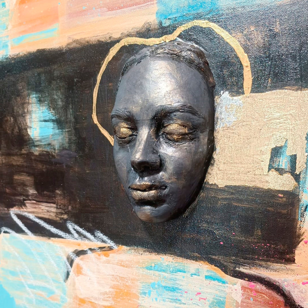 Acrìlico sobre bastidor con hoja dorada y plateada con escultura en resina.