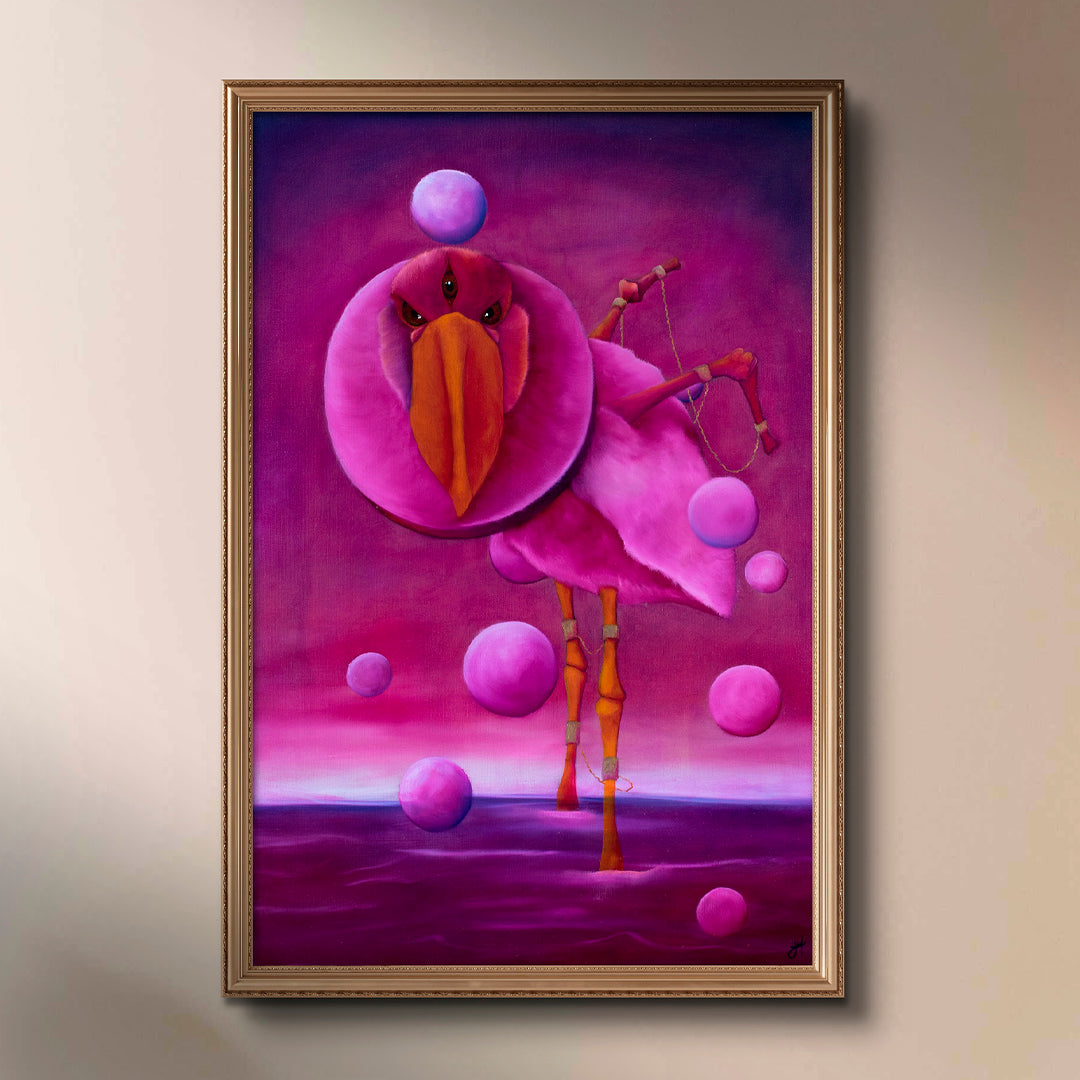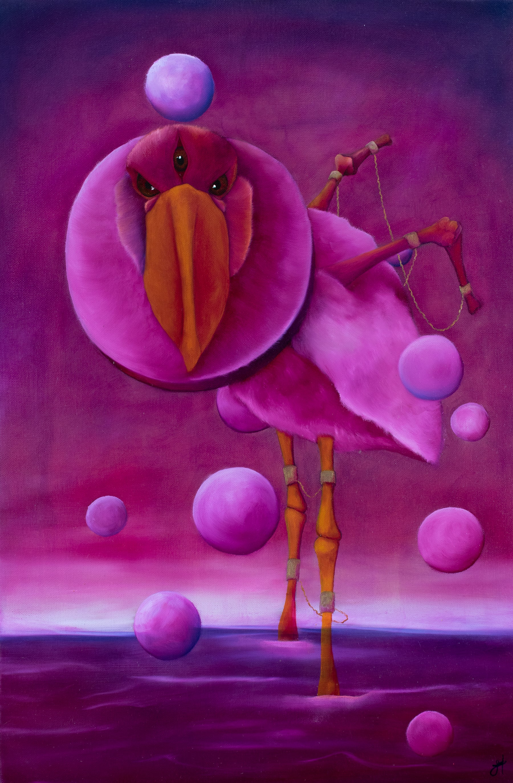 Aves cubiertas en tonos de carne madura, sangre diluida y polvo rosado. No cantan, no vuelan, solo observan, habitan un espacio suspendido entre lo hermoso y lo nostálgico, entre lo que alguna vez fue vivo y lo que ya no puede escapar.