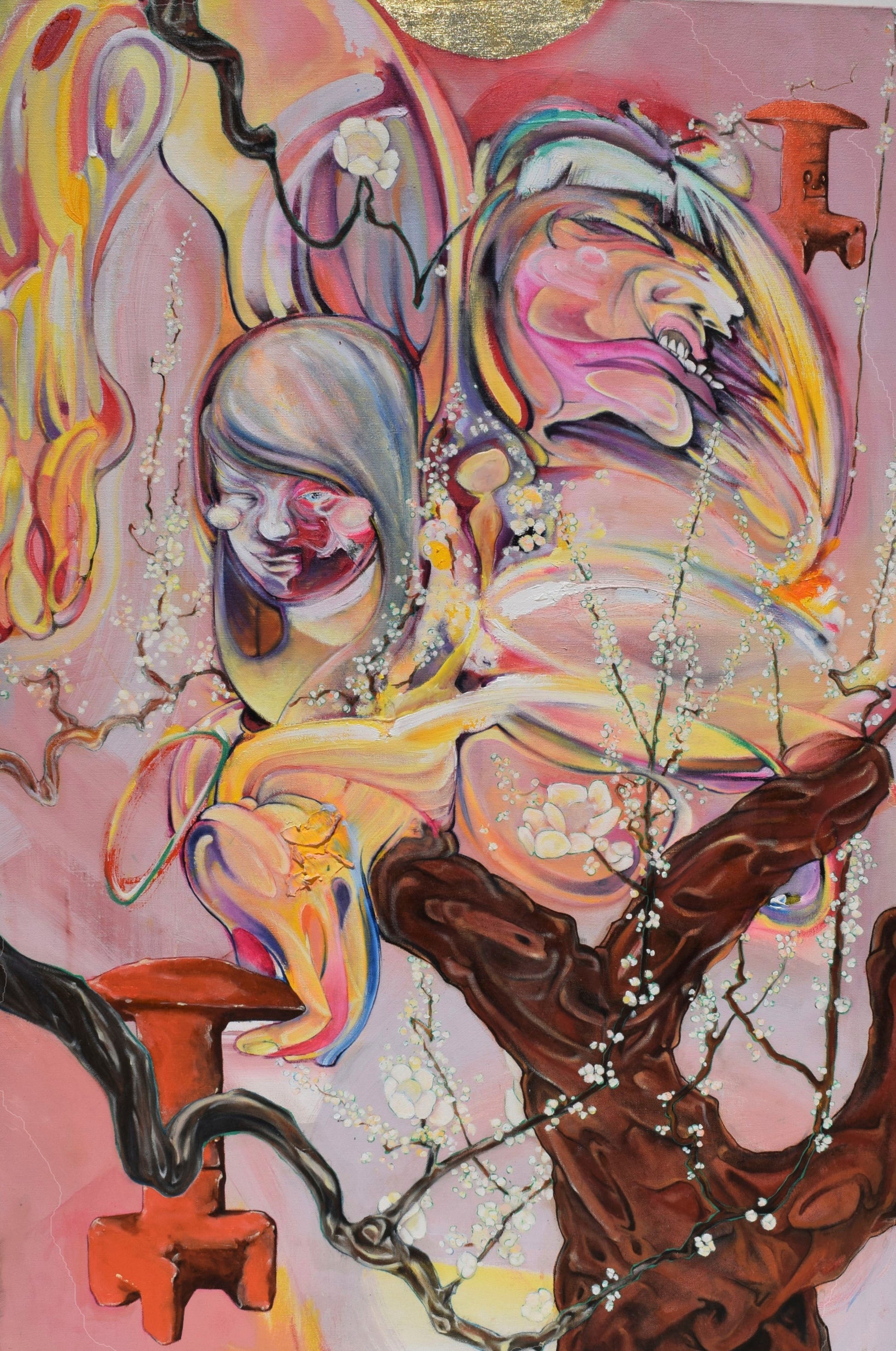 Florecimiento simbiótico es una obra inspirada en las relaciones humanas que se establecen por casualidad y causalidad, en ella se encuentra la expresión casi abstracta de dos personajes que hacen simbiosis resultando en el florecimiento de una nueva entidad sintiente. Apreciamos una composición de arte flotante que hace eco de una pos-modernidad contemporánea, haciendo uso de elementos de arte precolombino (una figurilla prehispánica de un hongo) en las esquinas inferior izquierda, y superior derecha. Apreciamos también la naturaleza solar de la unión humana, representada con un semicírculo dorado en la parte superior de esta obra rica en texturas, formas y manejo del color, que nos otorga el artista plástico mexicano -Diego Orozco.