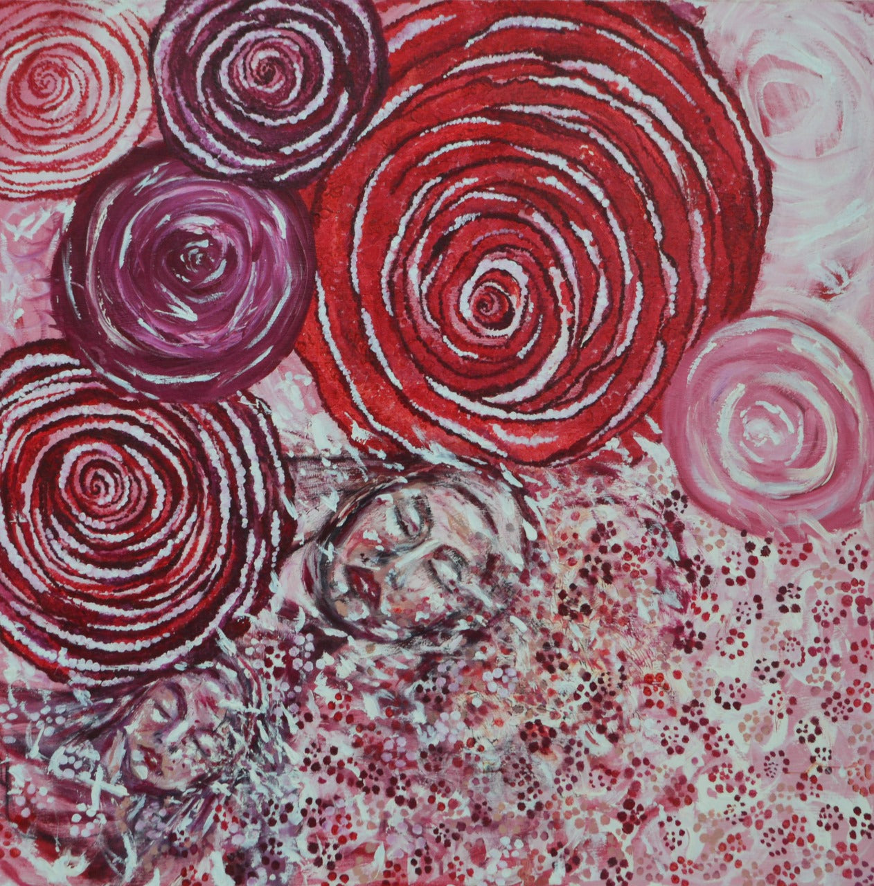 En esta obra, he utilizado una paleta de colores cálidos y suaves: rojos, rosas y blancos, para crear una atmósfera que evoca tanto la pasión como la ternura. Mi intención era explorar la feminidad y el vínculo continuo entre la mujer adulta y su niña interior, reflejando cómo ambas coexistimos y nos influenciamos mutuamente a lo largo de la vida.