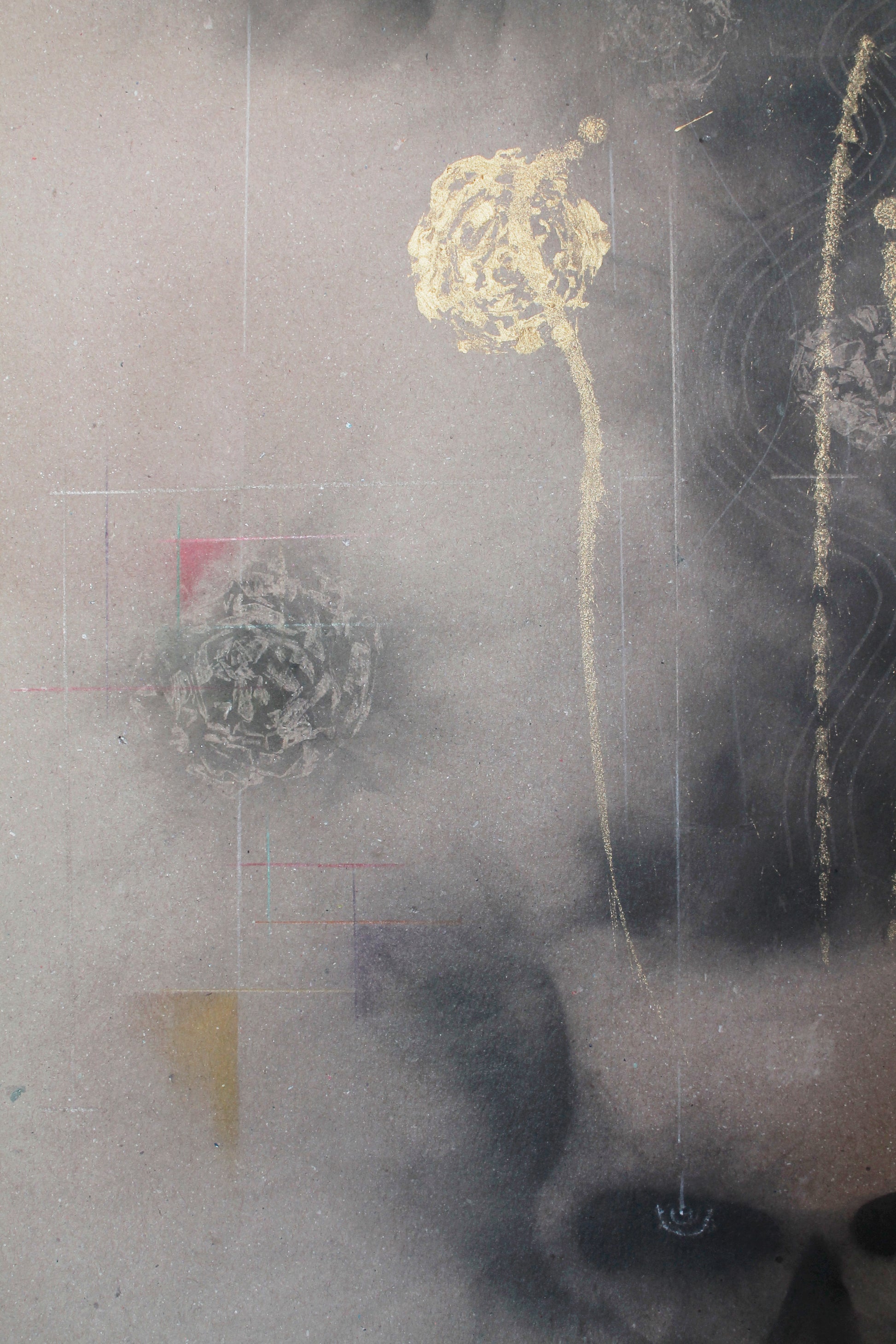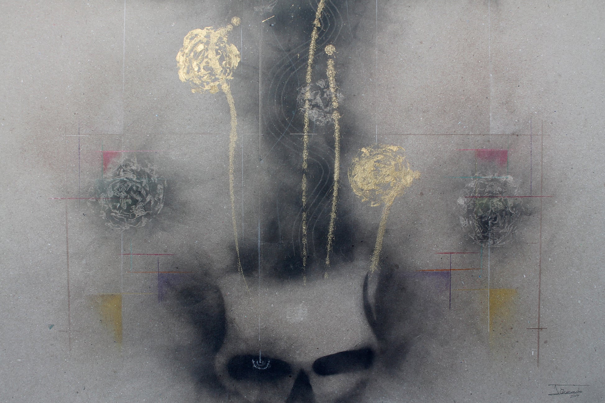 Humo de ocote y acrílico, sobre papel cartulina Kraft gris 180 g/m2