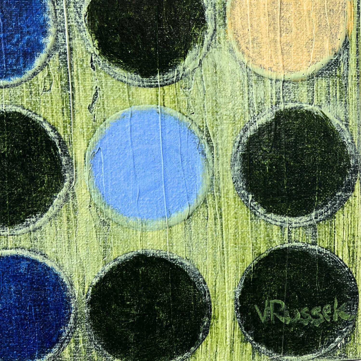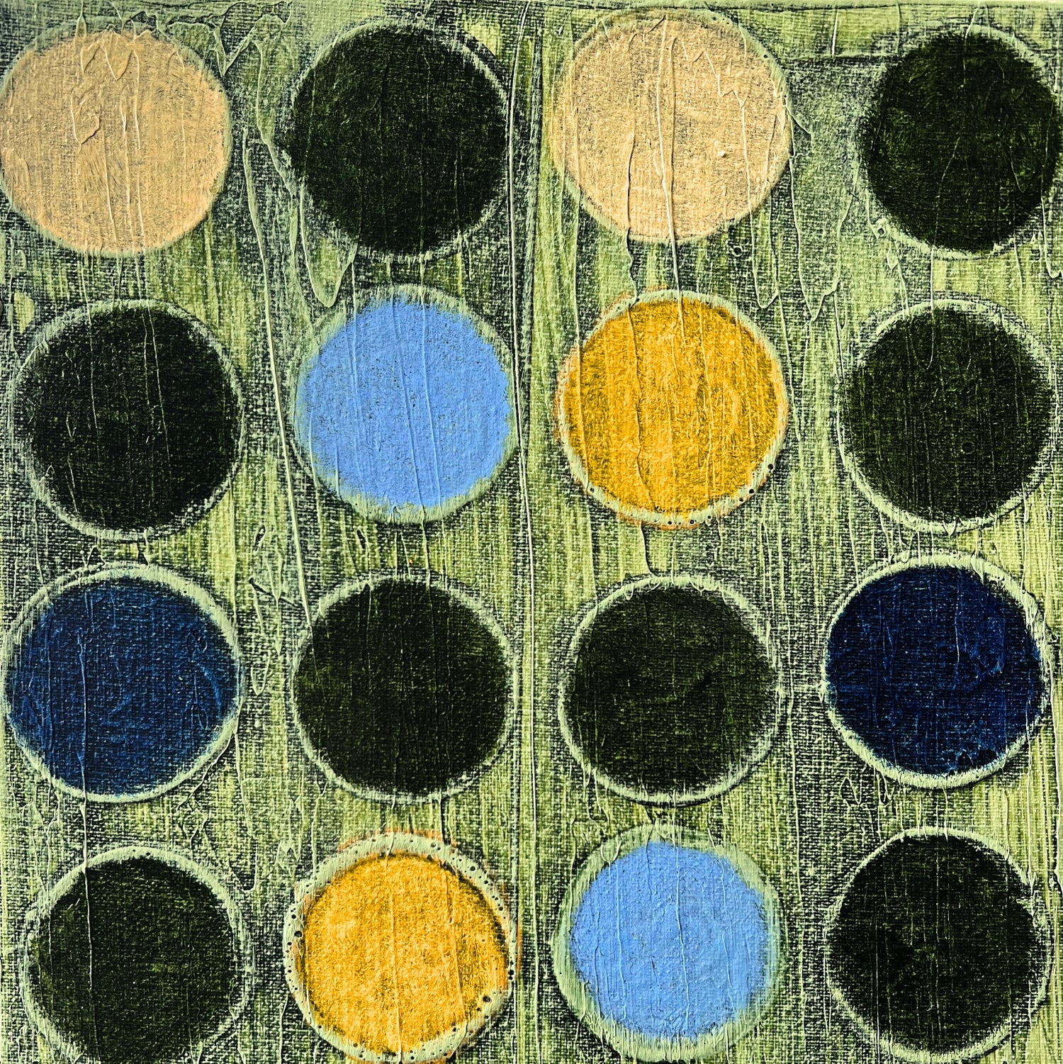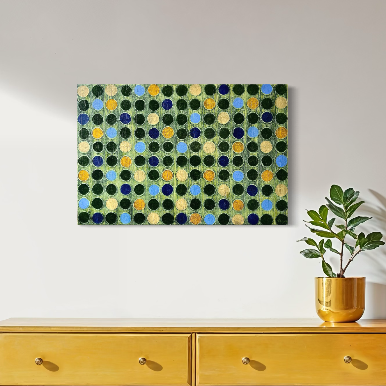 Esta obra evoca un campo de flores visto desde cerca, donde cada círculo se convierte en una flor abstracta que vibra entre el verde, el azul y los tonos dorados. La composición transmite la sensación de un paisaje lleno de vida, pero contenido dentro de una retícula ordenada. Es una pieza que celebra la naturaleza desde la geometría, donde la repetición se convierte en ritmo y el color en energía.
