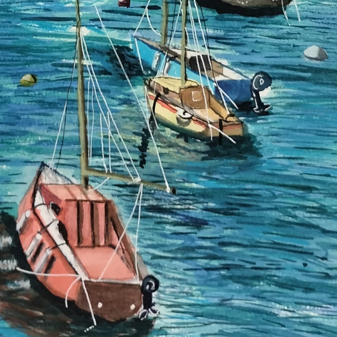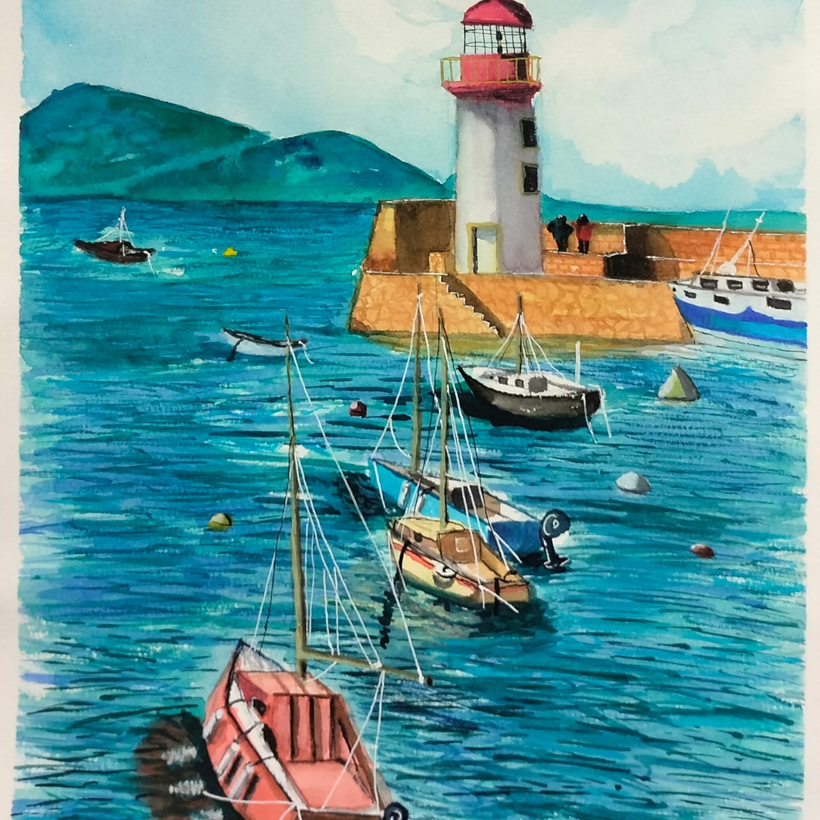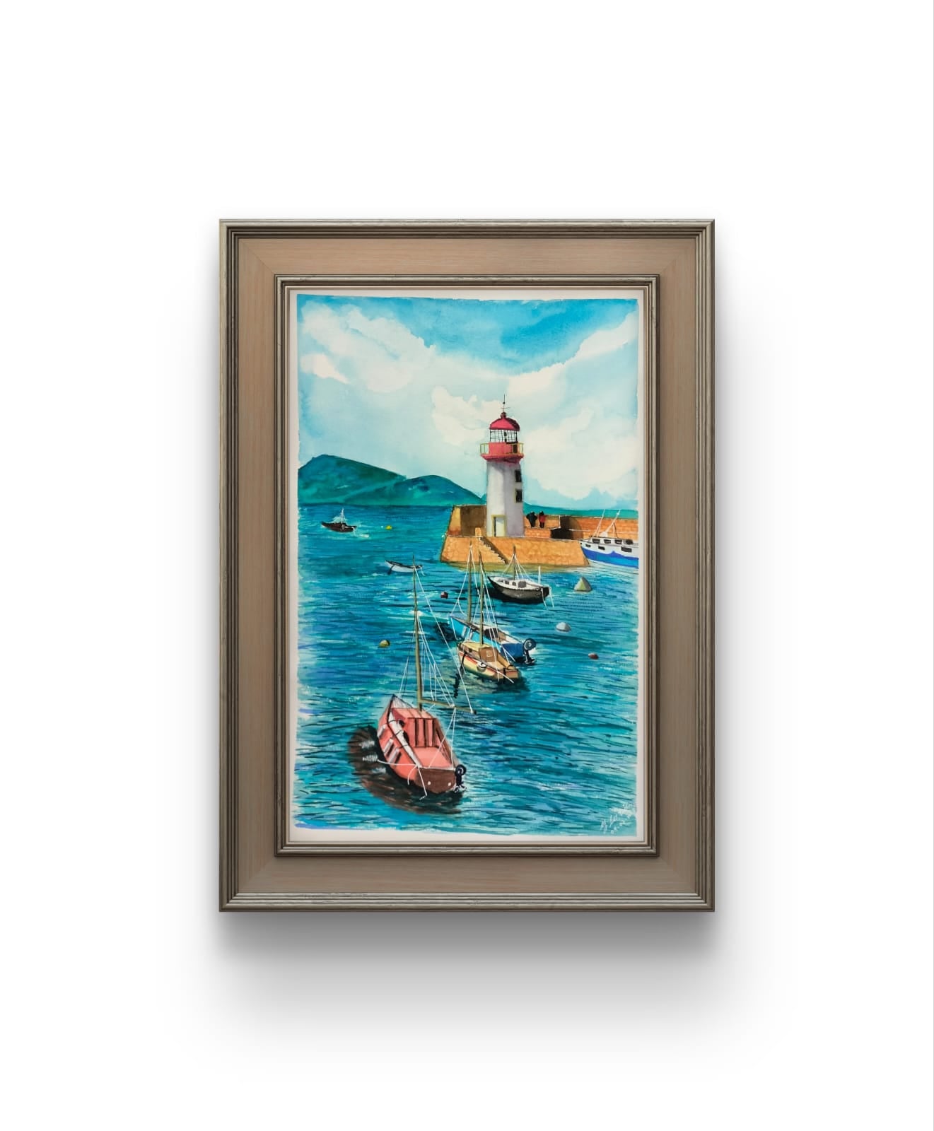 Acuarela sobre papel. Escena Marina. Una escena que invita al sosiego interior. Barcos suspendidos sobre un mar sereno y la figura del faro evocan la búsqueda de refugio, dirección y pausa. Esta obra habla del deseo de detener el tiempo y simplemente flotar… en calma.