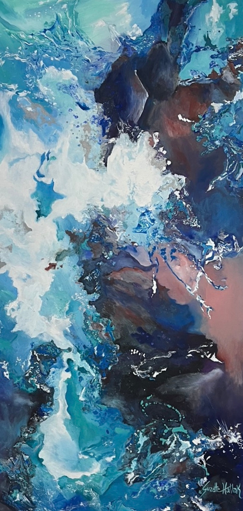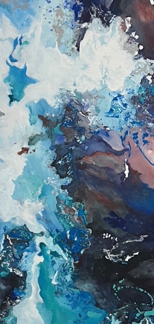 “Fluyendo” es un lienzo donde la materia se libera. Capas de azul, blanco y sombras minerales se entrelazan como corrientes que se encuentran, se disuelven y vuelven a nacer. La obra captura el movimiento interno: ese instante en que lo rígido se suaviza y el cuerpo permite que todo circule. Es un recordatorio visual de confiar, soltar y dejar que la vida fluya.