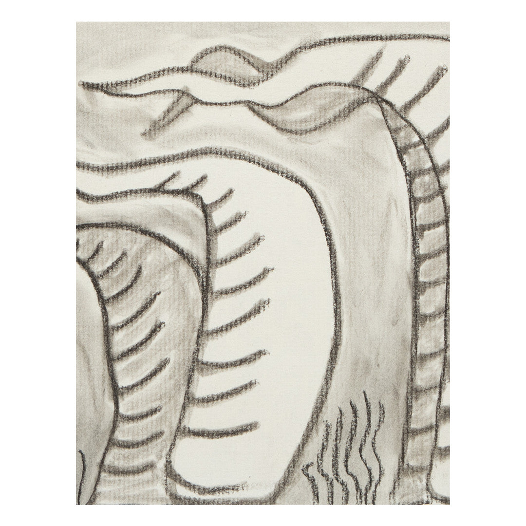 Tres formas orgánicas, se yerguen sobre un fondo difuminado en tonos grises. Las líneas del carboncillo son precisas y fluidas, creando una textura sutil que contrasta con la suavidad del fondo. La simplicidad de la composición, la economía de medios y la sutileza del trazo contribuyen a una atmósfera serena y contemplativa. El conjunto transmite una sensación de quietud y misterio, invitando a la interpretación personal del significado de las formas representadas.