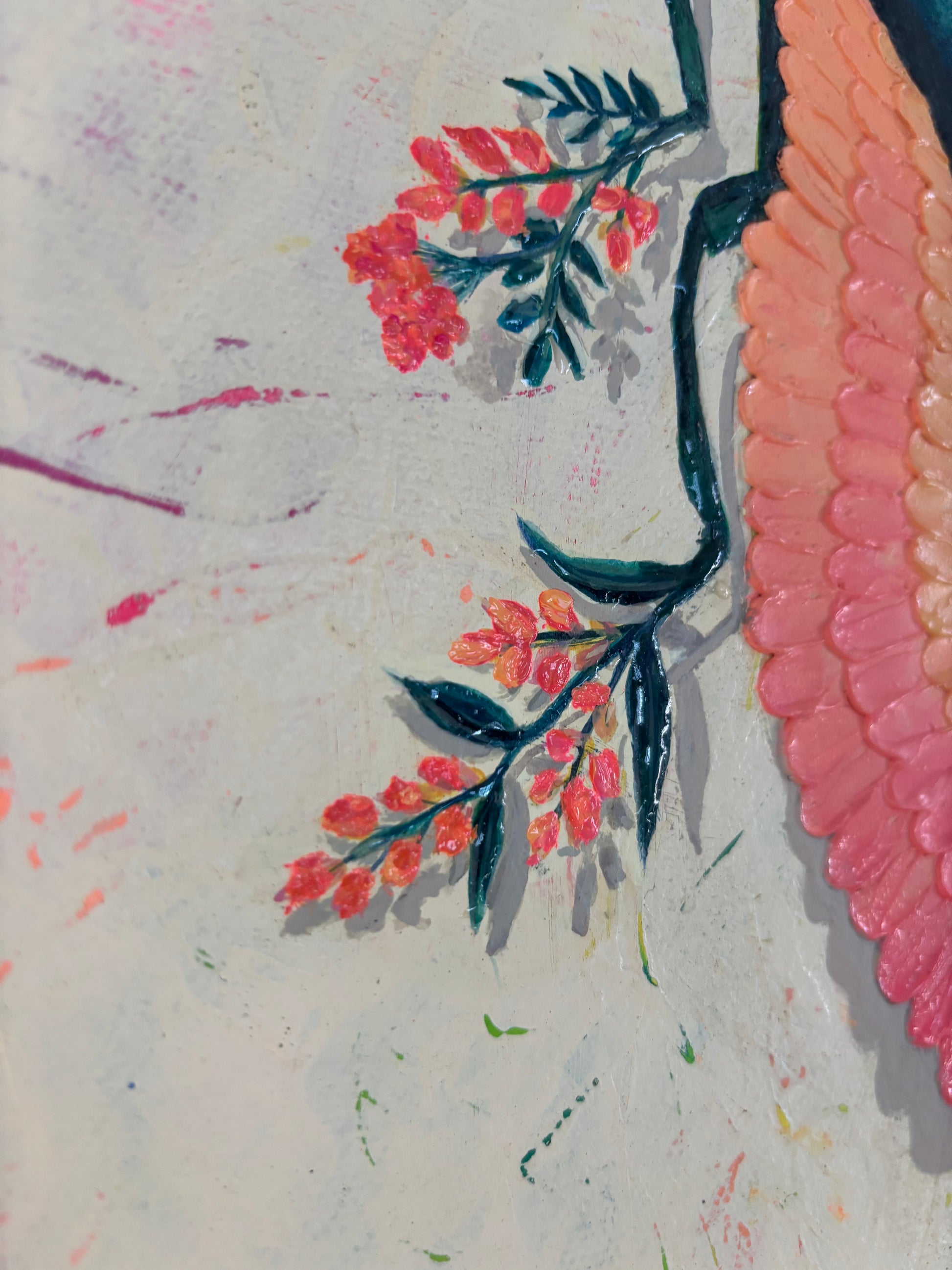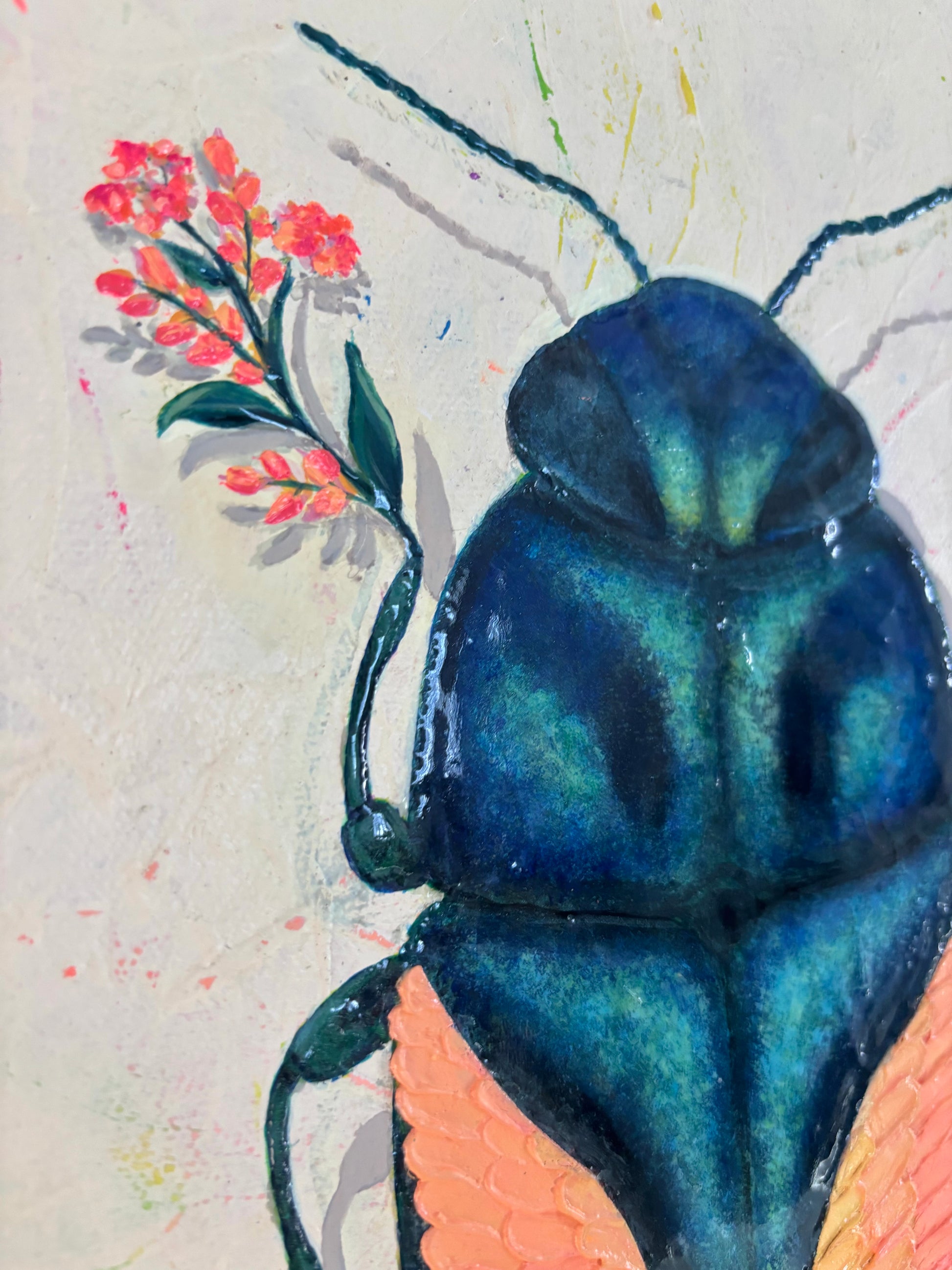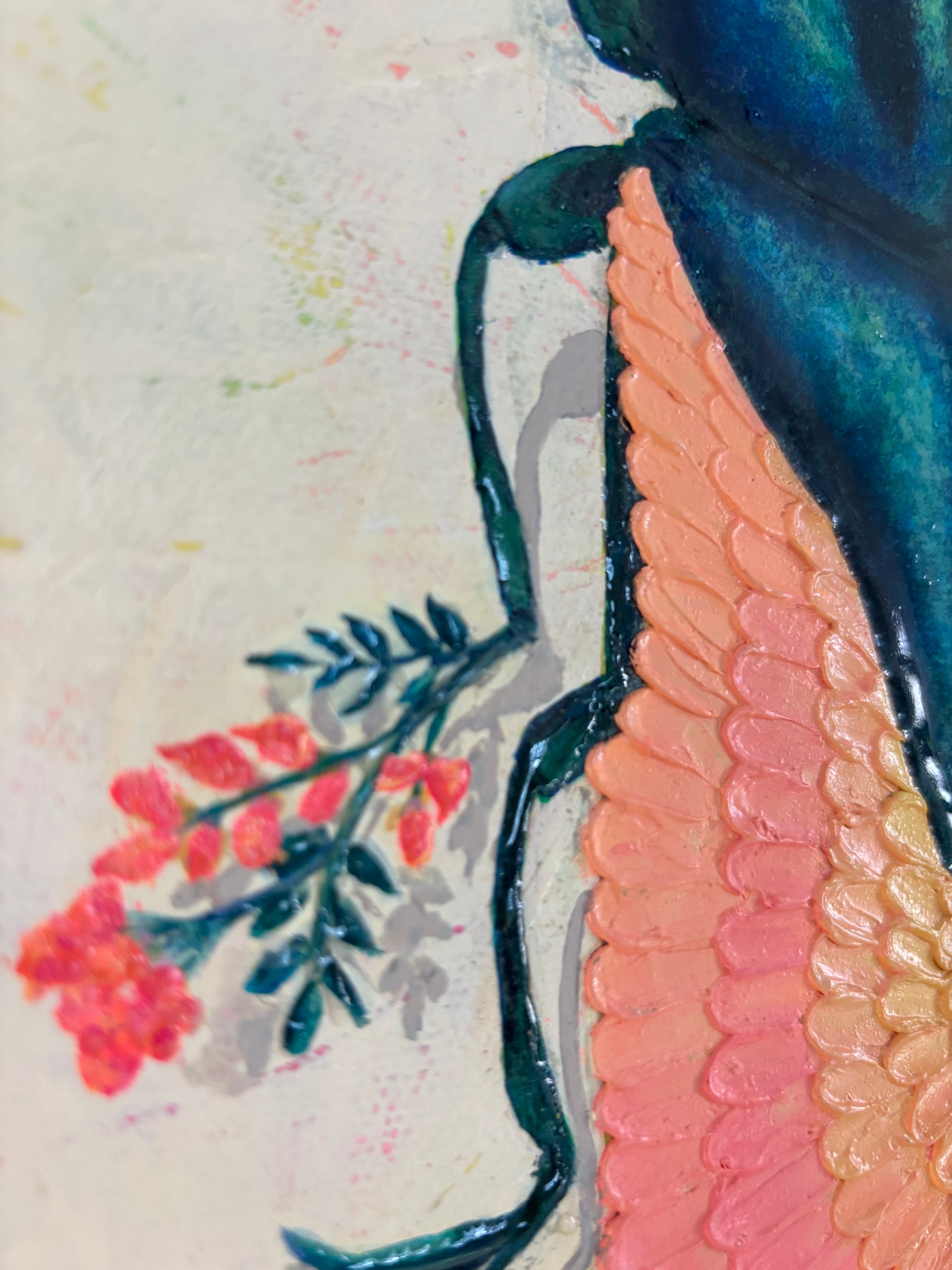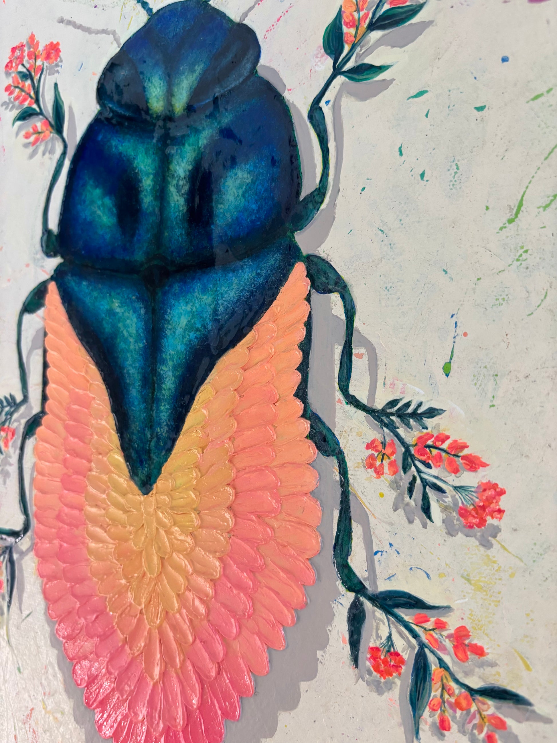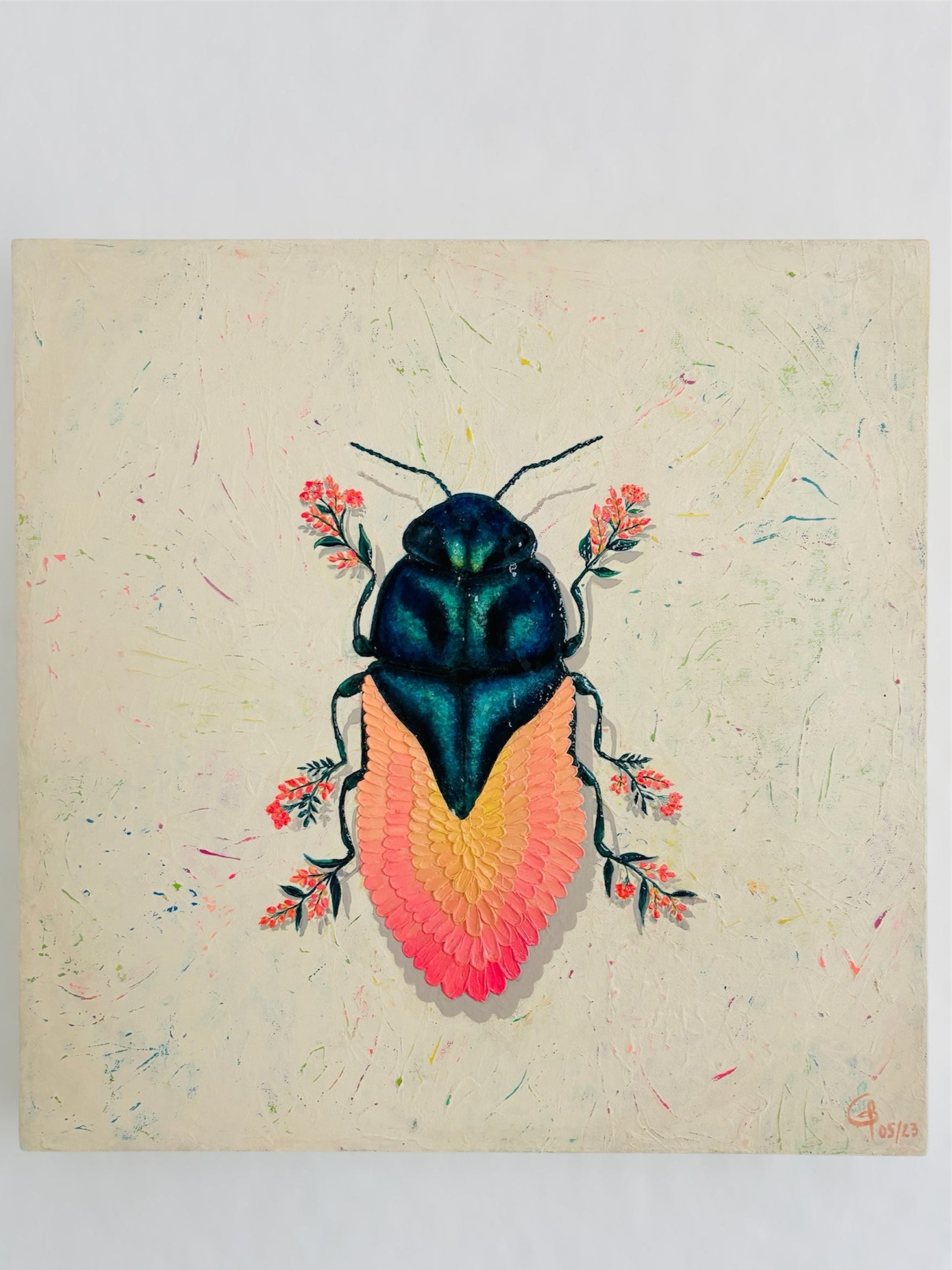Esta pieza reinterpreta la figura de un insecto con volúmenes y relieves que generan sorprendentes efectos visuales. Su textura con oleos en colores pasteles simulan el betún de algún pastel, pero al mismo tiempo emula los pétalos de las flores.