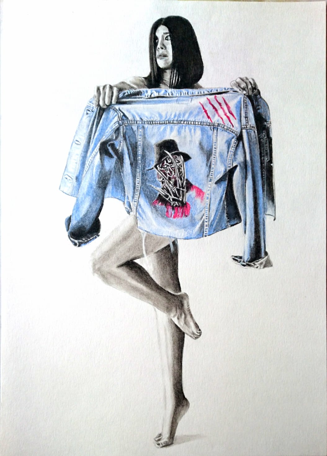 Dibujo de modelo hecho con colores pastel tipo gis sobre papel.