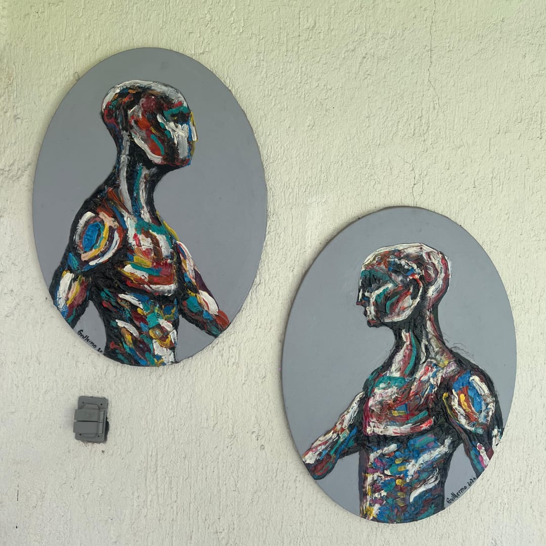 La obra compuesta por dos cuadros presenta una exploración visual fascinante de la dualidad y la simetría a través de la representación de hombres en silueta, vibrantes en una paleta de colores vivos. Cada cuadro, aunque complementario al otro, ofrece una interpretación única de la conexión entre dos individuos.
