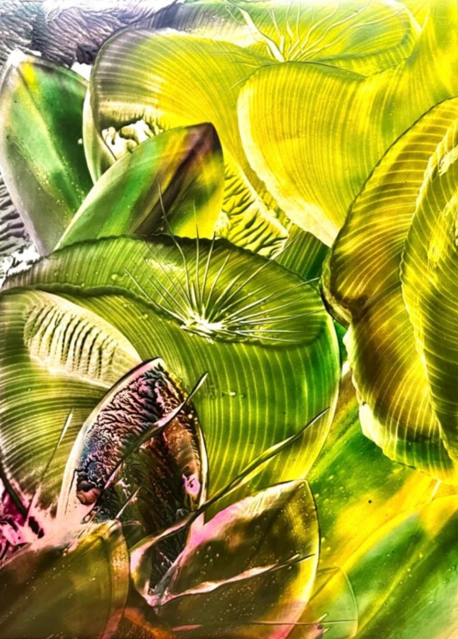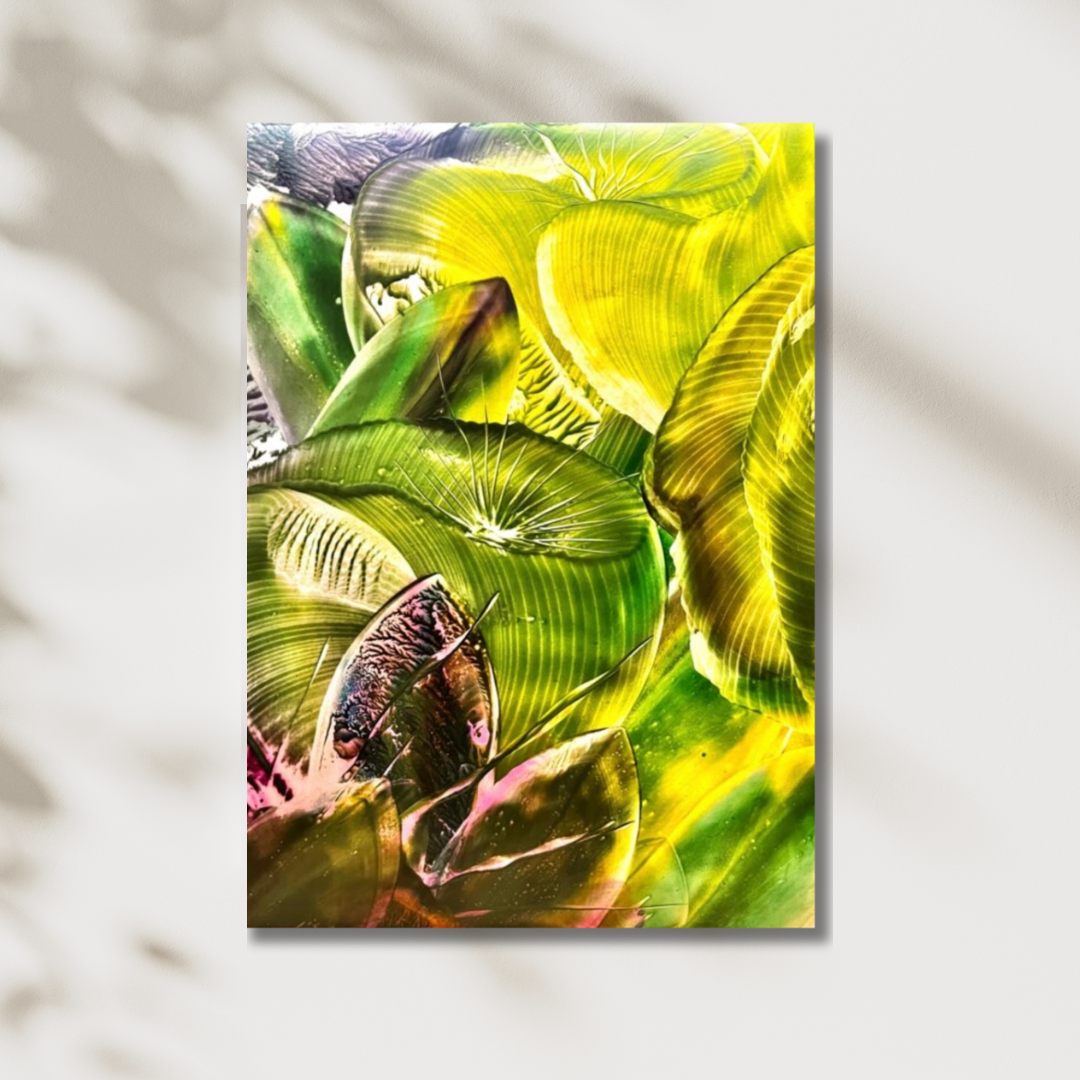 "Frescura del Bosque" captura la esencia vibrante de un entorno forestal rejuvenecedor. Con tonos verdes y dorados, la pintura evoca la sensación de estar rodeado por la vegetación y la frescura que caracteriza a los bosques. Las hojas que parecen brillar con vida y movimiento invitan al espectador a sumergirse en esta experiencia visual. La técnica de encáustico en papel utilizada en la obra resalta las texturas y detalles de cada hoja, aportando una luminosidad que parece cambiar dependiendo de la luz y la perspectiva desde la cual se observe. Este cuadro ofrece una interpretación abstracta de la naturaleza, que sugiere vida y regeneración.