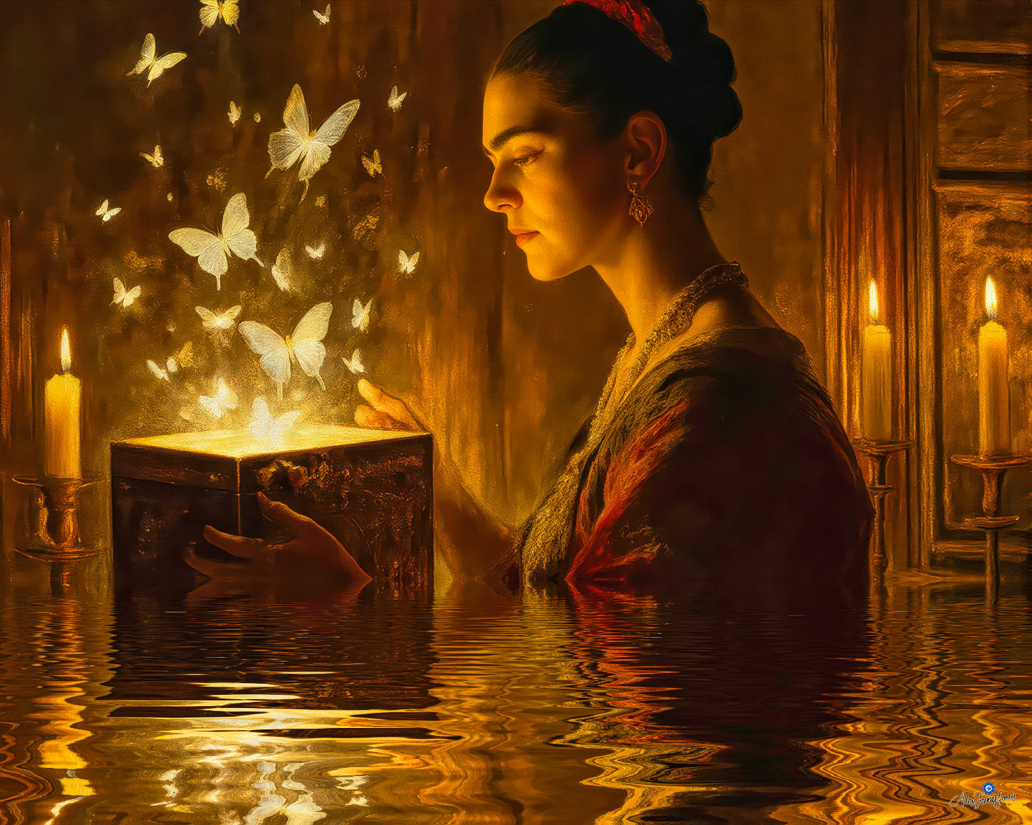 En esta composición, una figura femenina iluminada por la luz cálida de las velas sostiene una caja abierta de la cual emergen mariposas resplandecientes. La escena evoca el mito de Pandora, pero aquí no se trata de castigo ni de caos, sino de revelación y transformación.