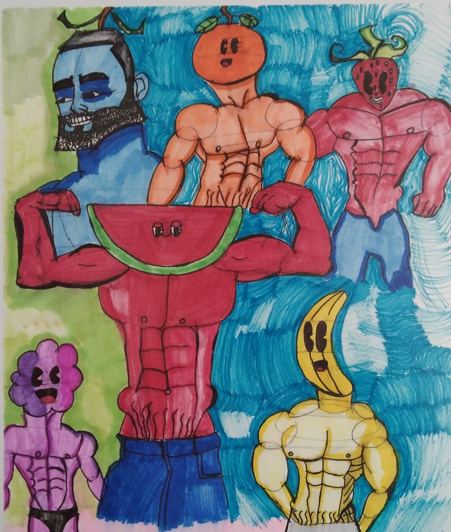 Caricaturas de frutas con cuerpos atléticos y fornidos