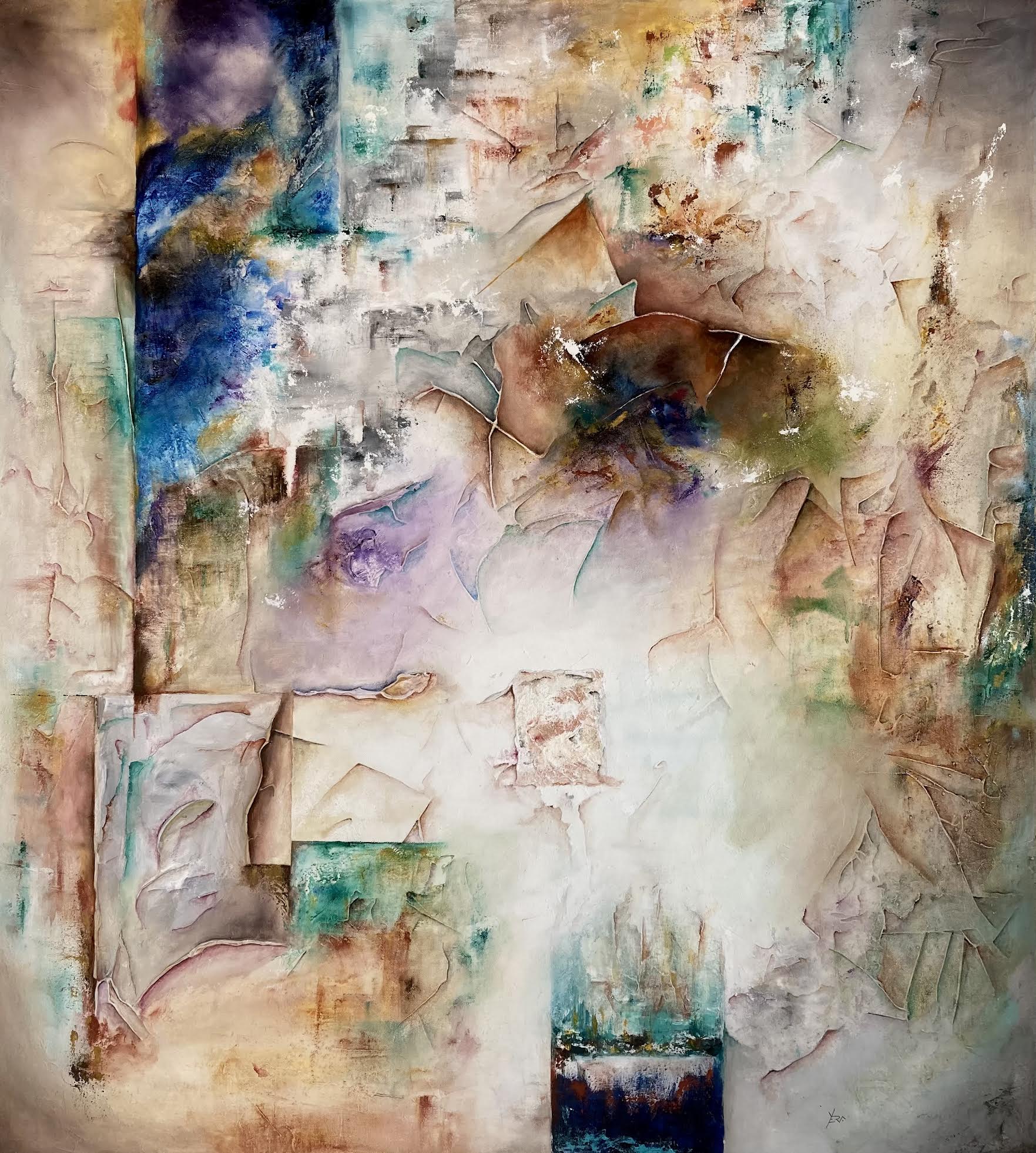 Hay, en esta obra, una cualidad casi alquímica, donde la materia parece haberse calcinado hasta alcanzar una blancura extrema. Es un recuerdo del proceso de purificación en la búsqueda de lo puro. La presencia de azules y violáceos nos transporta a una sensación de latencia, de algo que aún arde en su interior.