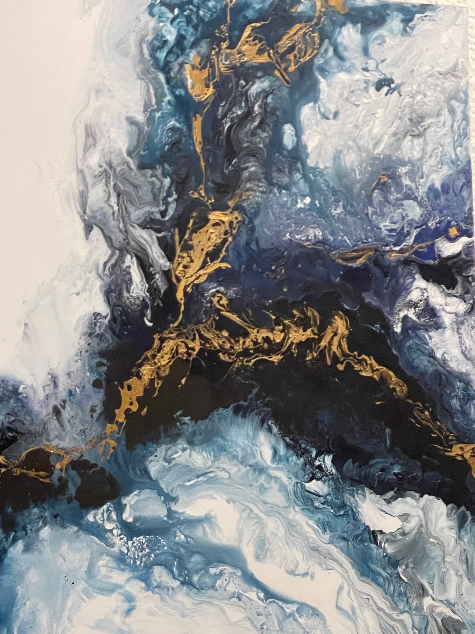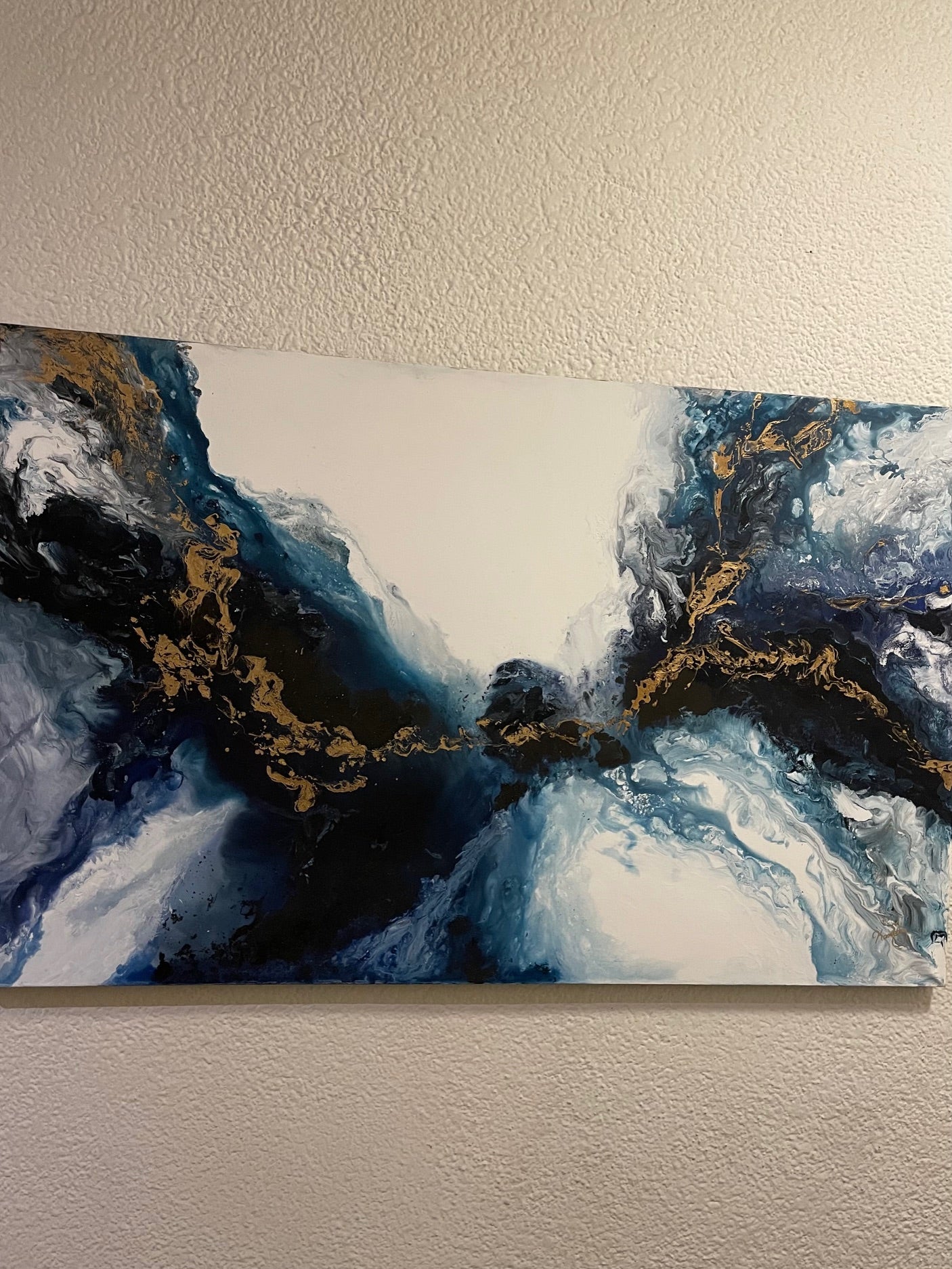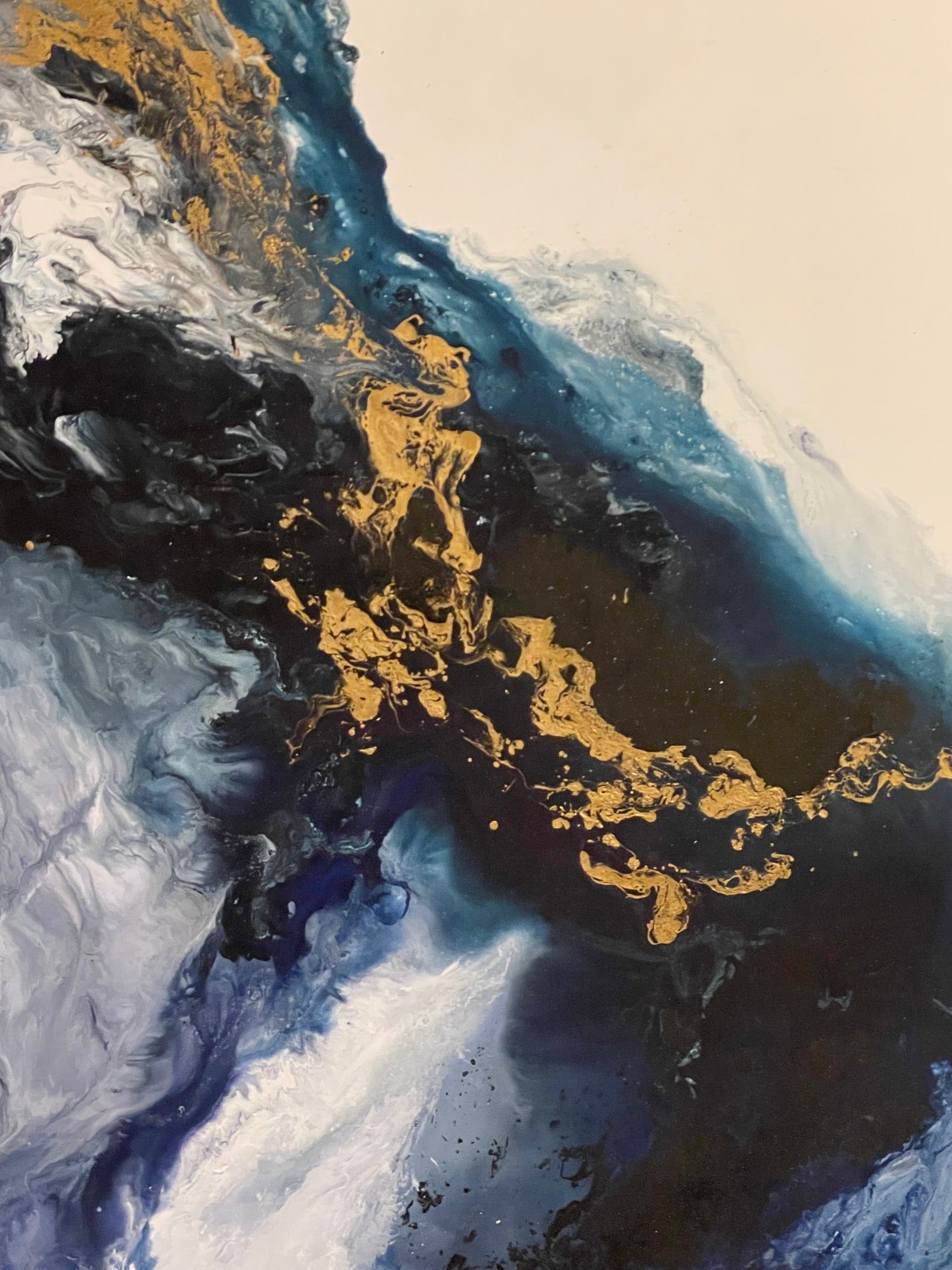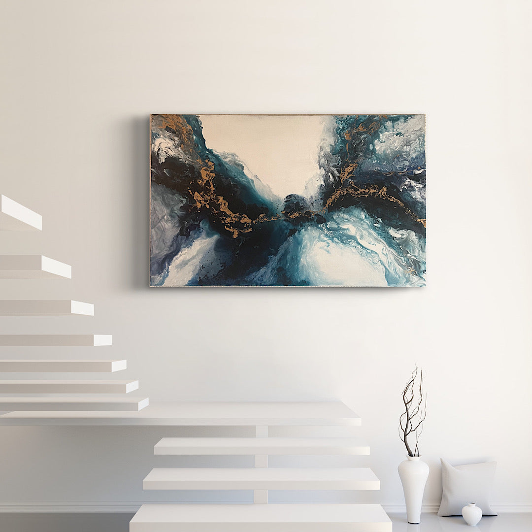 Fuerza Abisal es una pieza en la que los tonos azules se funden con destellos dorados como grietas de energía contenida que emerge desde lo más profundo. Es ideal para espacios modernos y minimalistas, esta obra trasformará el ambiente con su presencia magnética y envolvente. Es una invitación a contemplar lo invisible, a sentir la inmensidad del silencio y el movimiento.