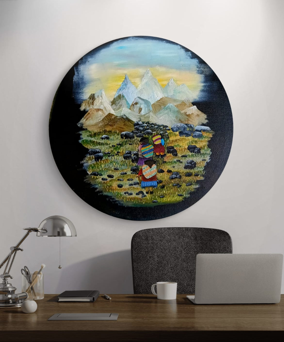 En un bastidor circular que evoca el ciclo de la vida y la conexión eterna con la tierra, un grupo de cholitas escaladoras asciende hacia la cima de una montaña imponente. Sus trajes tradicionales que figuran con polleras coloridas y sombreros de bombín, contrastan con la dureza de la roca y el frío del aire andino, fusionando fuerza ancestral y desafío contemporáneo. Cada paso es un acto de resistencia y orgullo cultural: una metáfora del empoderamiento femenino que, desde las raíces, se proyecta hacia las alturas.