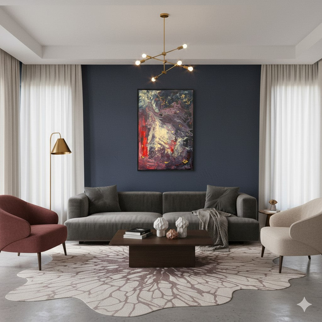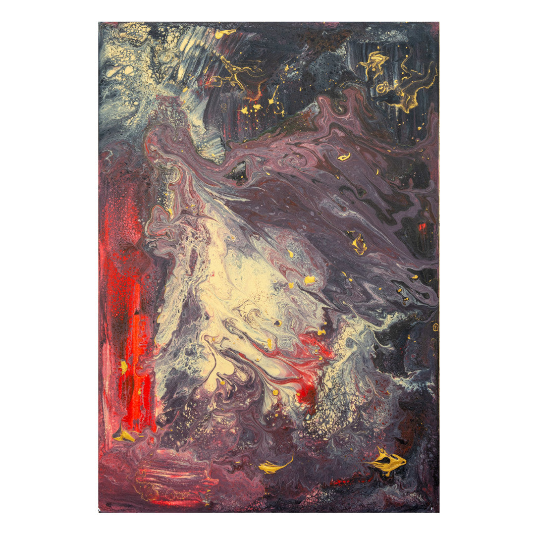 Aquí, el lienzo resuena con una profunda vibración. Las masas oscuras, casi lila y negro, forman un telón de fondo de misterio, de un espacio donde las formas etéreas se manifiestan. El rojo intenso que asciende desde la izquierda es una fuerza primaria, una pasión que irrumpe, un sonido grave que se eleva. En el centro, la explosión de crema y amarillo es un rayo de luz, una revelación espiritual que se abre paso a través de la oscuridad. Los destellos dorados son notas musicales, puntos de energía que flotan y danzan, estableciendo un ritmo, una melodía interna que guía al ojo a través de este ballet de colores y formas, hacia una experiencia de la abstracción pura.