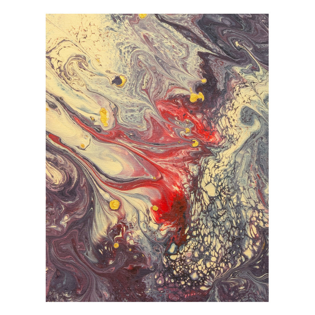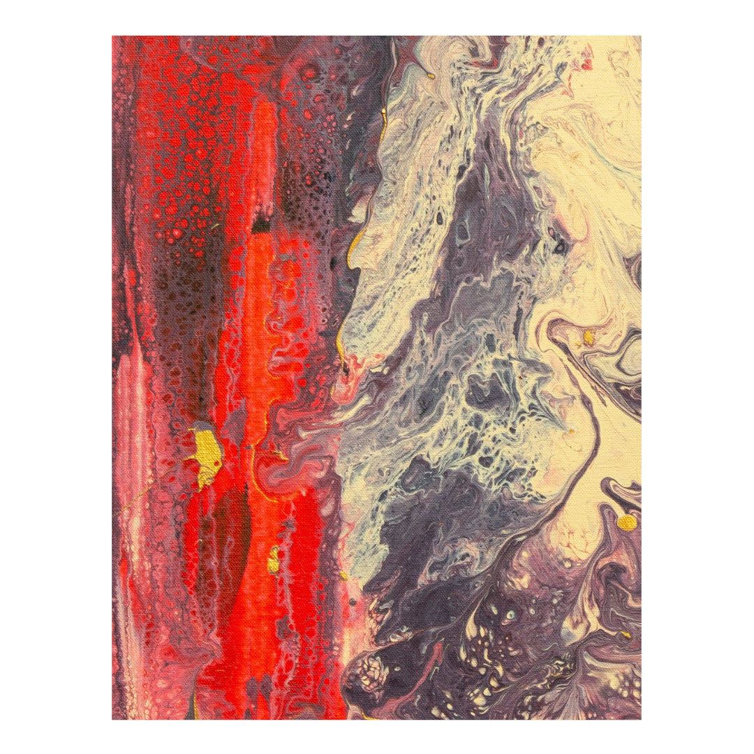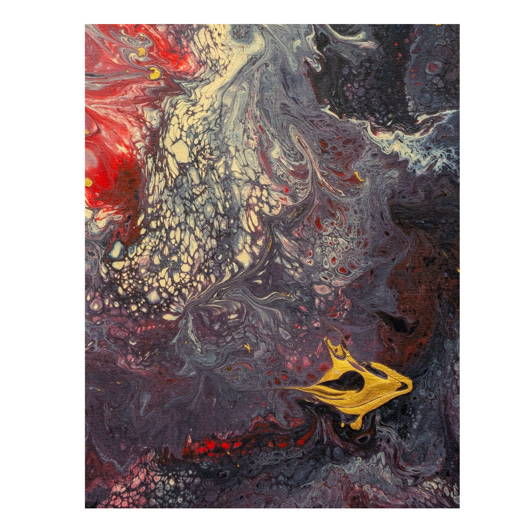 Abstract art on a cotton canvas frame using brushstrokes and Dutch pouring techniques.