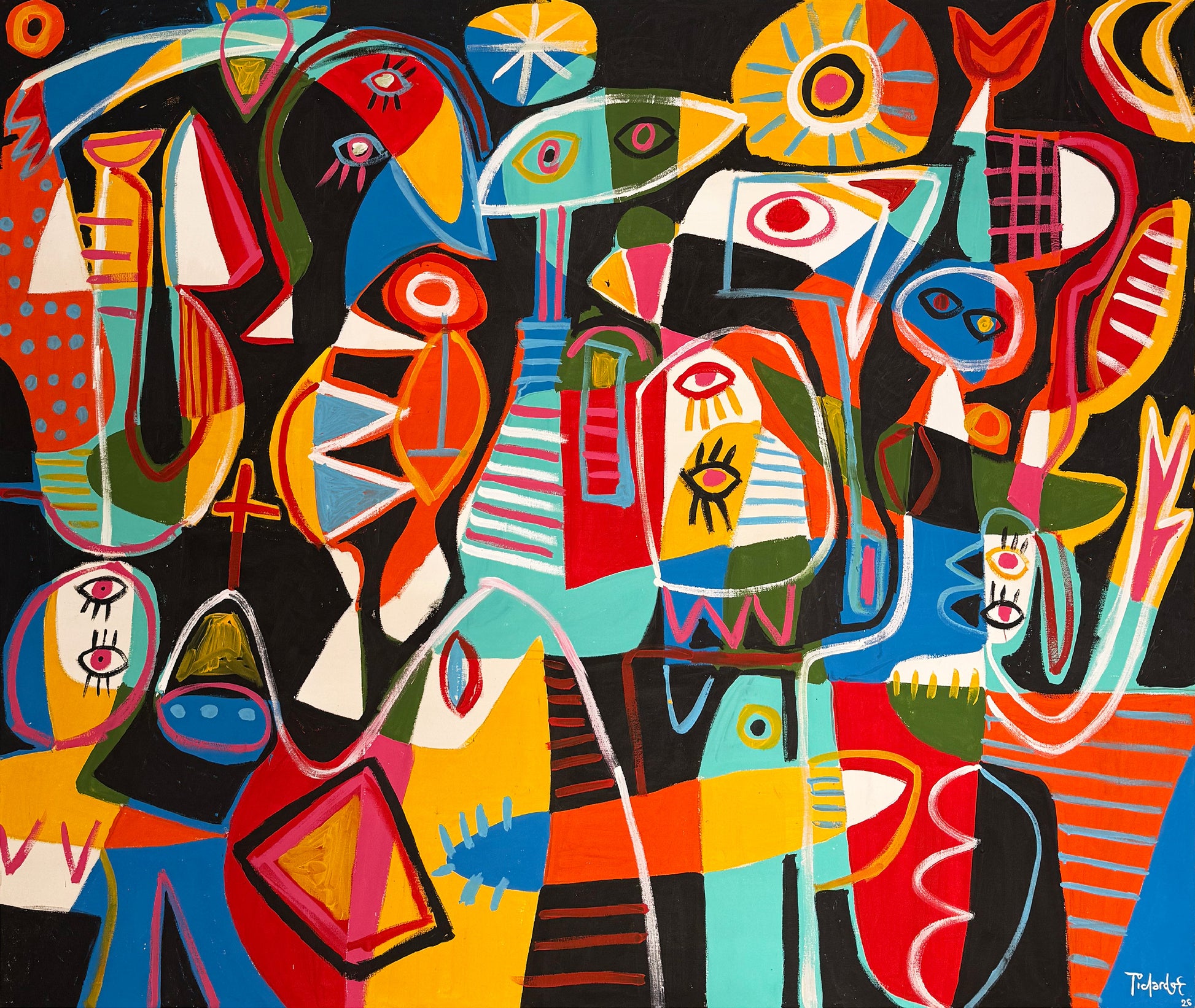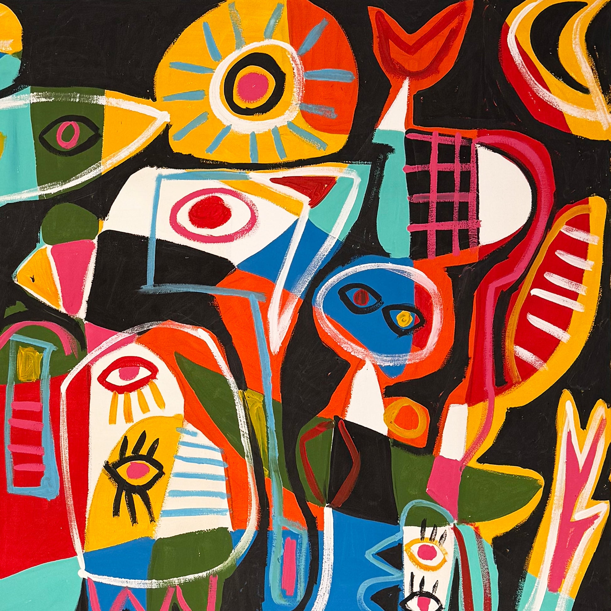 La escena se construye a partir de formas orgánicas y figuras abstractas que recuerdan cuerpos, rostros y objetos esquematizados. Ojos, perfiles y siluetas aparecen distribuidos a lo largo del plano, conectados por líneas curvas y trazos continuos. Además, la ausencia de un punto focal único genera una lectura múltiple y simultánea. Esta composición abierta refuerza una sensación de movimiento constante y expansión visual.