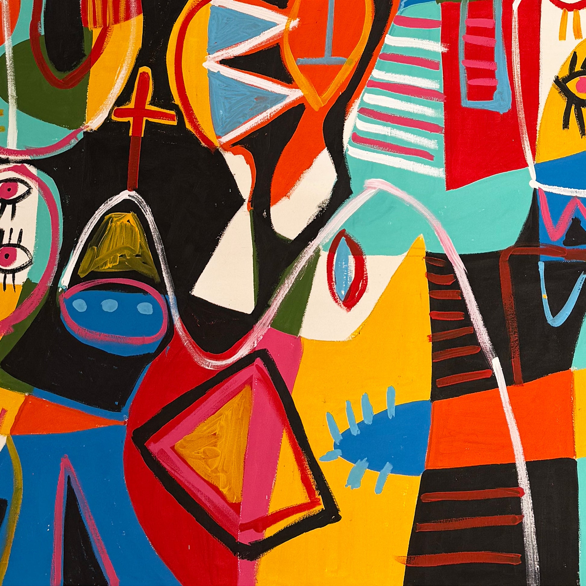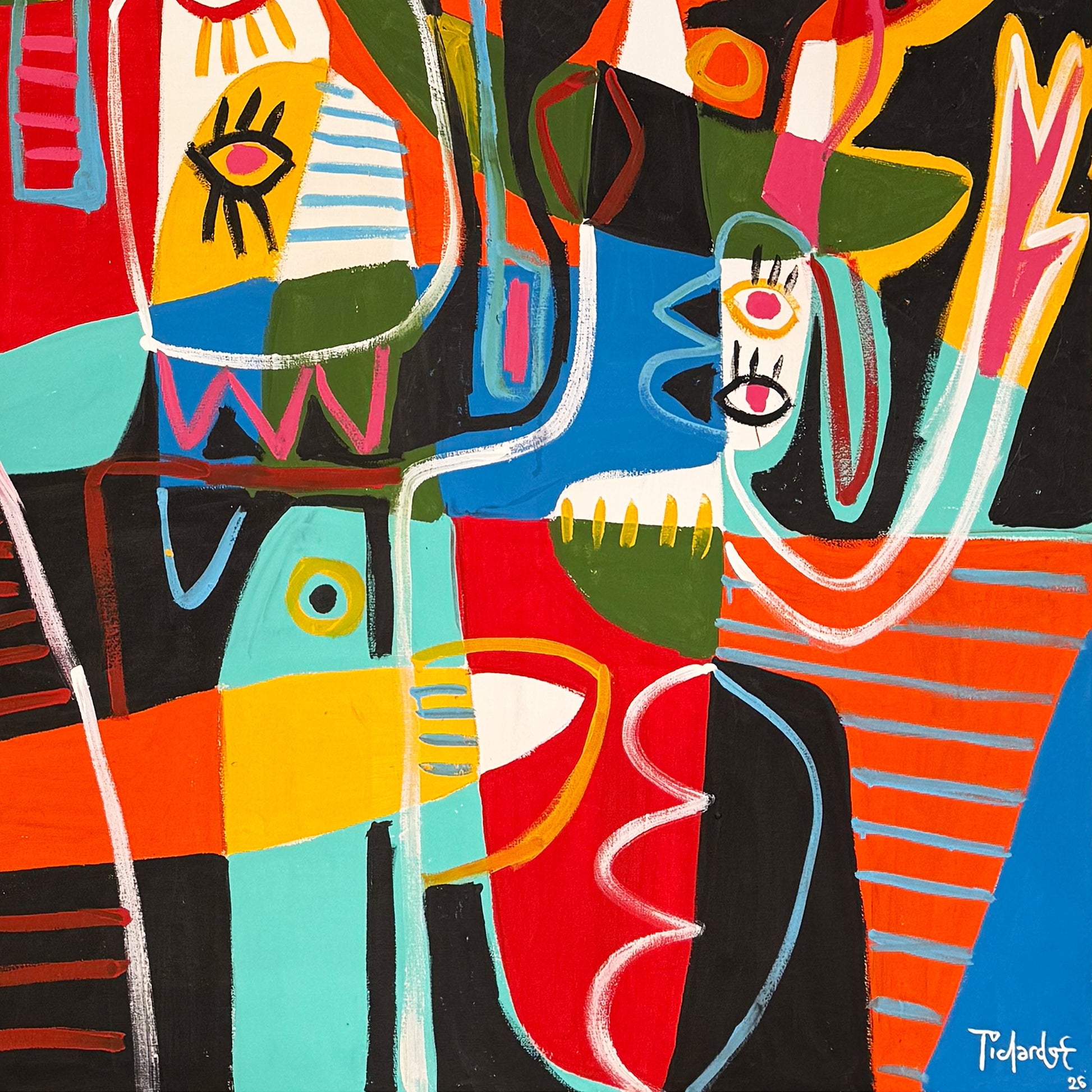 La pintura se sitúa en un punto intermedio entre la abstracción contemporánea y la figuración libre. Las figuras no buscan una representación realista, sino una síntesis gráfica basada en el gesto y el color. En este sentido, la obra dialoga con la energía visual de Jean-Michel Basquiat y el simbolismo cromático de Paul Klee, aunque mantiene una identidad propia marcada por el juego formal.