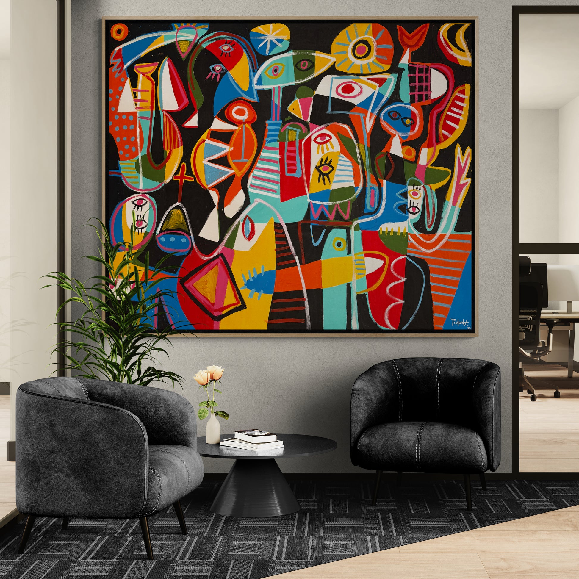 En el contexto del arte contemporáneo, Funky business se presenta como una obra de gran formato que atrae a coleccionistas interesados en la pintura expresiva, la composición libre y el lenguaje visual vibrante. Su escala, intensidad cromática y riqueza formal la convierten en una pieza capaz de transformar cualquier espacio expositivo.