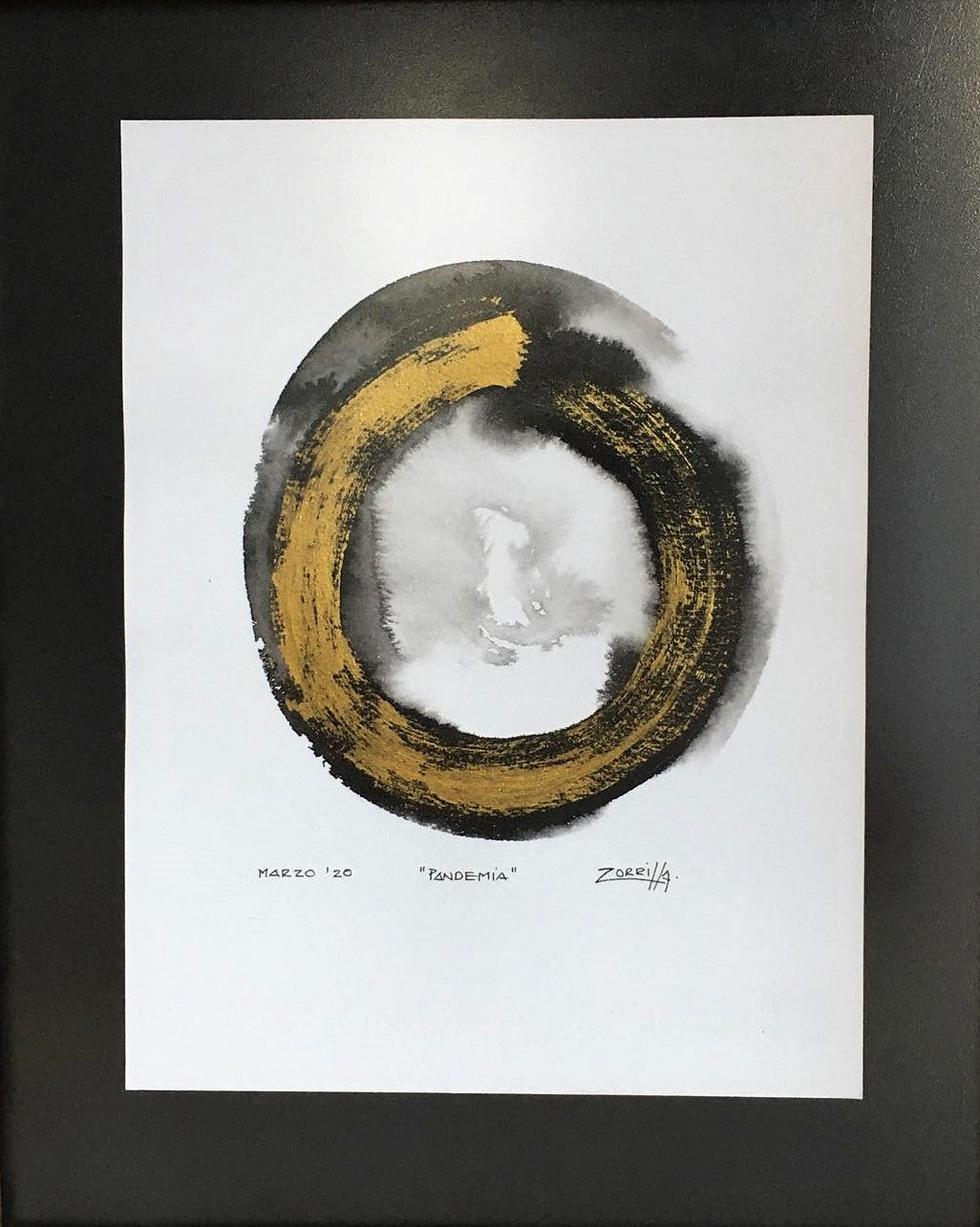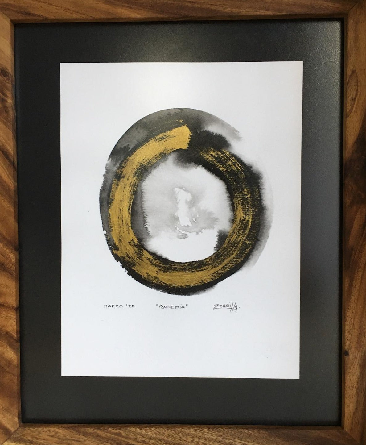 Esta obra está realizada con tinta china sobre papel algodón y pintura acrílica color dorado. Su concepto tiene el origen en la caligrafía japonesa y simboliza la fuerza, la iluminación, la elegancia, el universo y el vacío. Es de estilo minimalista y combina perfecto con cualquier espacio. La obra se encuentra enmarcada con una marialuisa en color negro y tiene un marco de madera natural de parota y cristal antirreflejante.