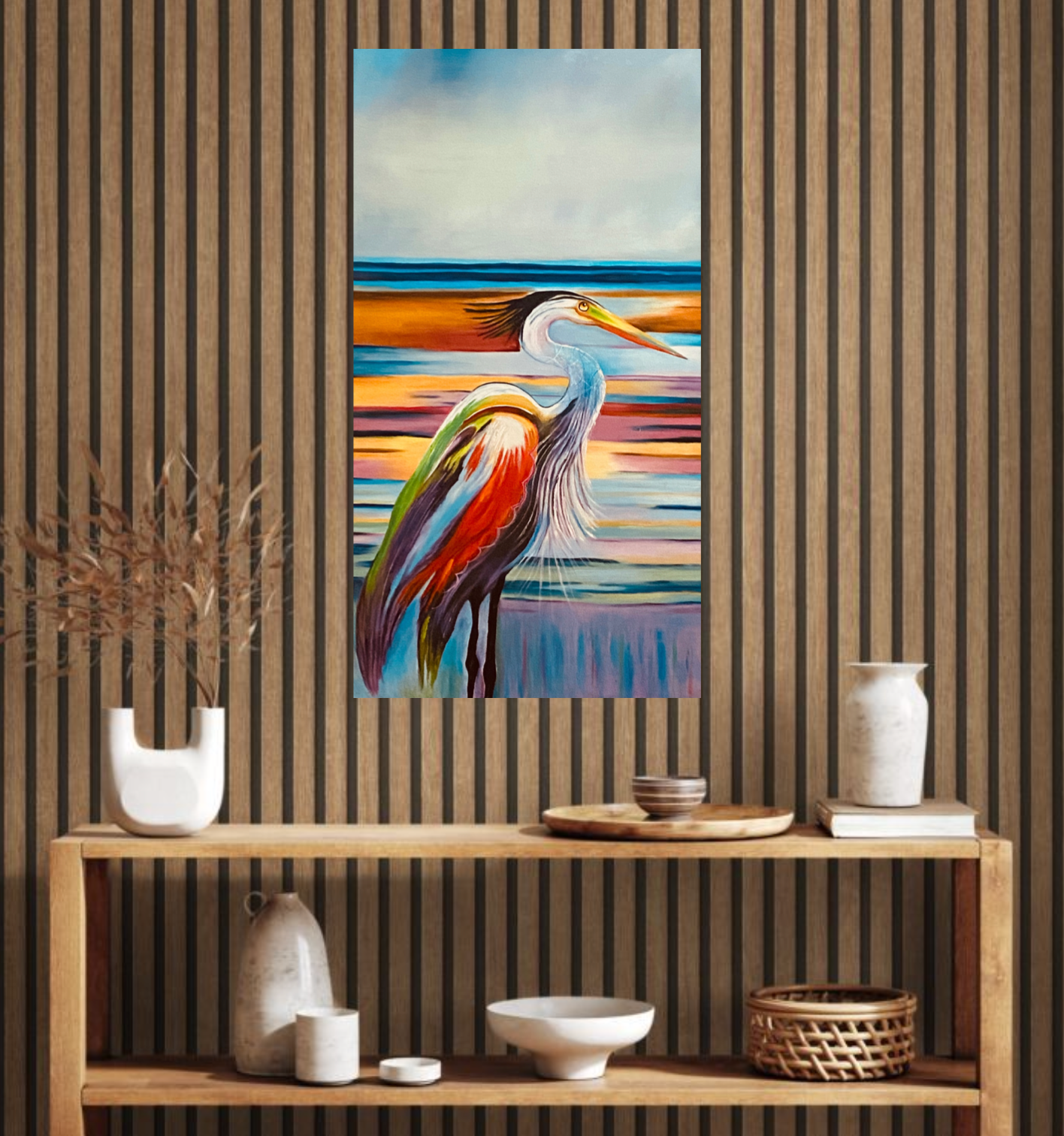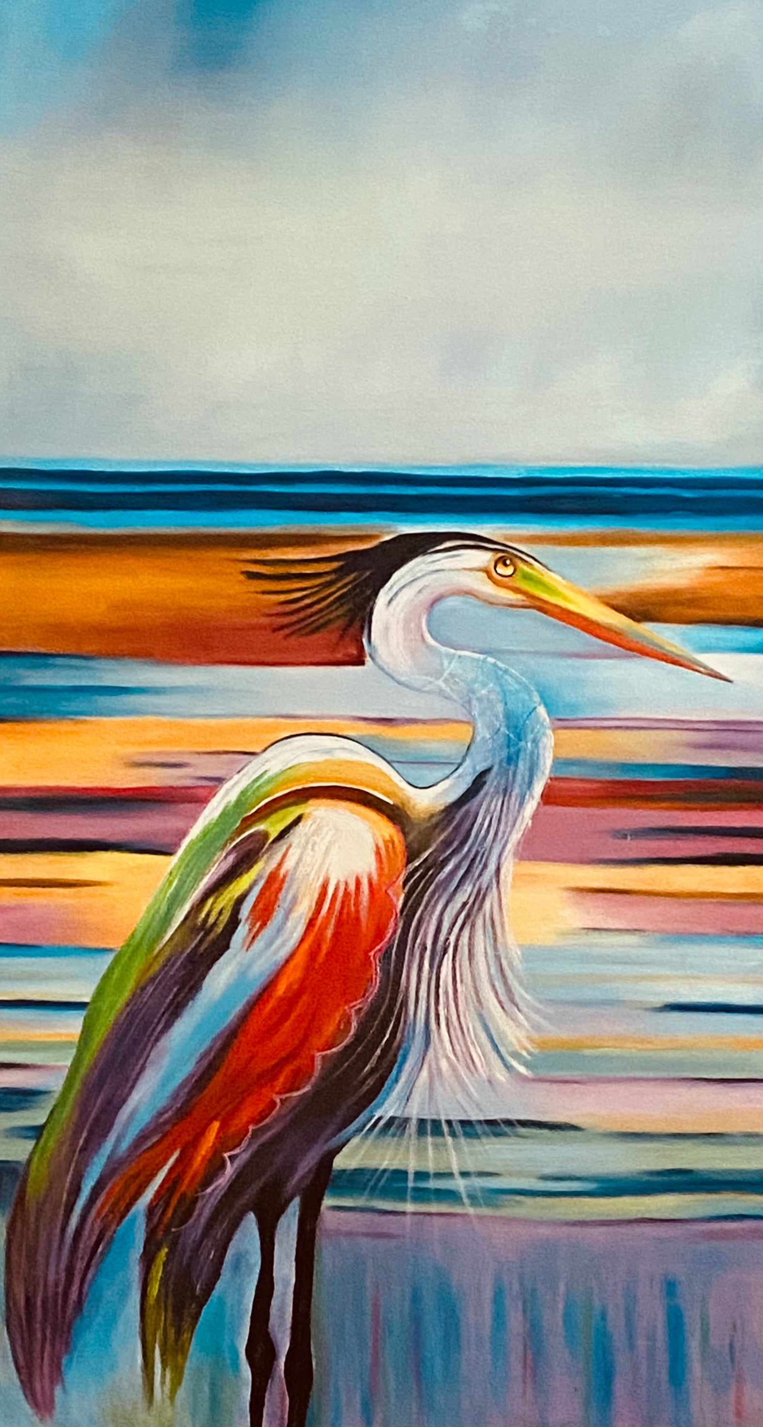 Esta obra representa la majestuosidad de las garzas blancas con un toque de color en su plumaje y el fondo observando al horizonte. Este animal siempre se encuentra presente en diversos lugares que he visitado de la República Mexicana en todas las orillas de pantanos, lagunas, lagos y estuarios mostrando su belleza. De la serie "Sentimientos". Año 2024