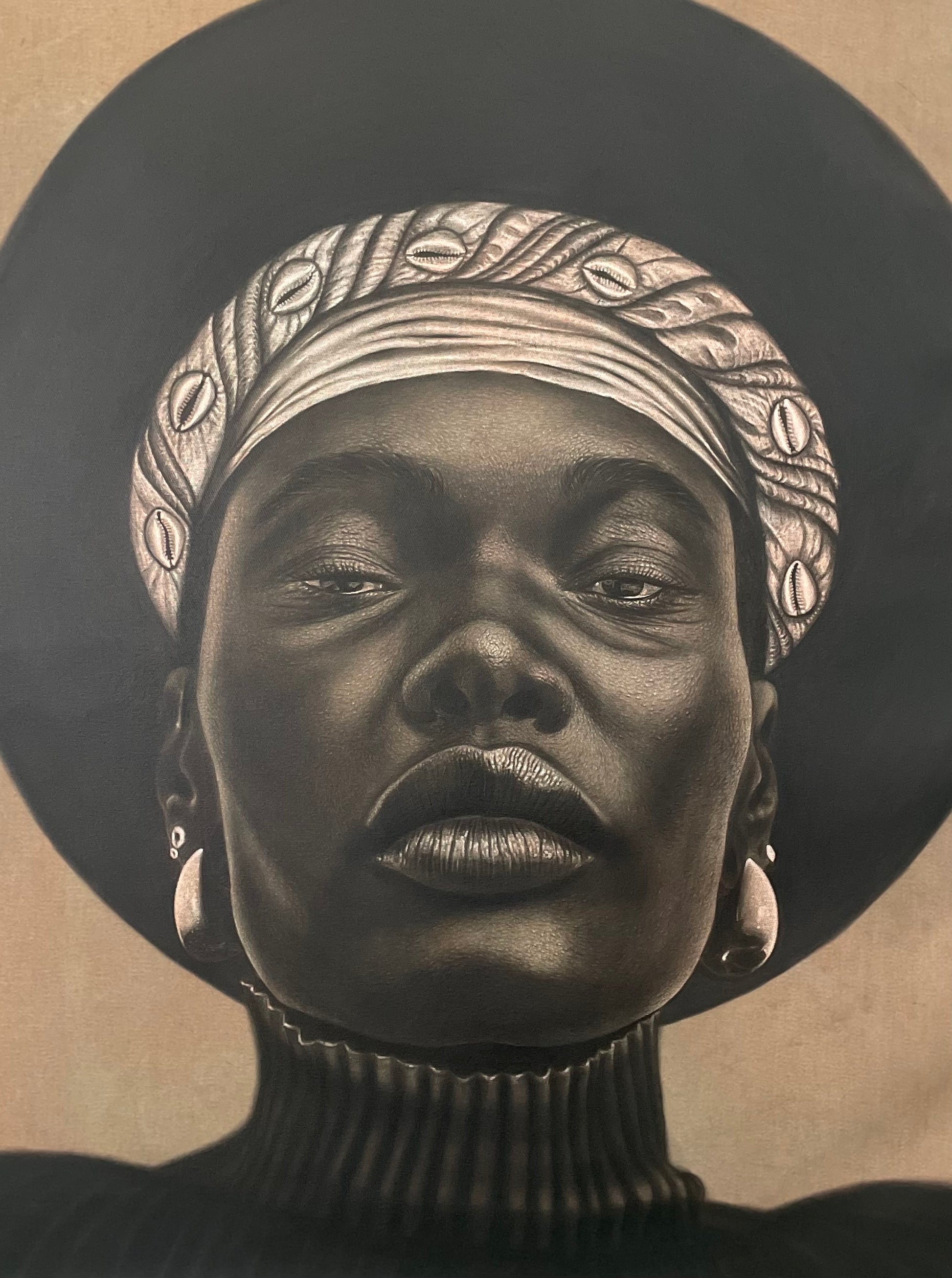 Esta pieza hace una mezcla entre moda y tradición, donde la imagen de una Influencer de la moda porta un gele (turbante tradicional) con los llamados dilogun (caracoles usados como oráculo en la religión africana) aludiendo al sincretismo social y religioso.