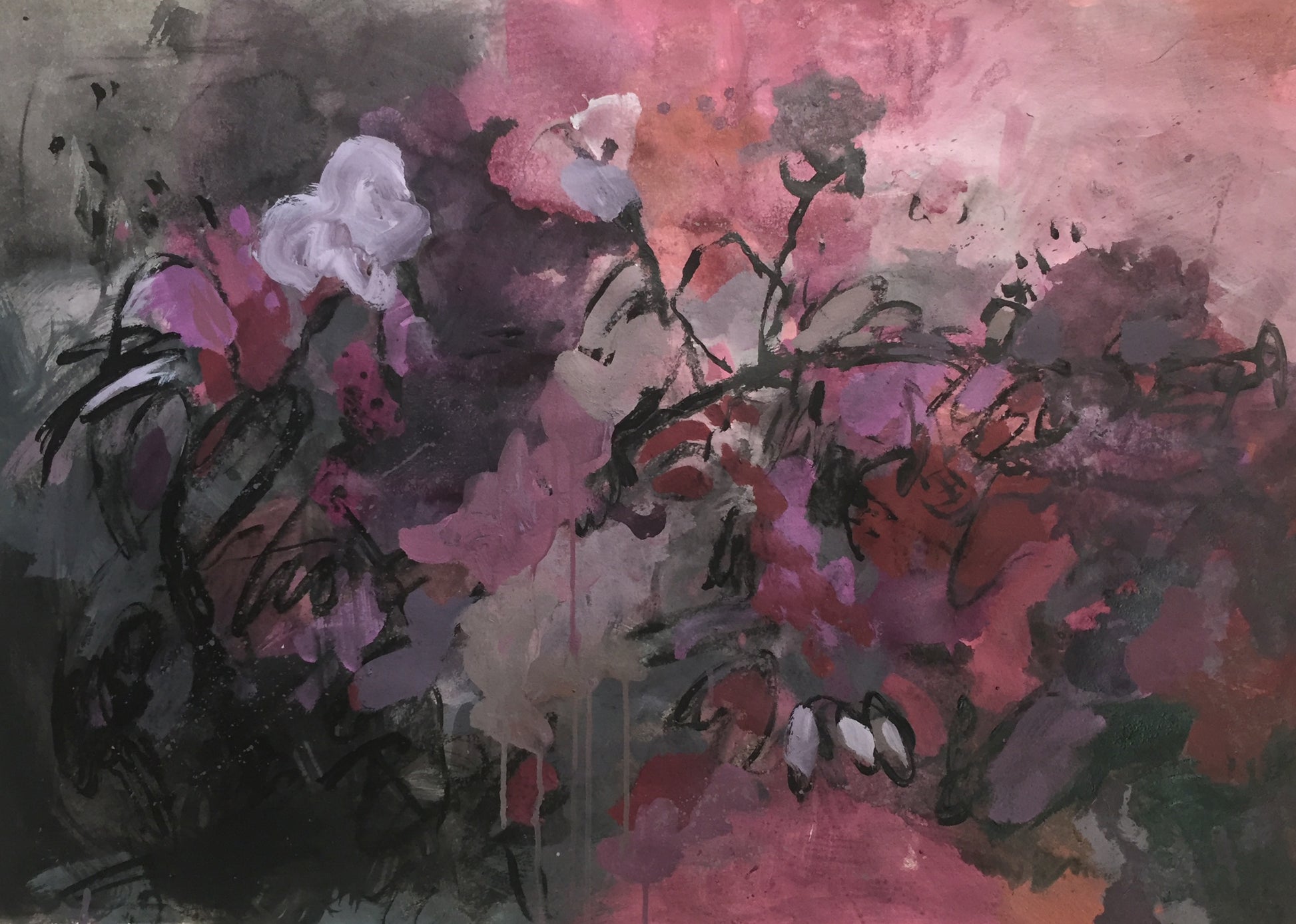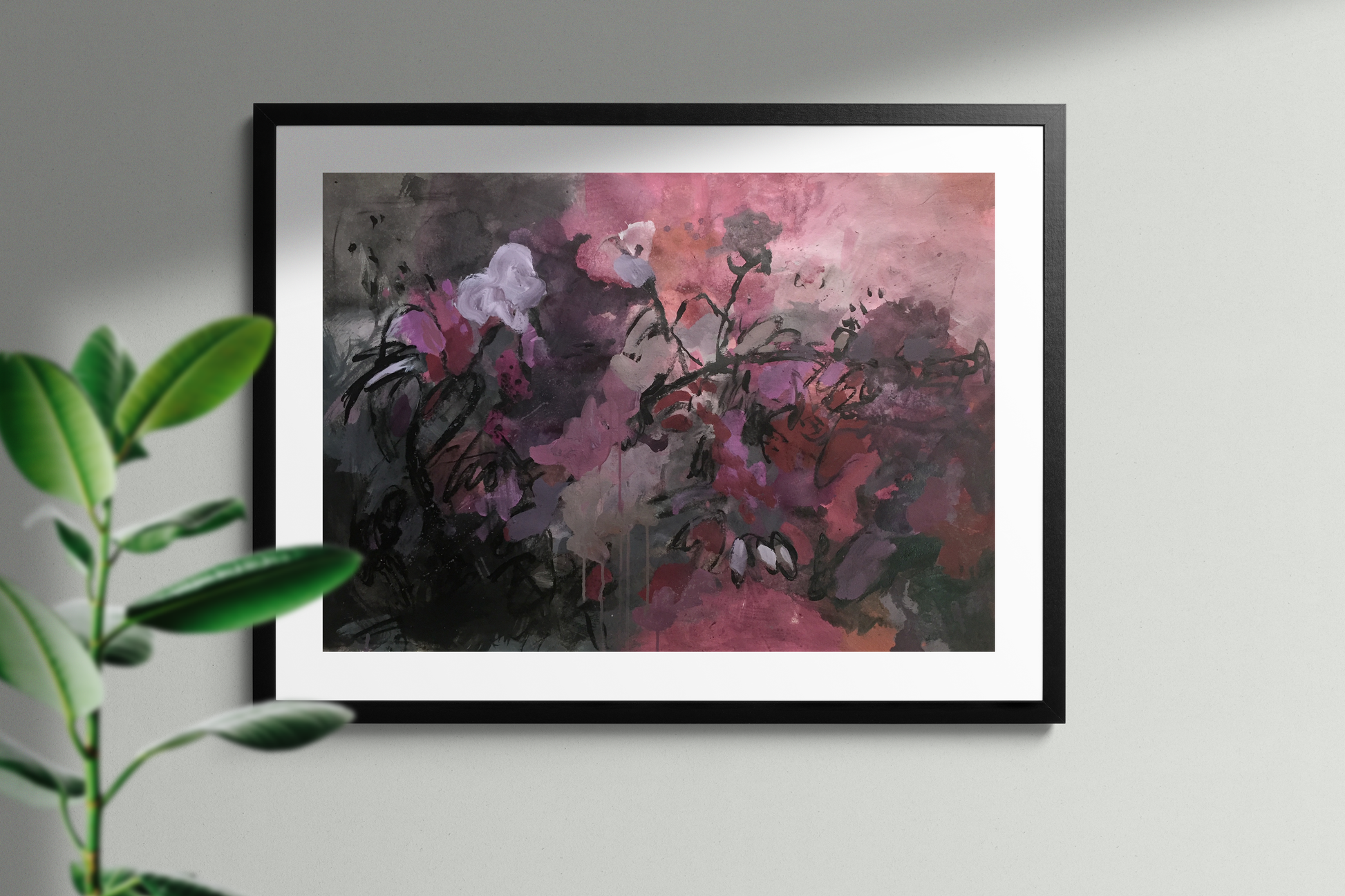 Un entramado de flores se despliega en un ritmo denso y profundo. La pintura transmite la sensación de un jardín crepuscular, donde la luz y la sombra conviven para revelar su intensidad.