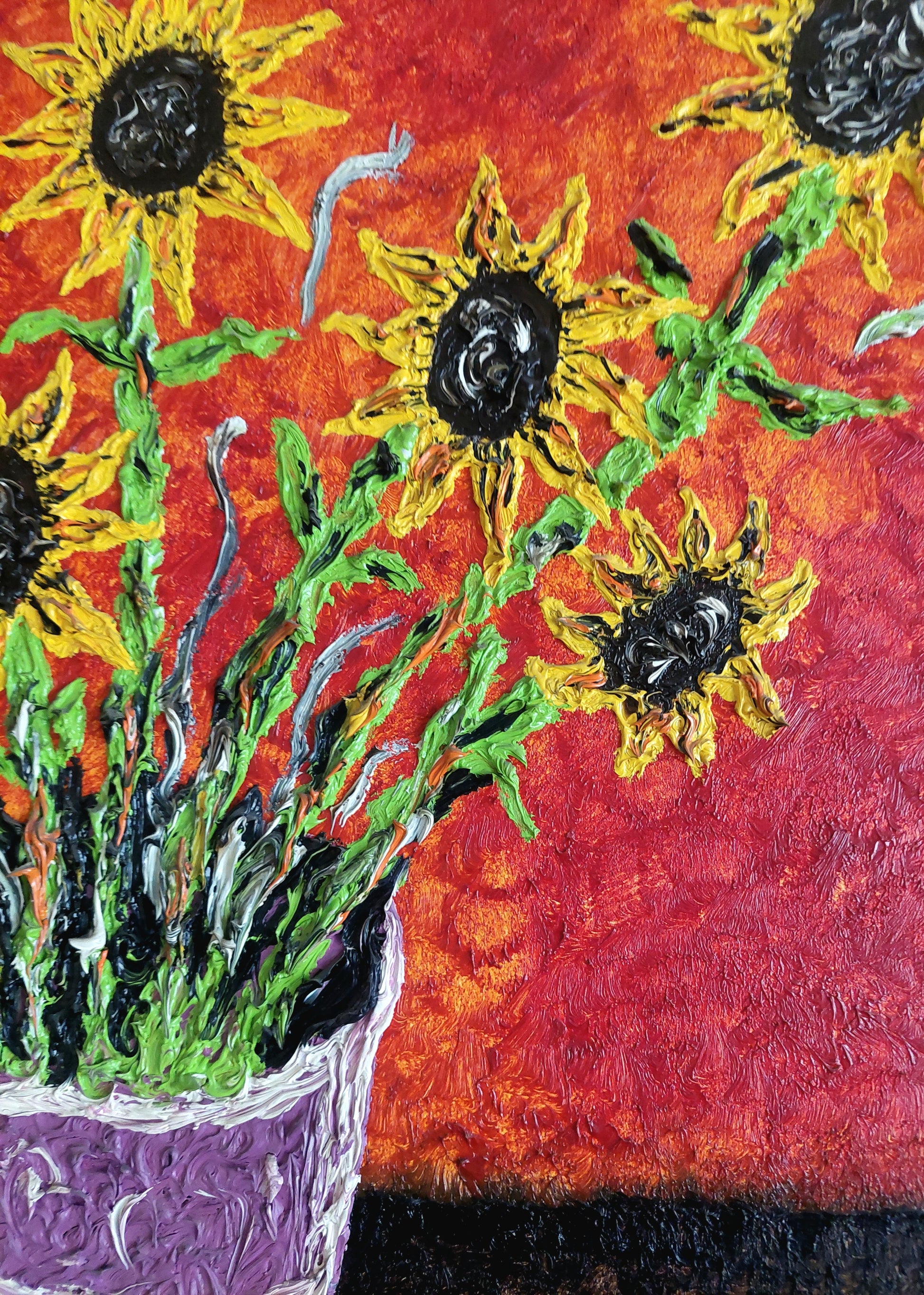 Esta obra vibrante y expresiva reinterpreta el clásico motivo de los girasoles con una energía cruda y textual. El uso del impasto genera un relieve casi escultórico, evocando la intensidad emocional de Van Gogh pero con un giro contemporáneo y audaz. La elección de un fondo rojo ardiente y una base obscura potencia el dramatismo, mientras que el jarrón púrpura rompe con la tradición, sugiriéndonoslas un diálogo entre lo orgánico y lo sintético. Aquí, la luz y el color no son representan, sino que gritan.