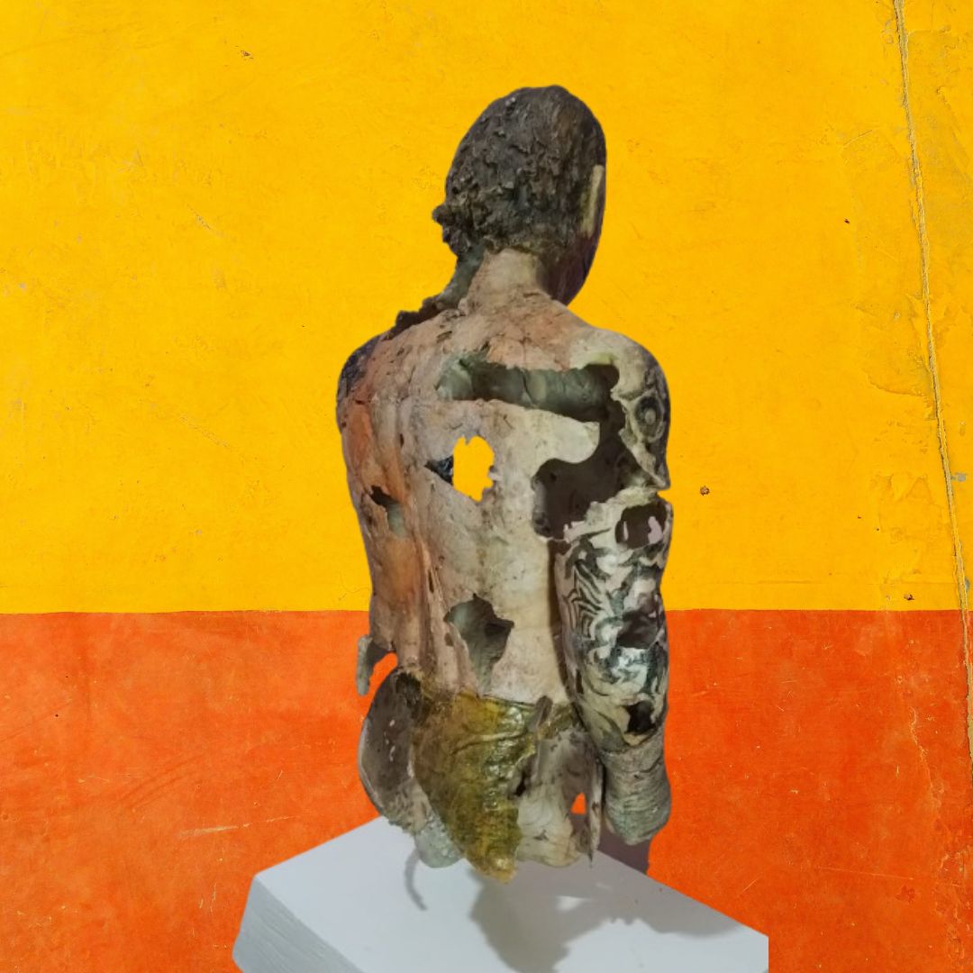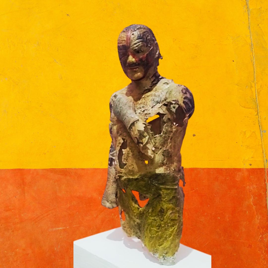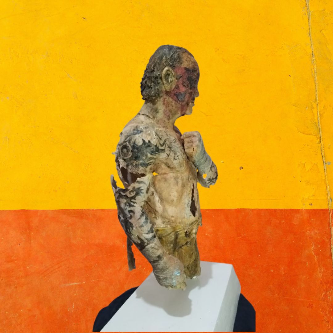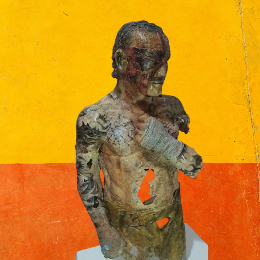 Imponente hombre en su forma más pura y visceral, este estilo roto representa la lucha interna y externa propia de todo guerrero, cada grieta, cada cicatriz refleja la dureza de esta batalla llamada vida y a la vez la vulnerabilidad del humano. su postura evoca su fuerza indomable y resiliencia.